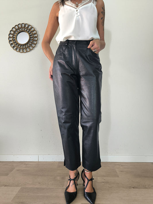 Pantalone vintage in vera pelle nera taglia S