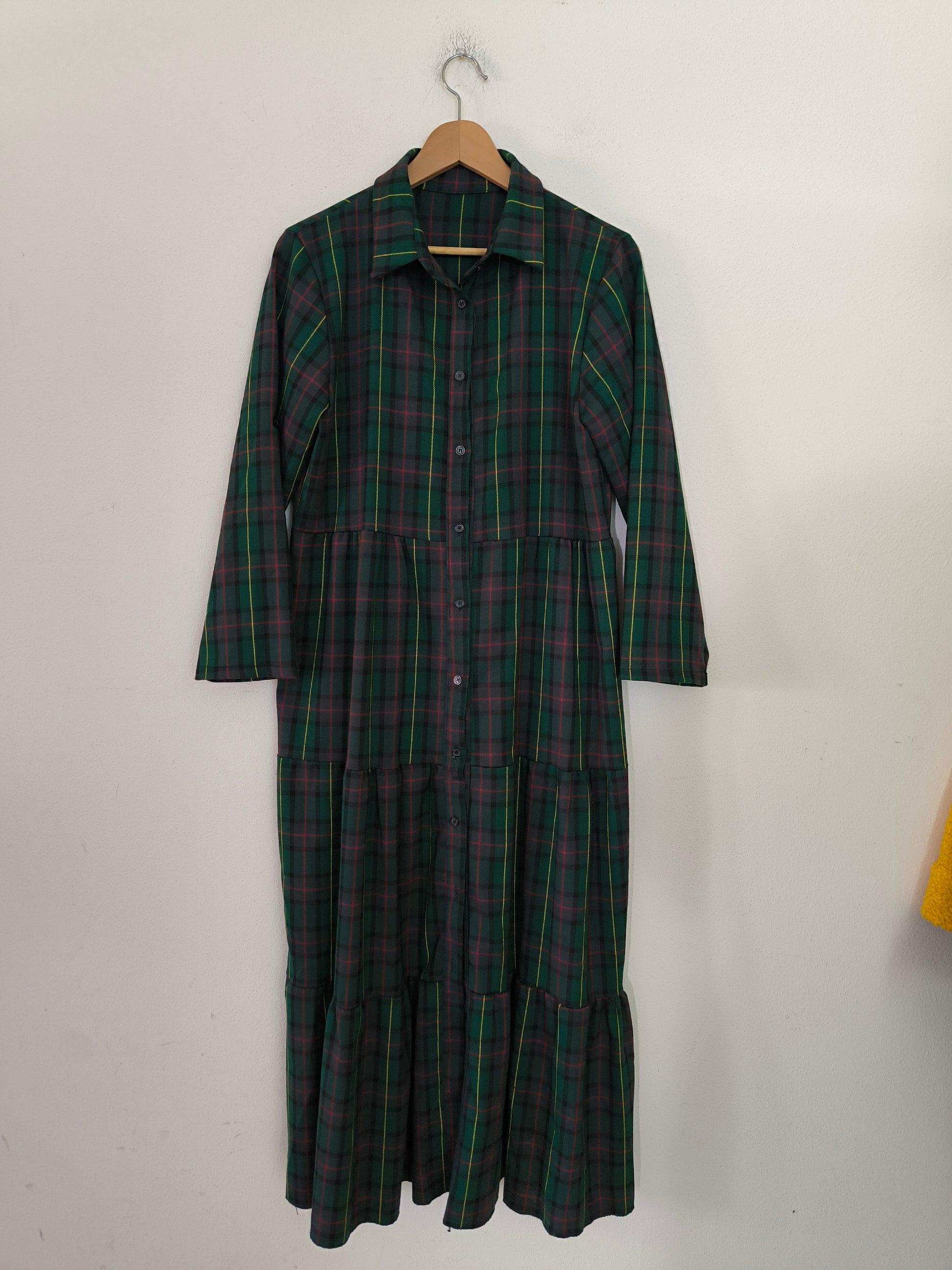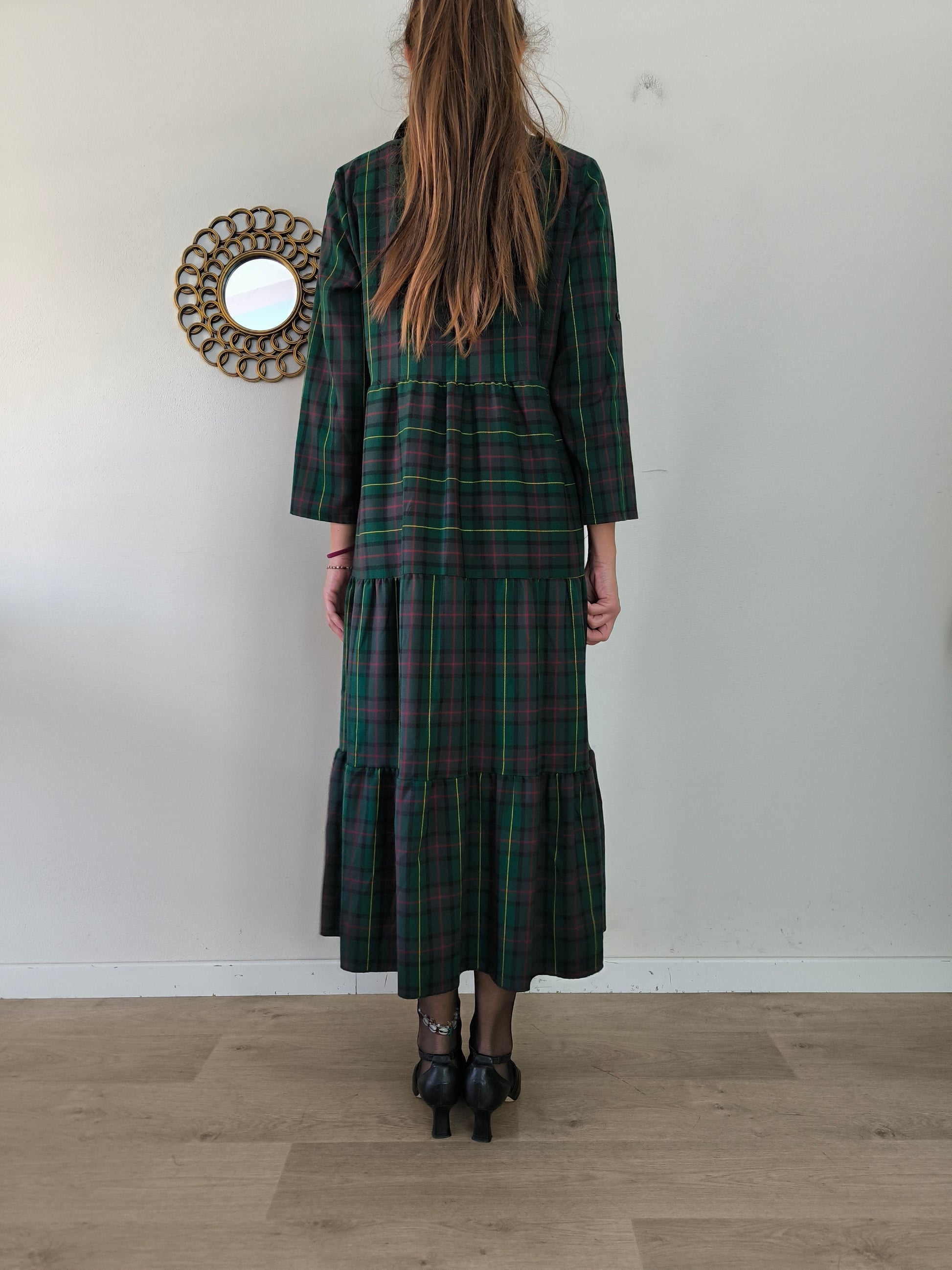 Abito chemisier, sartoriale, abbottonatura sul davanti, in caldocotone tartan verde, ampio, lavorato a balze.