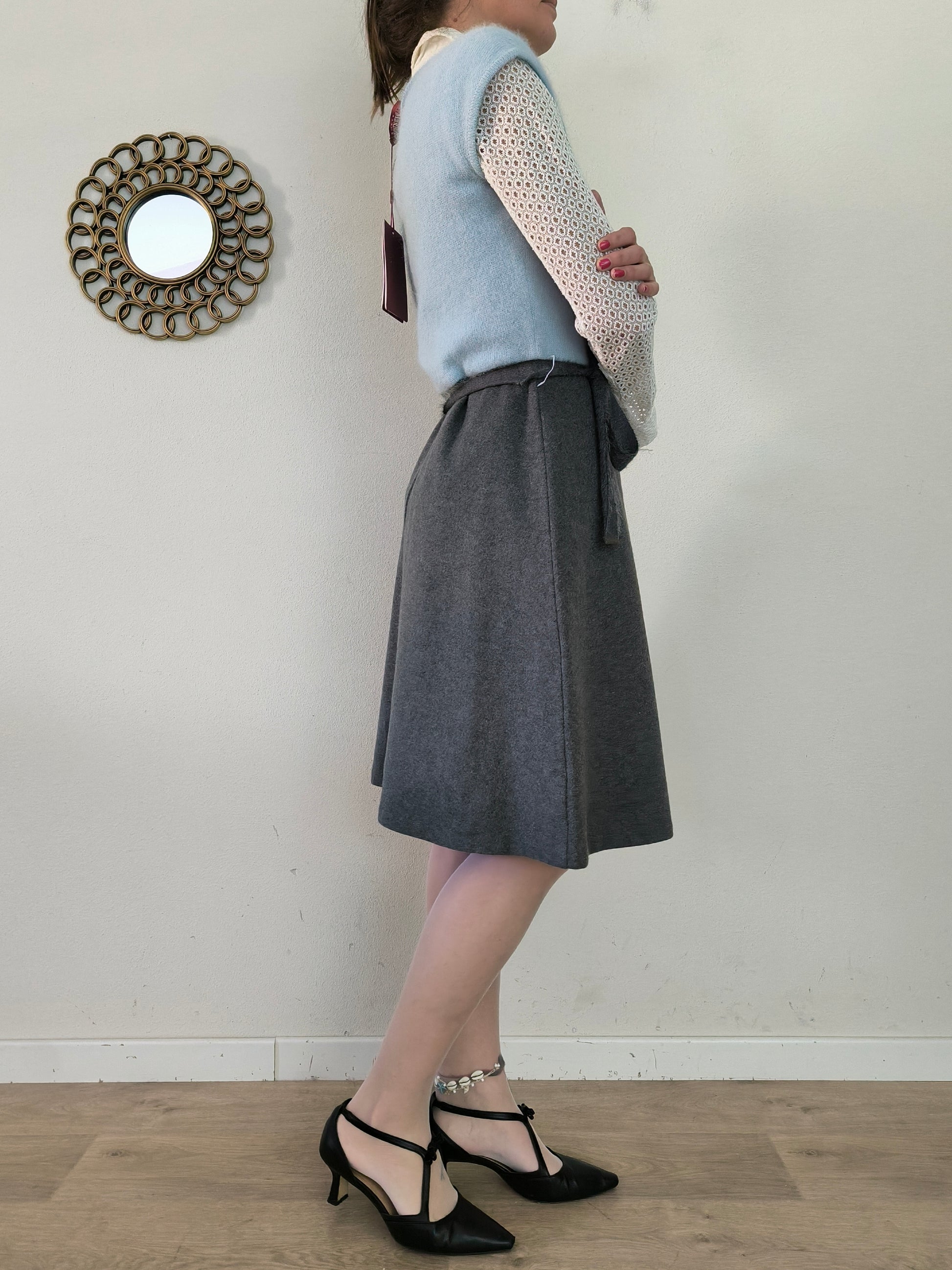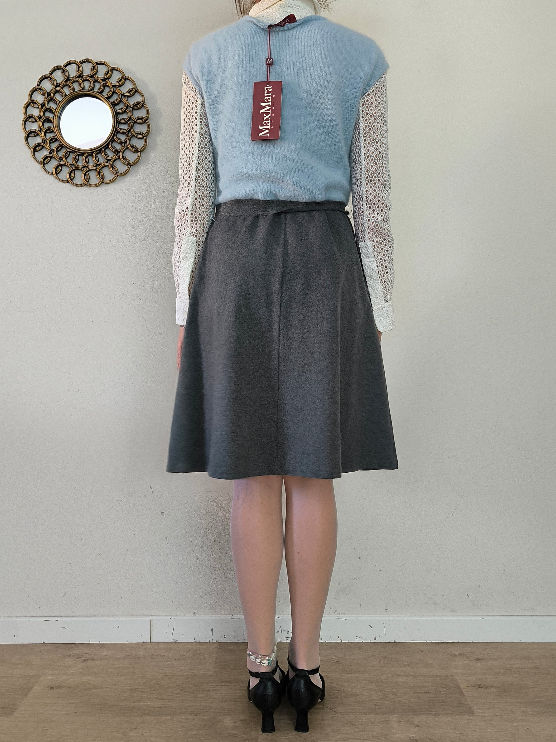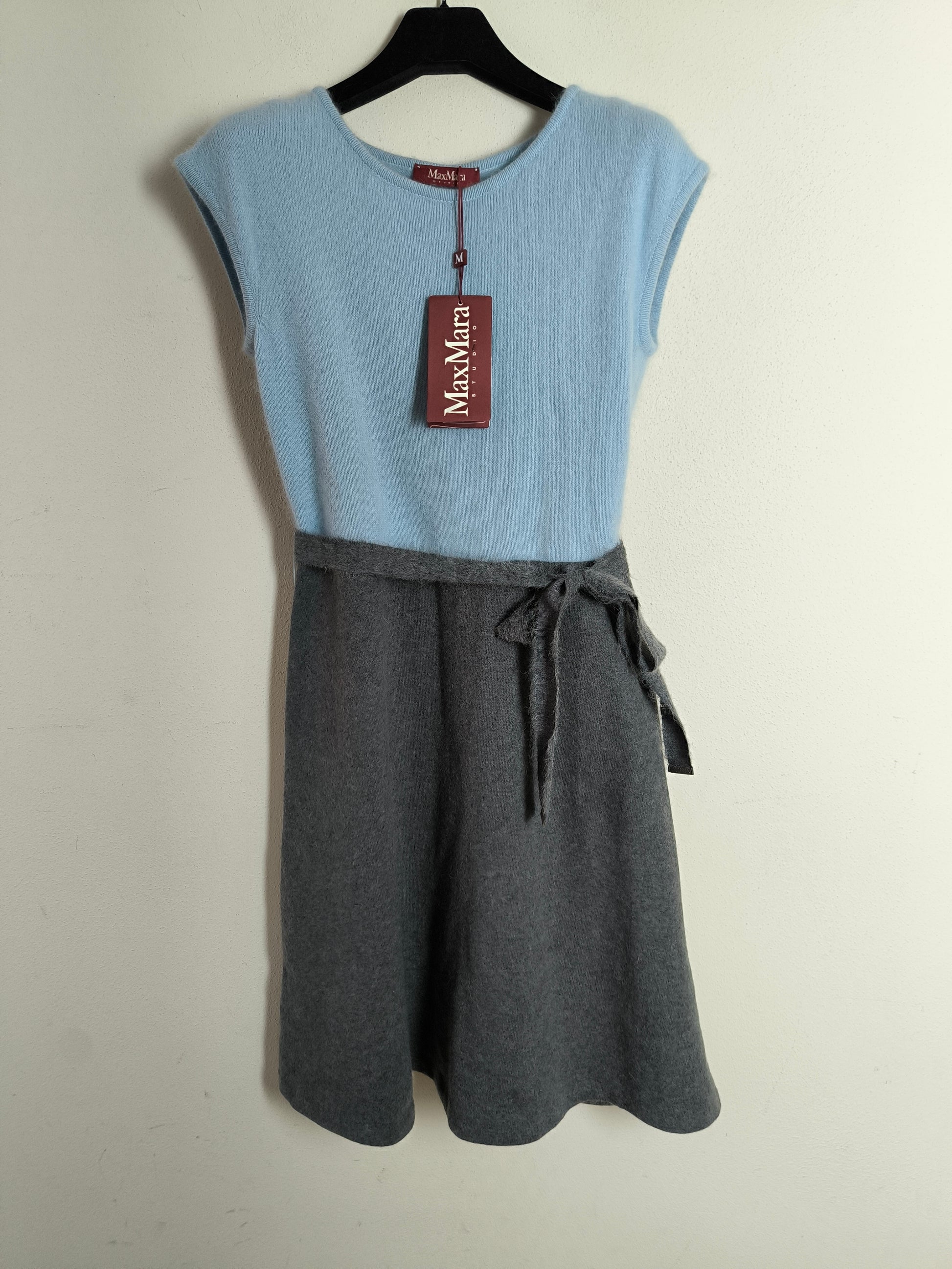 Abito Max Mara, mai indossato, ancora con cartellino, con corpino smanicato in angora azzurra e gonna grigia ampia e morbida.