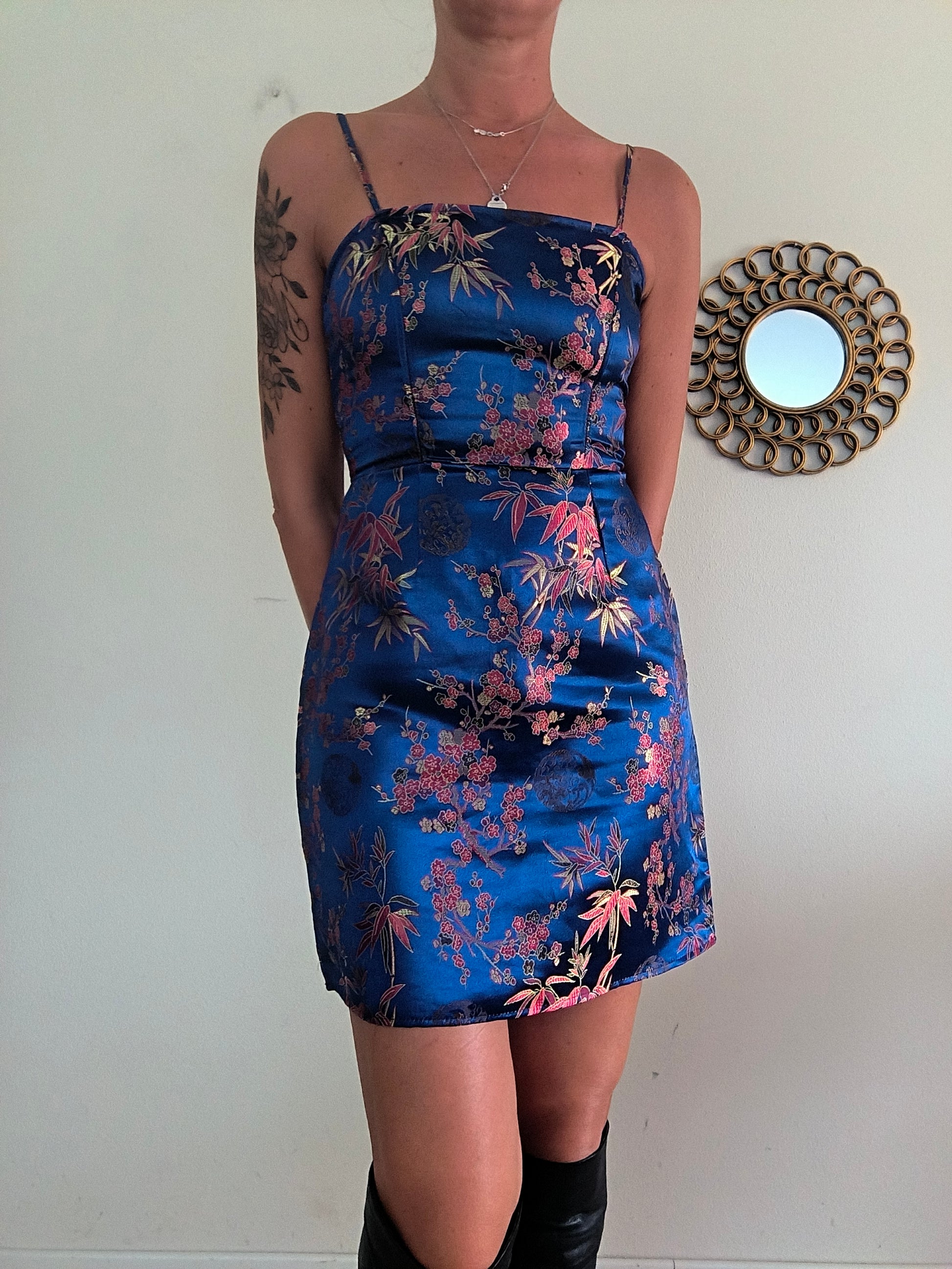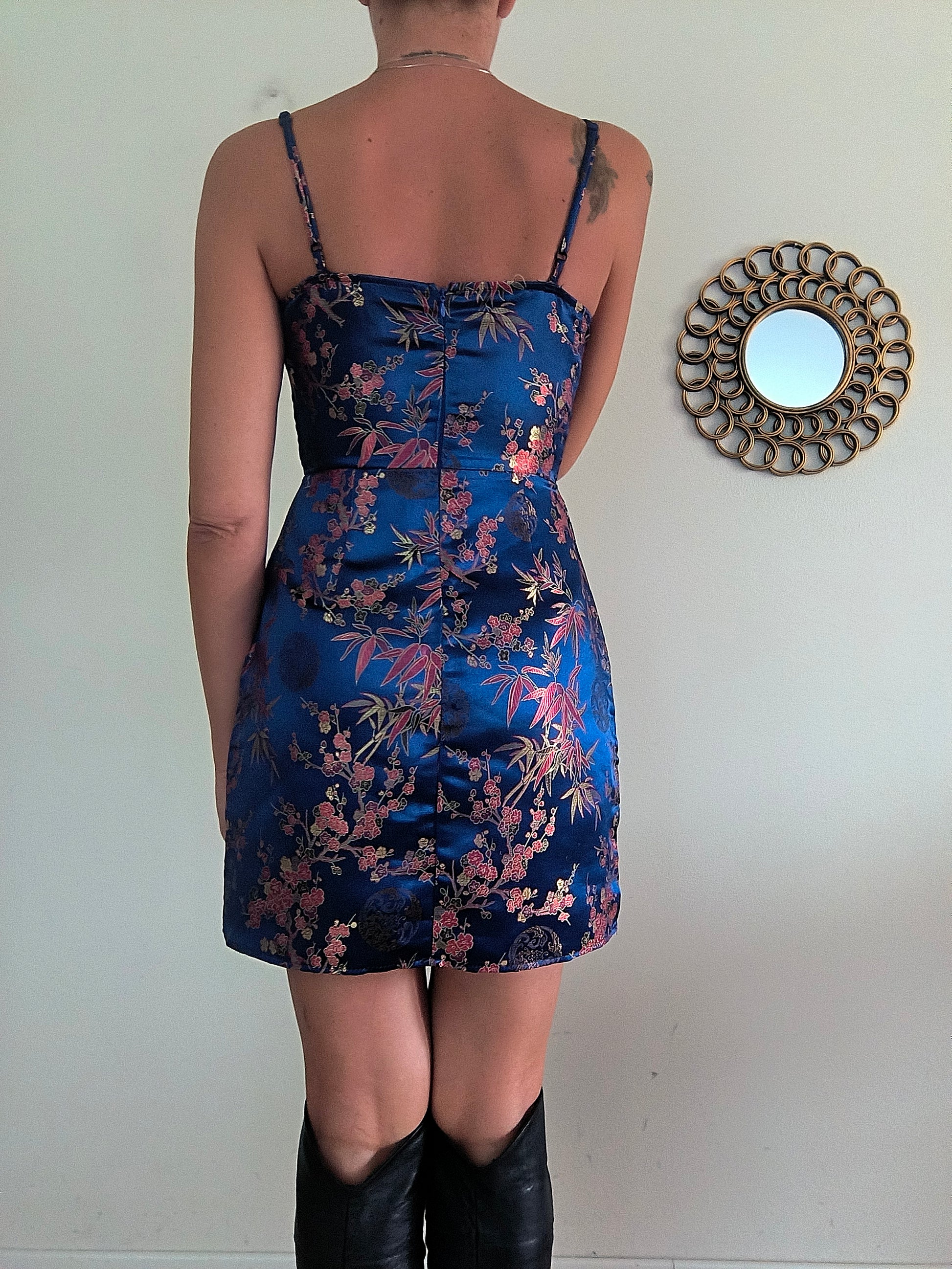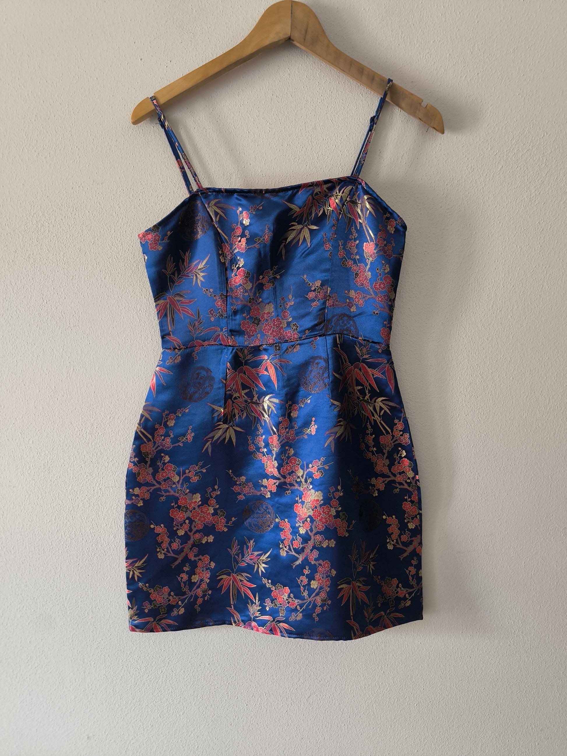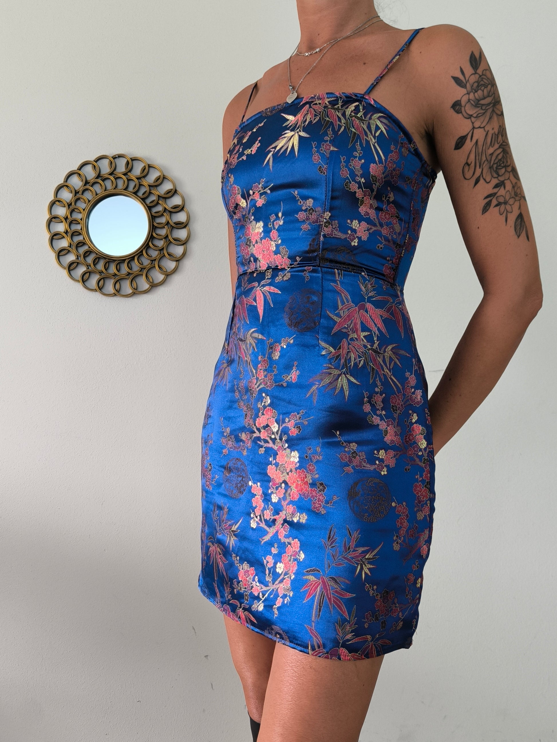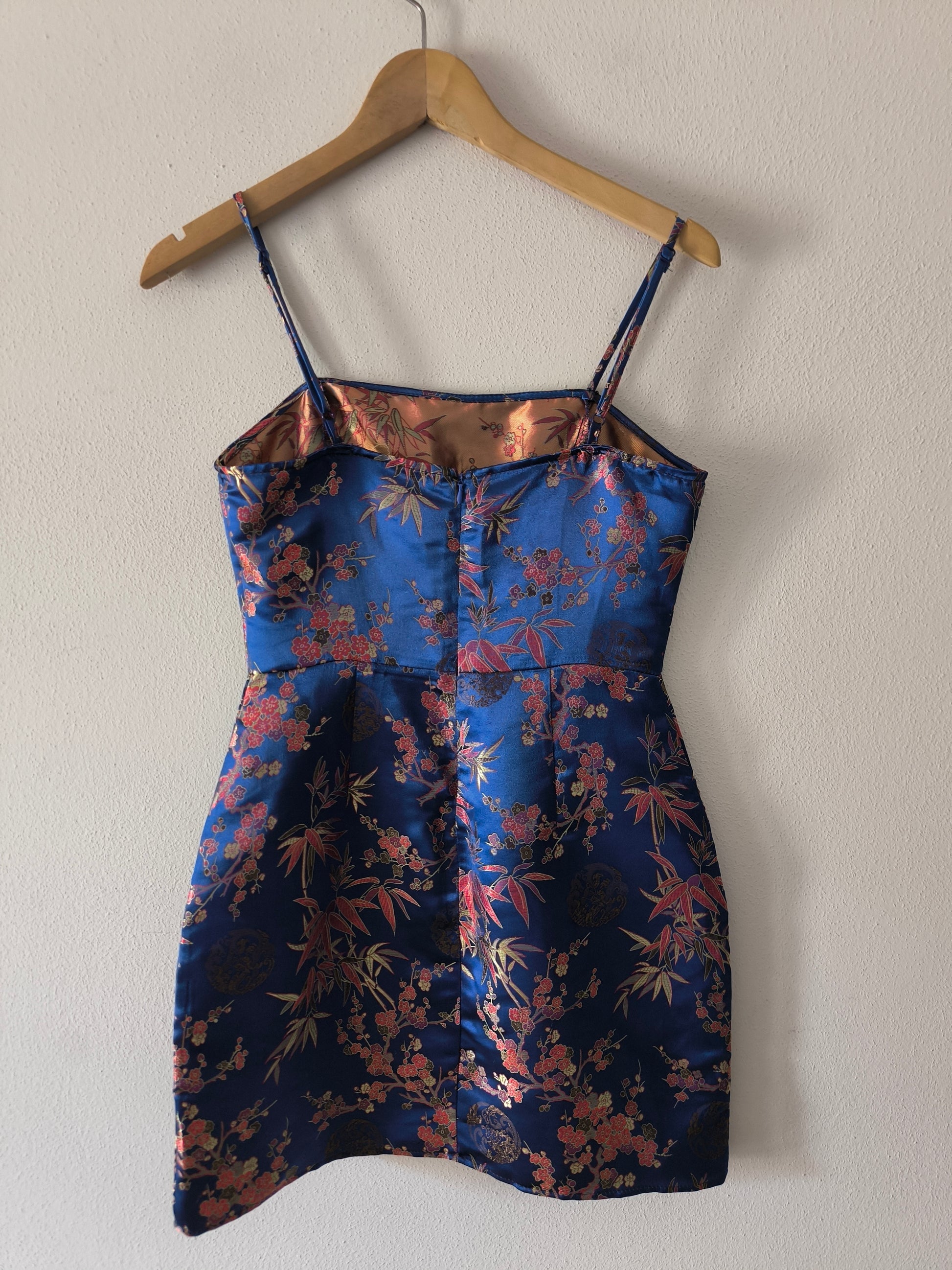 Abito quipao in tessuto Japan style blu elettrico. Zip sul retro e spallina sottile.
