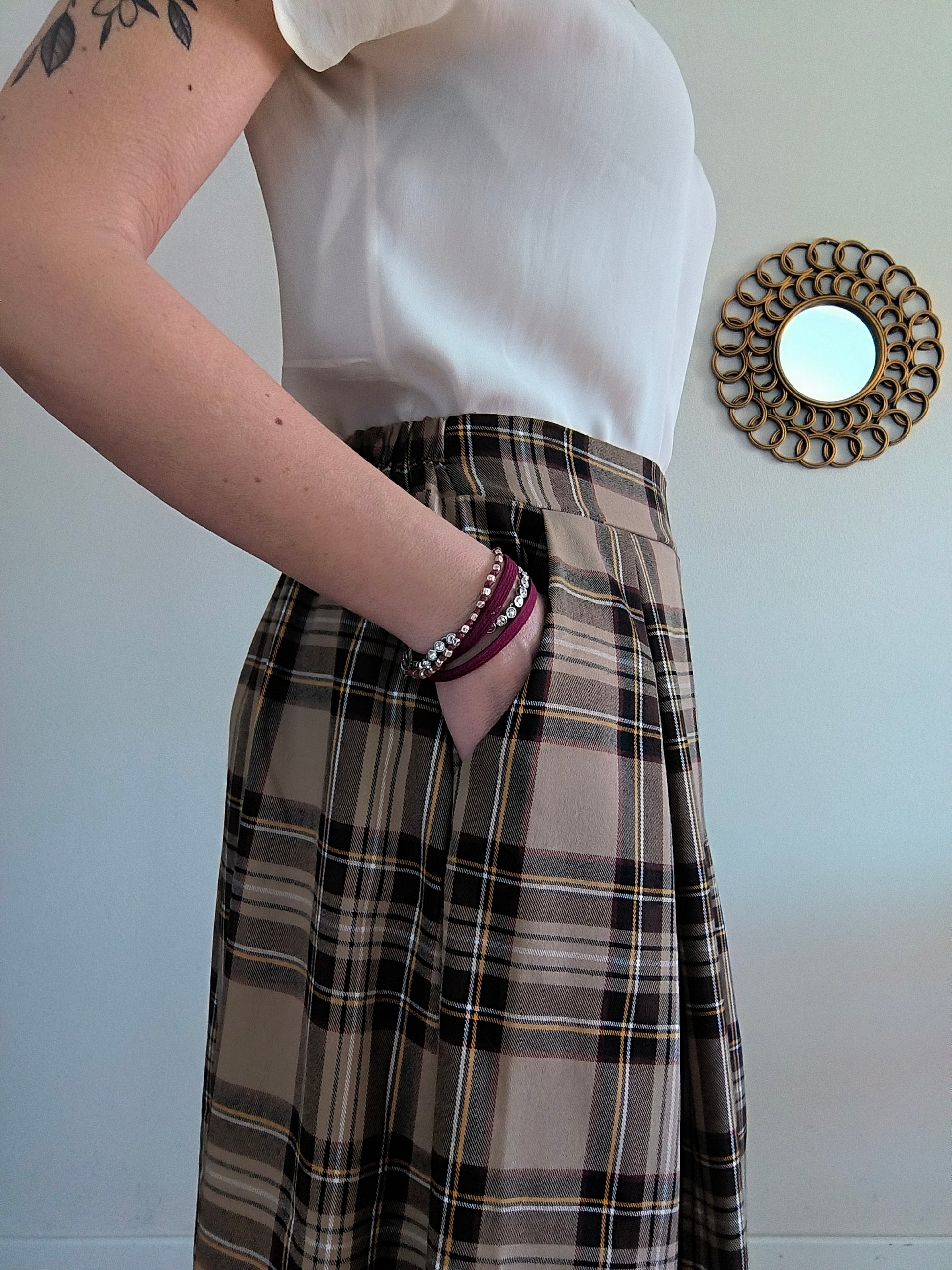 Bellissima gonna in tonalità nocciola/marrone, ampia, con varie pences, tasche laterali ed elastico in vita nella parte dietro.