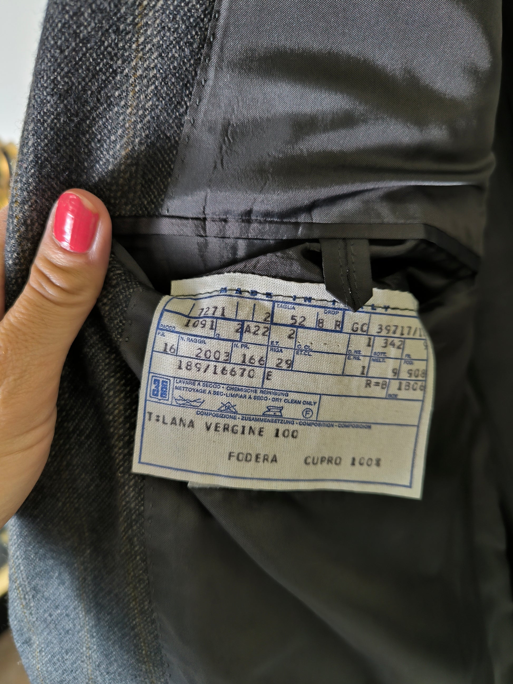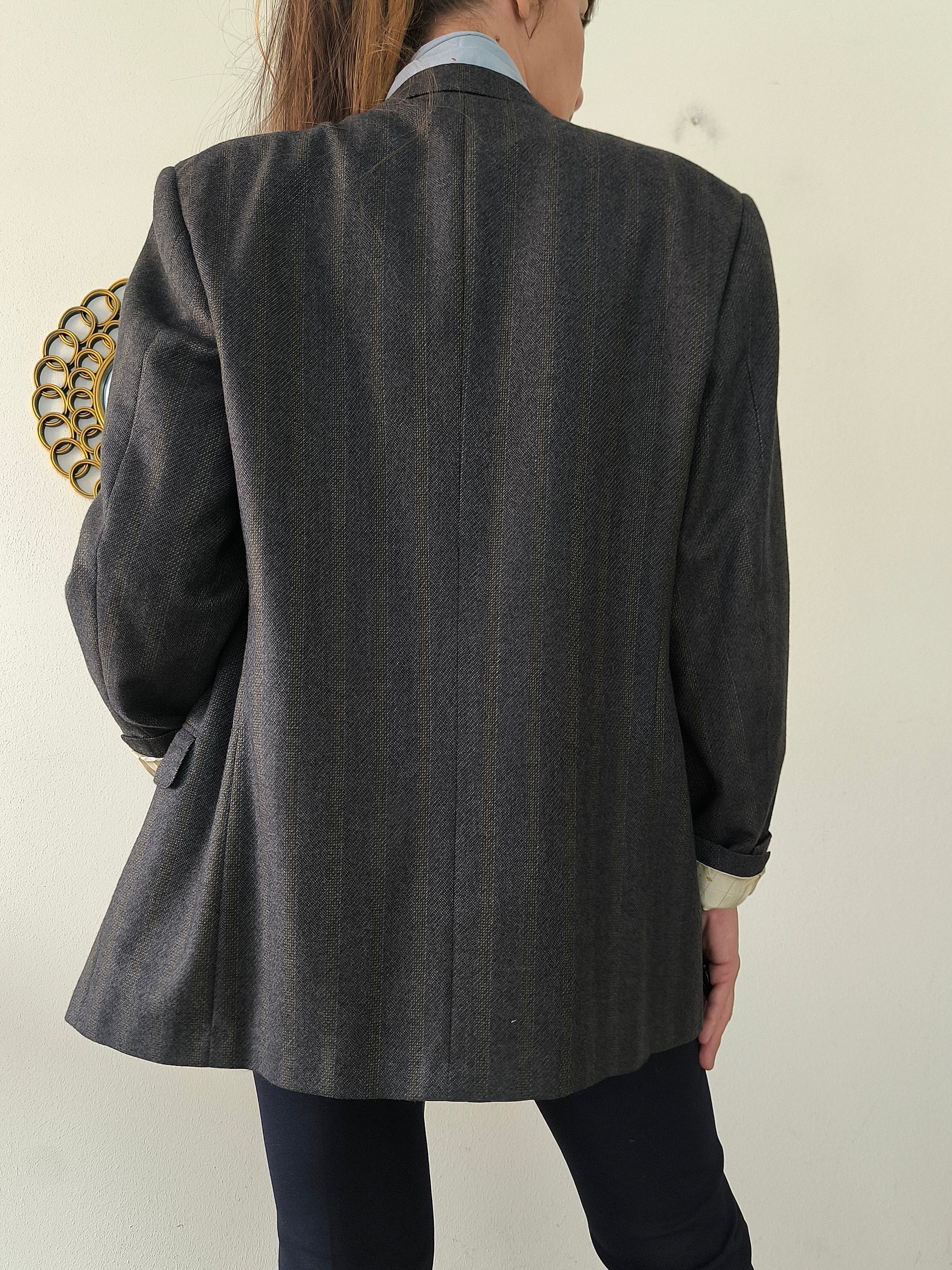 Blazer Corneliani, 100% pura Lana vergine, colore grigio scuro in un filato leggermente rigato in tonalità più ocra. Unisex, monopetto, chiusura due bottoni.