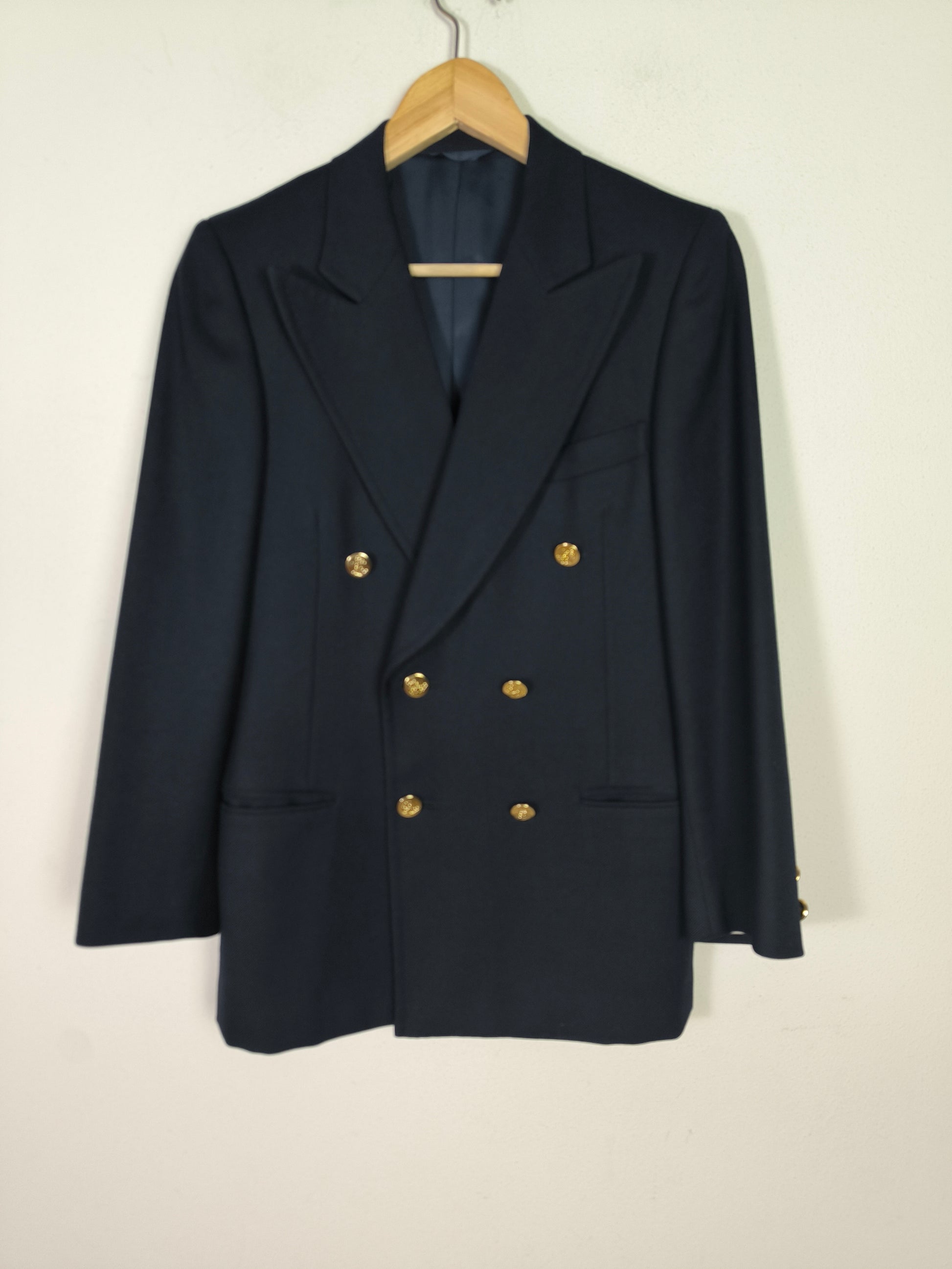 Blazer/caban vintage doppiopetto, colore blu notte, in pura lana vergine rasata, con bottoni marina dorati.