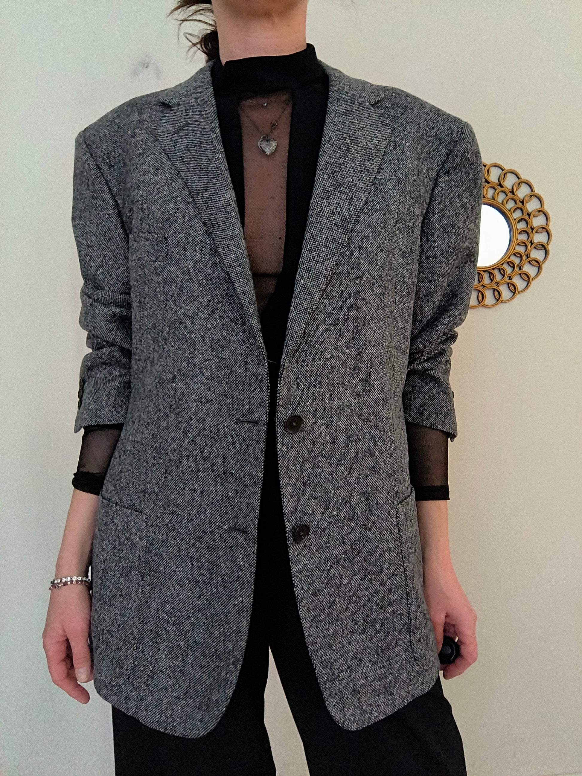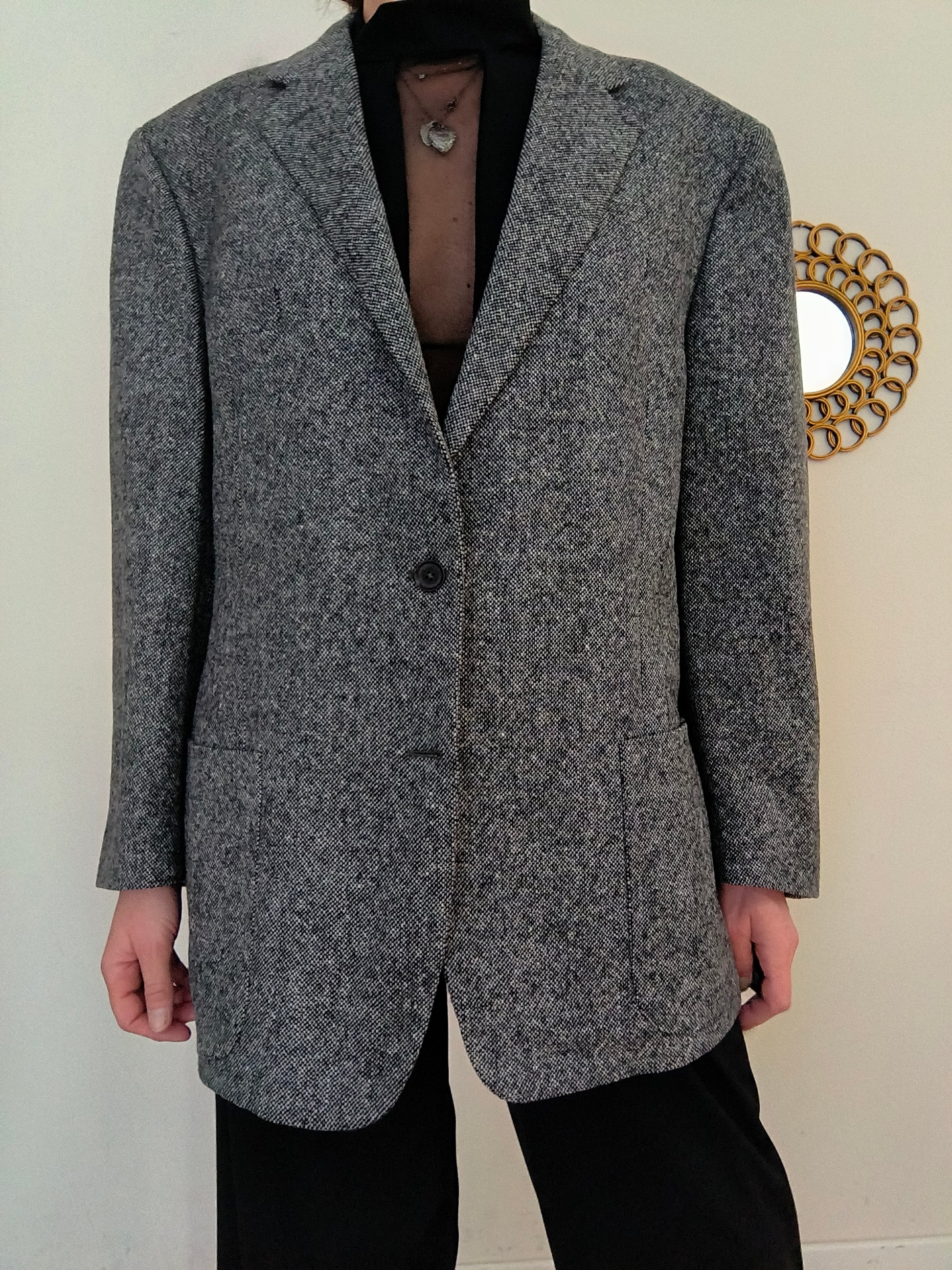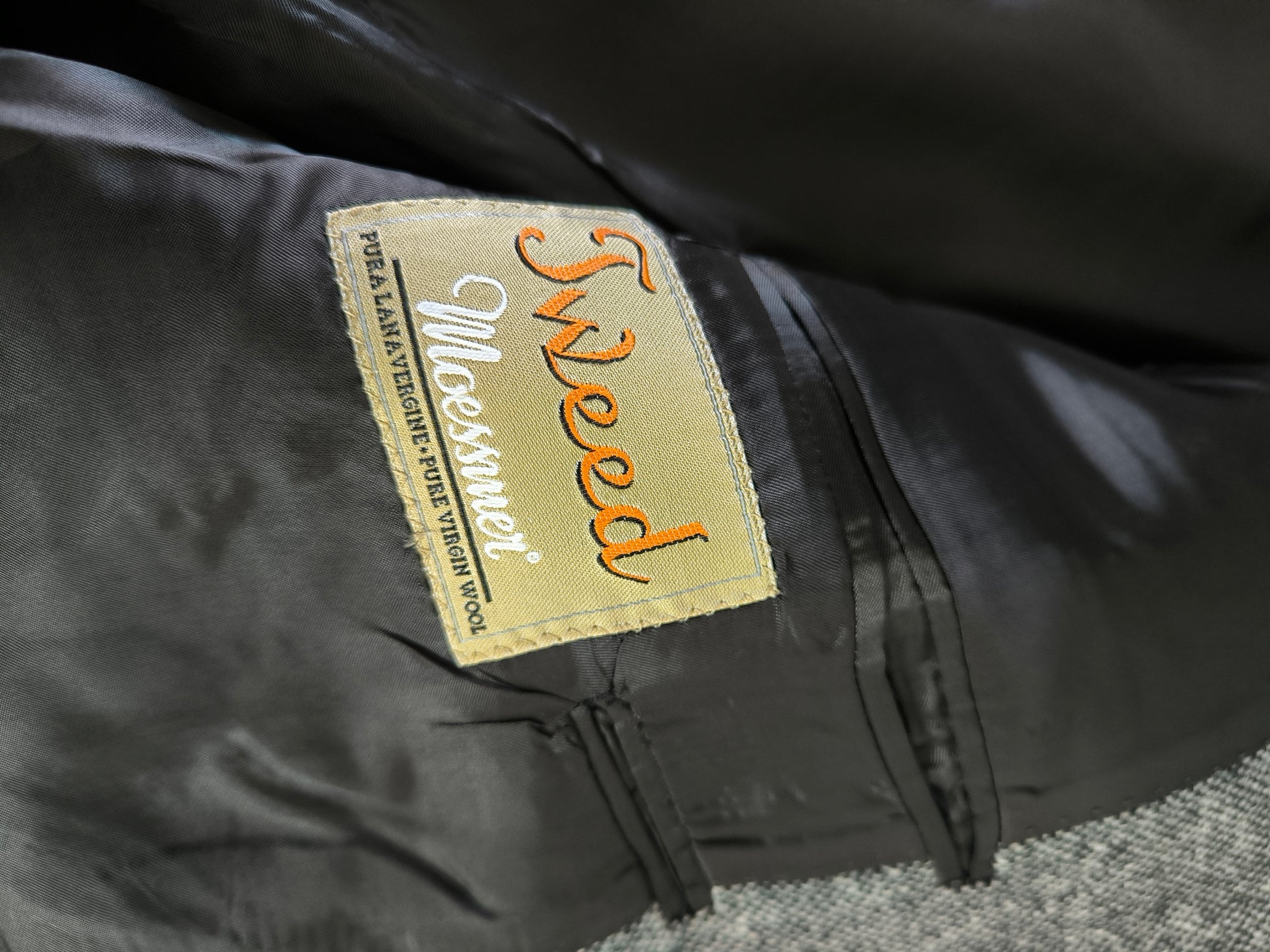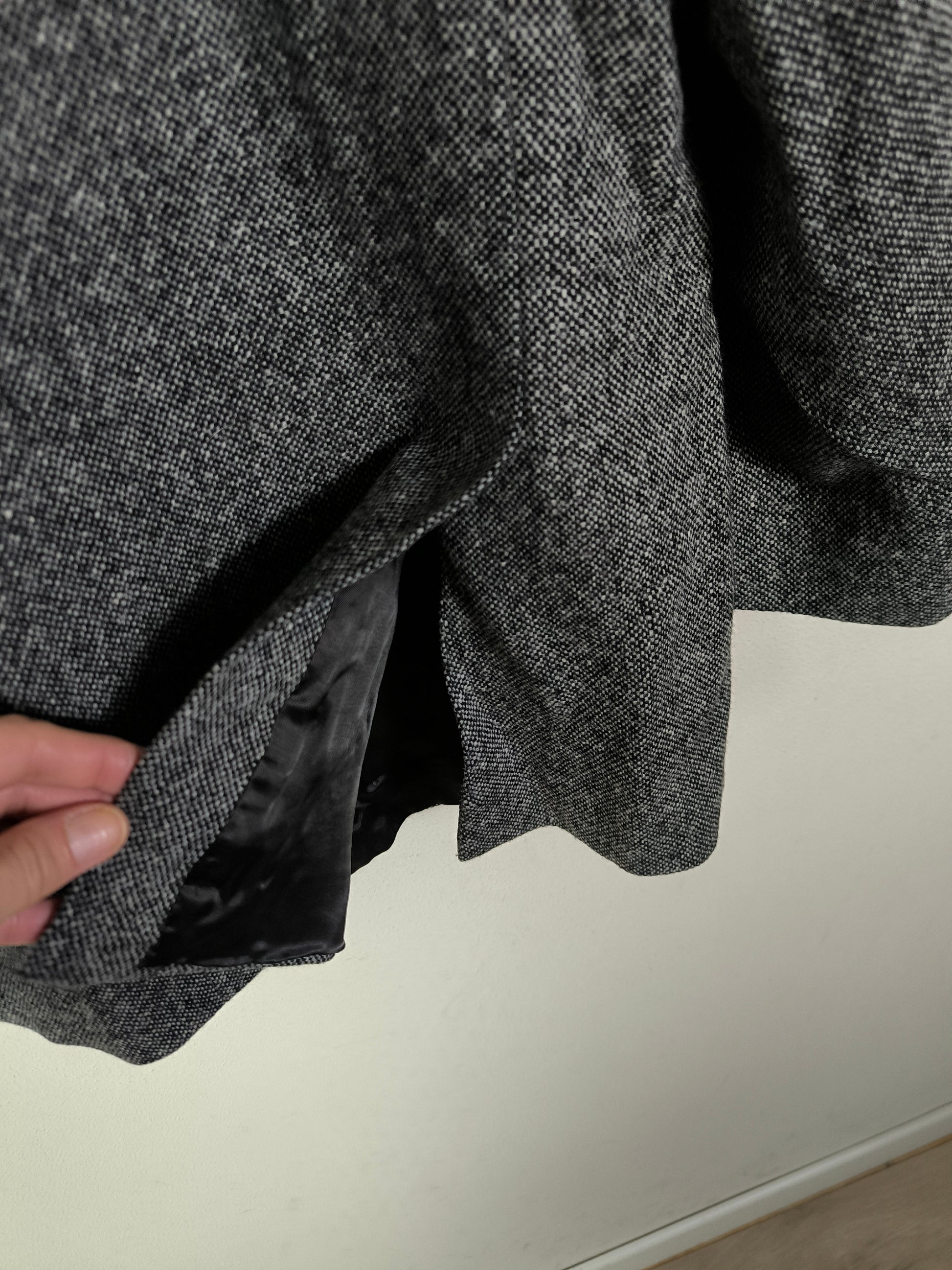Bellissimo blazer Michelangelo Napoli, in tweed Moessmer, grigio, monopetto, due bottoni con spacchi laterali.