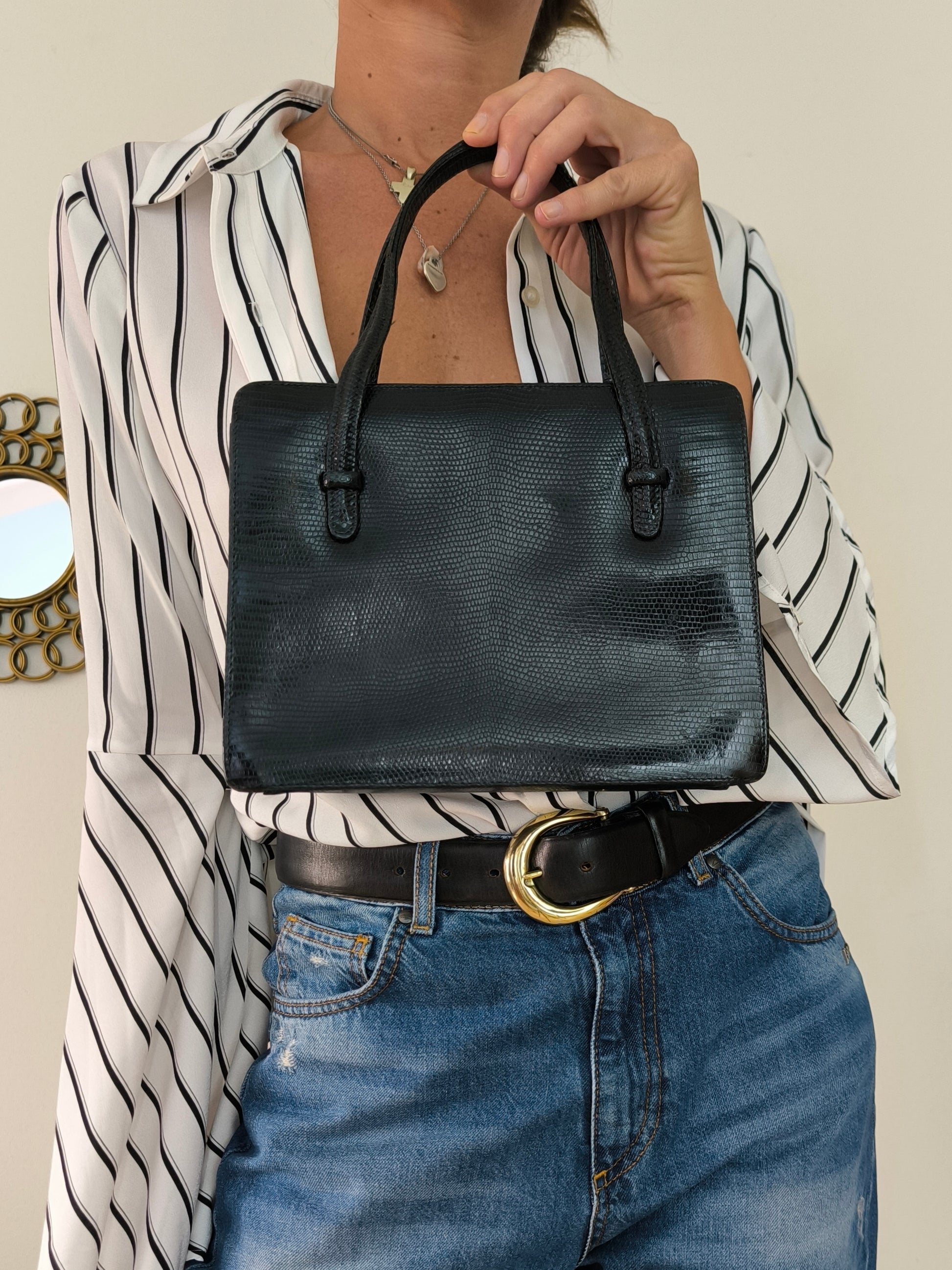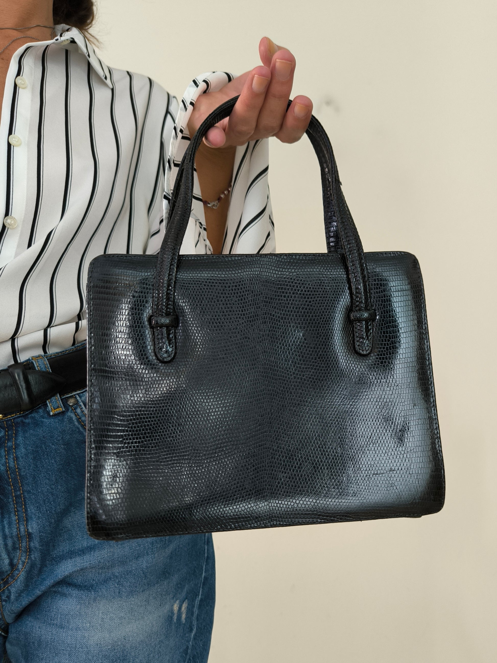 Borsetta anni 50 nera, lucida, in pelle stampata lucertolino,