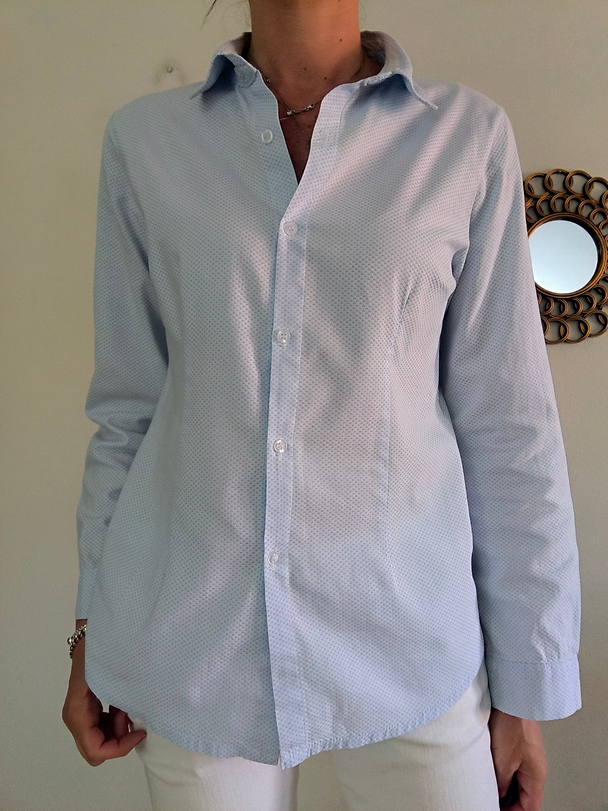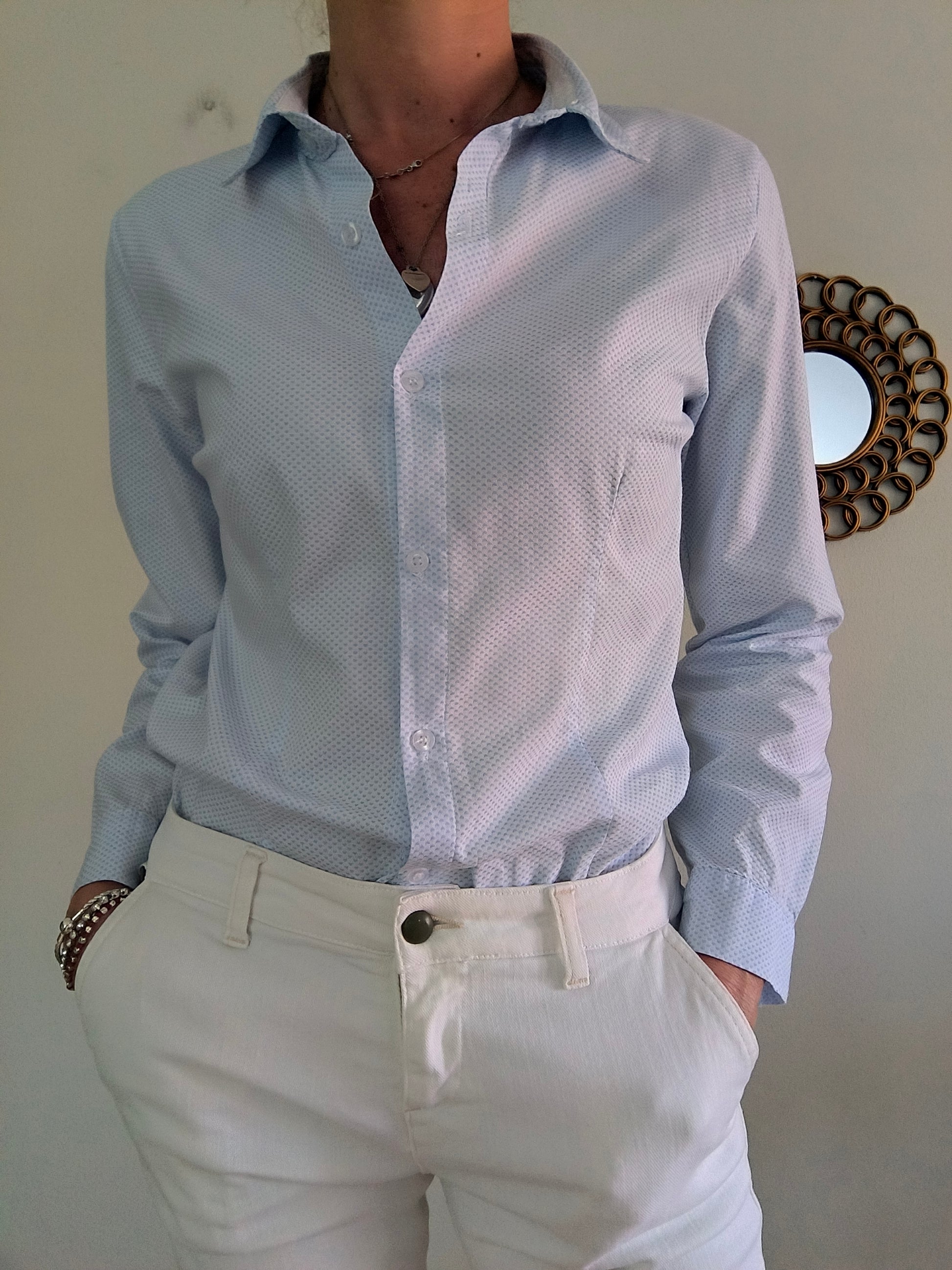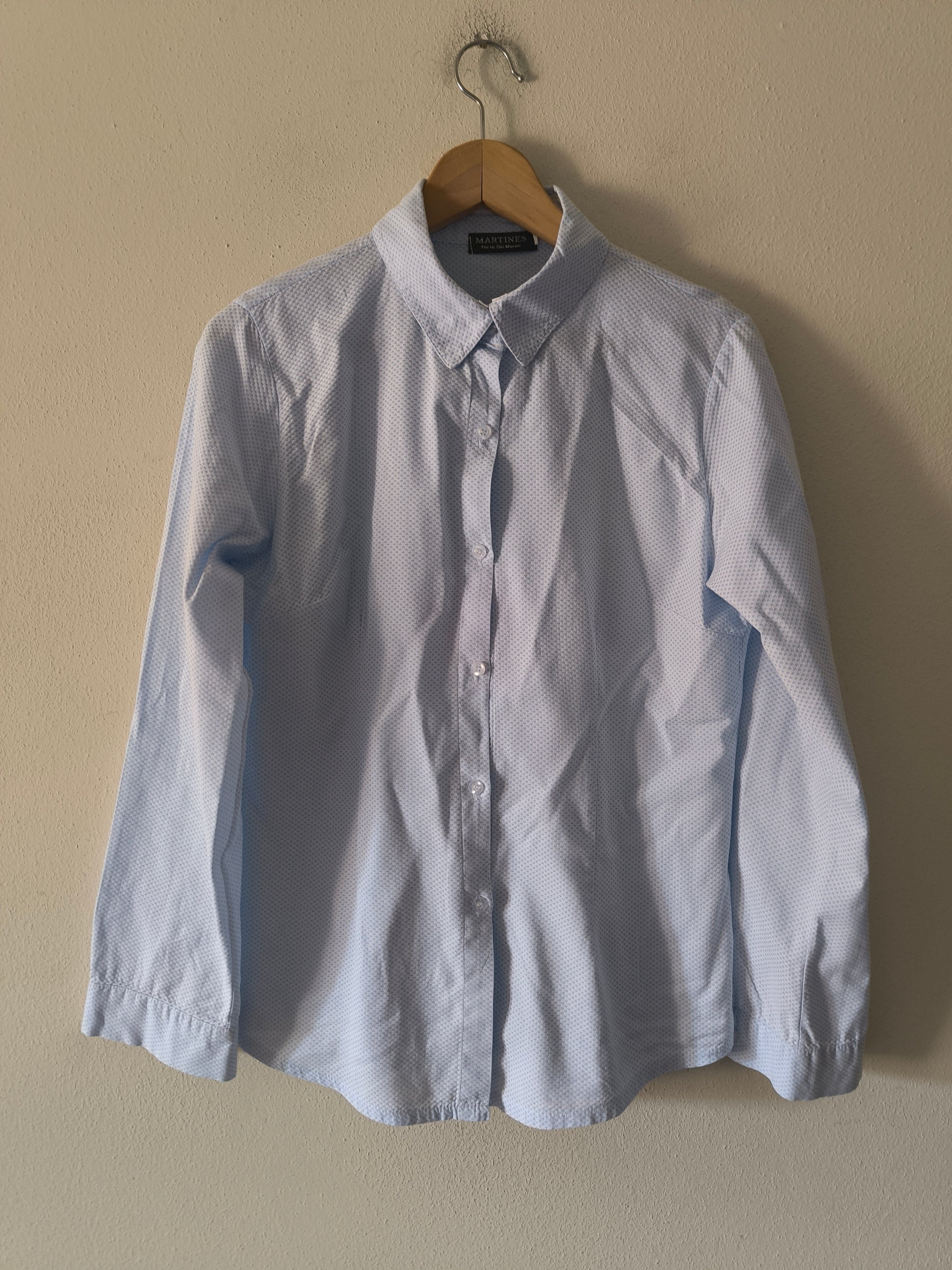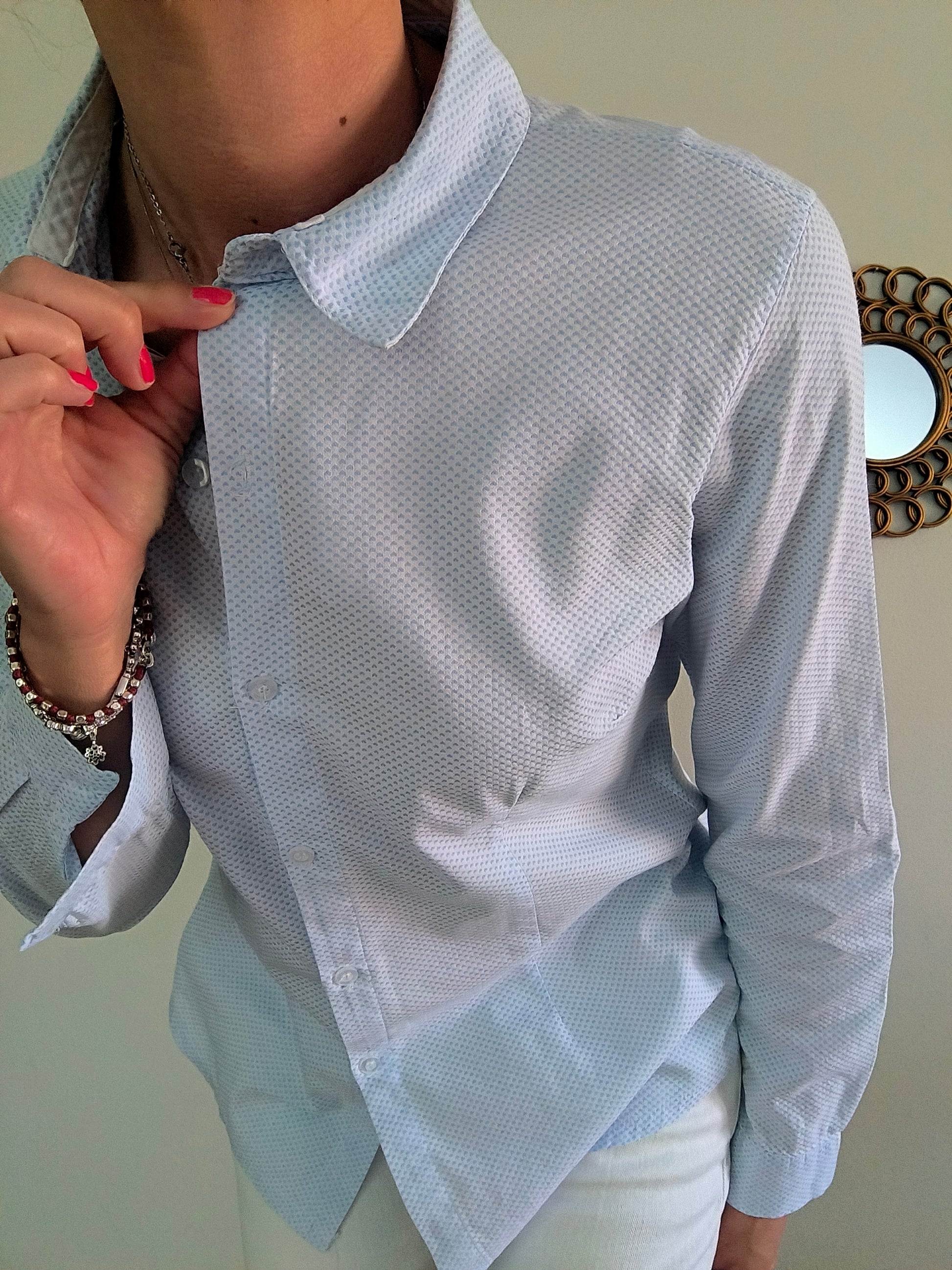 Camicetta azzurra, Martines Forte dei Marmi, femminile, fantasia piccoli cuoricini operati nel filato, con linea leggermente avvitata.