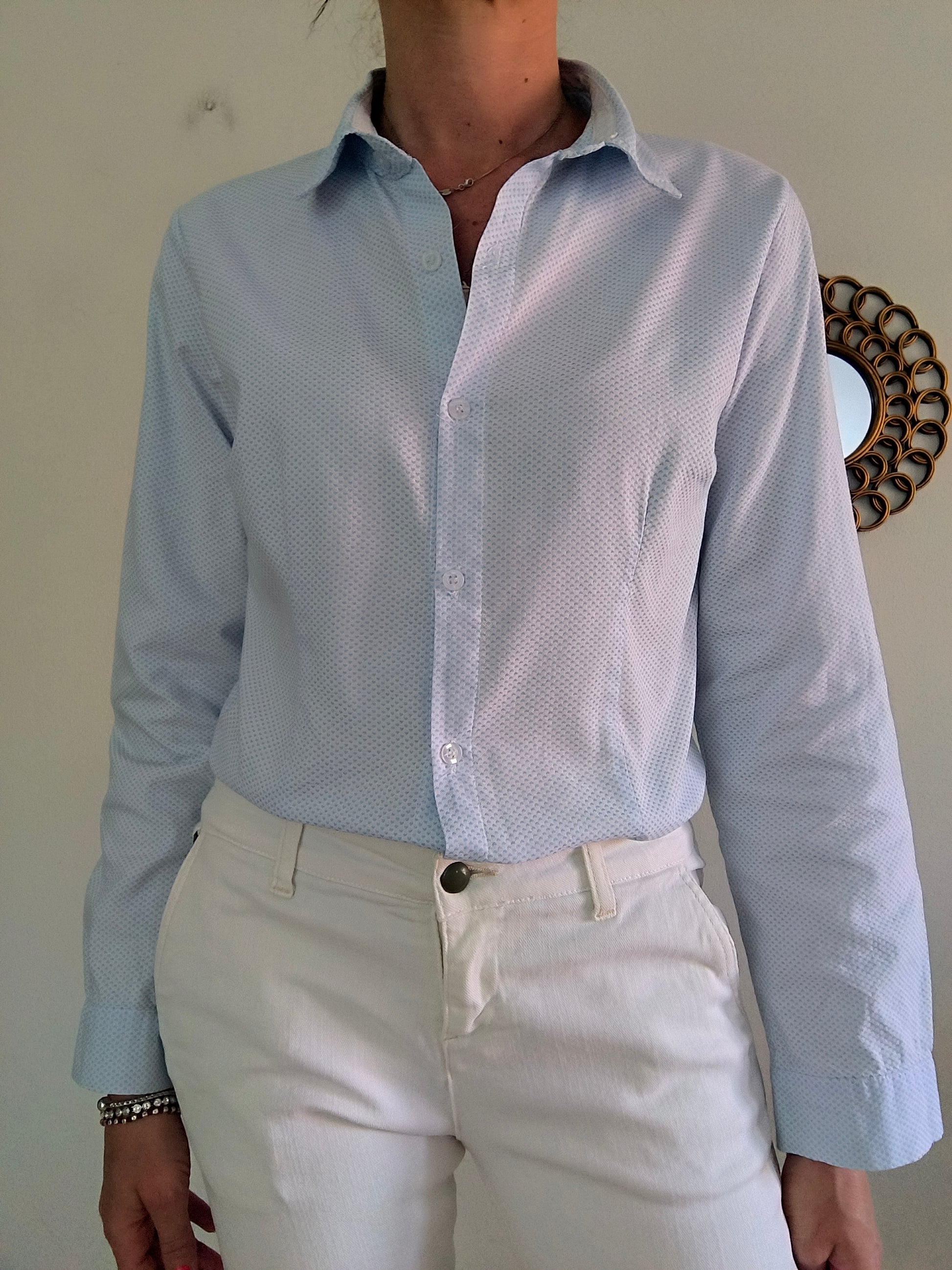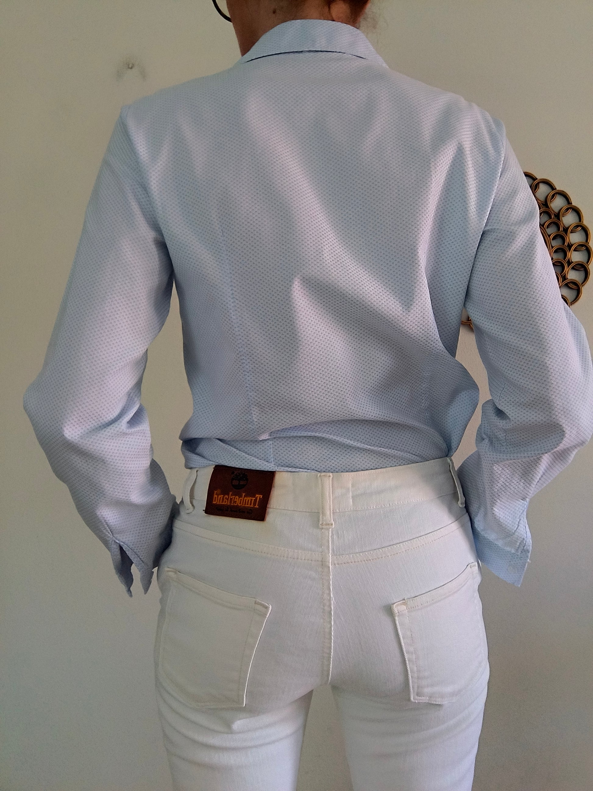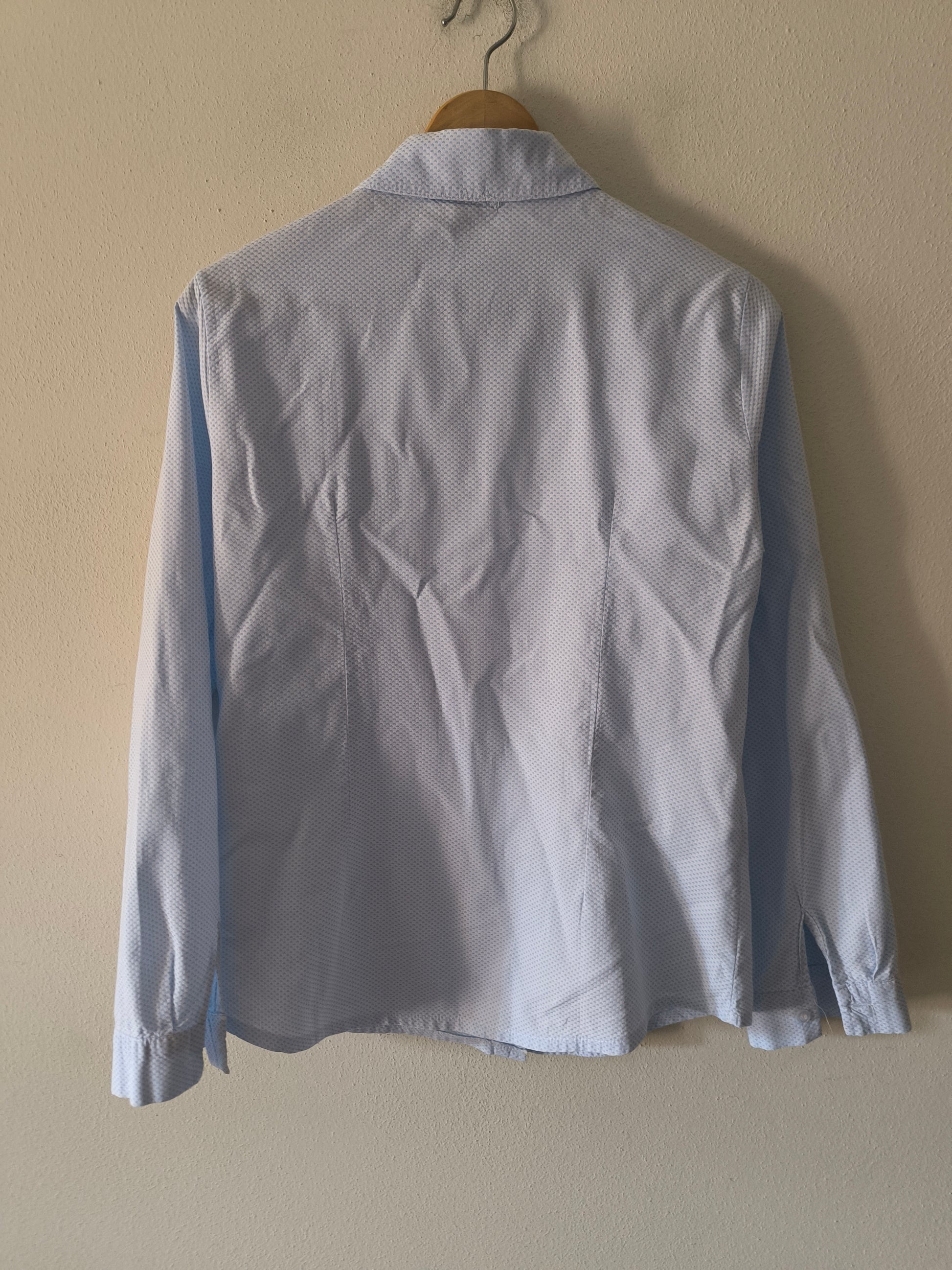 Camicetta azzurra, Martines Forte dei Marmi, femminile, fantasia piccoli cuoricini operati nel filato, con linea leggermente avvitata.