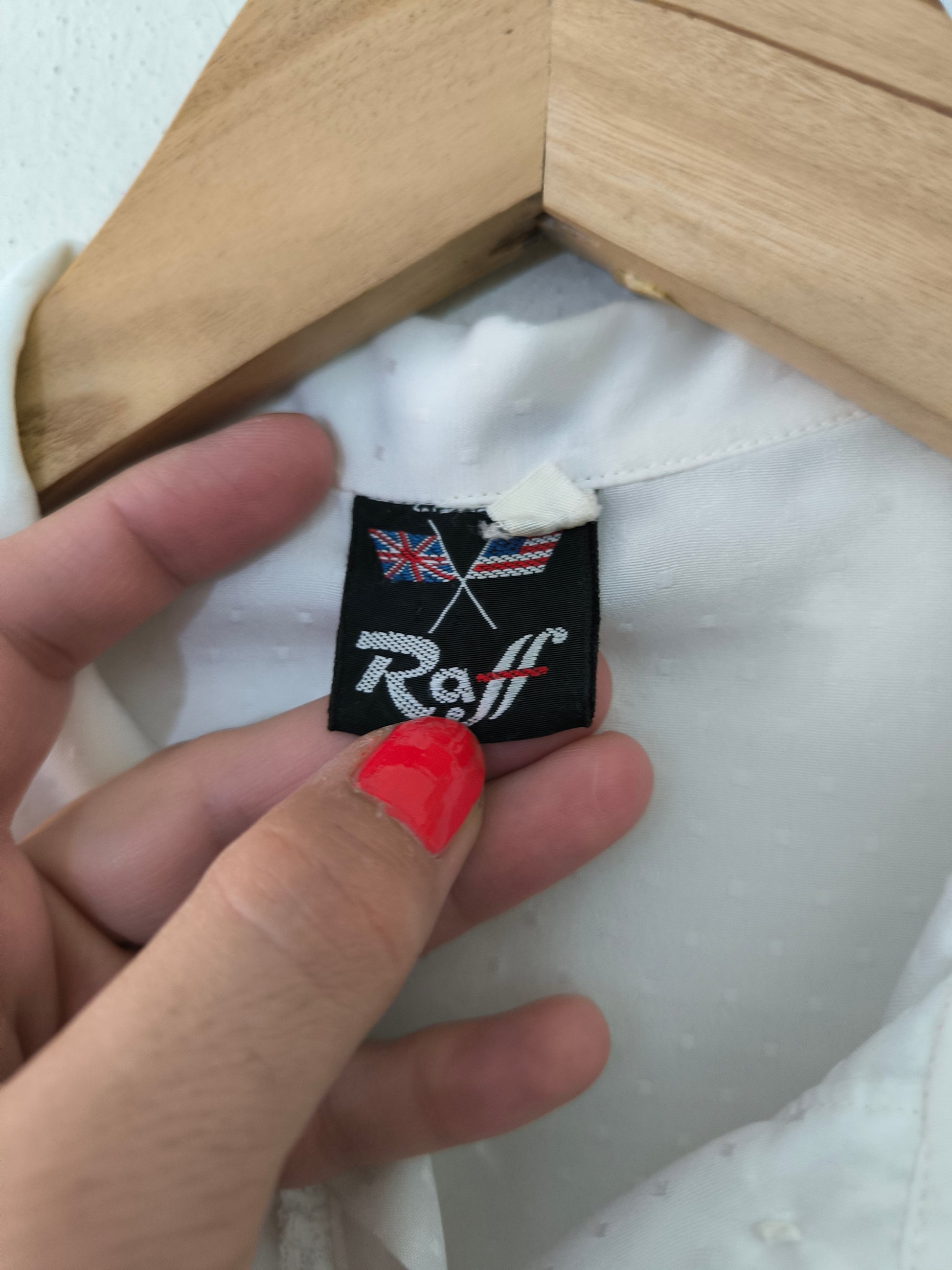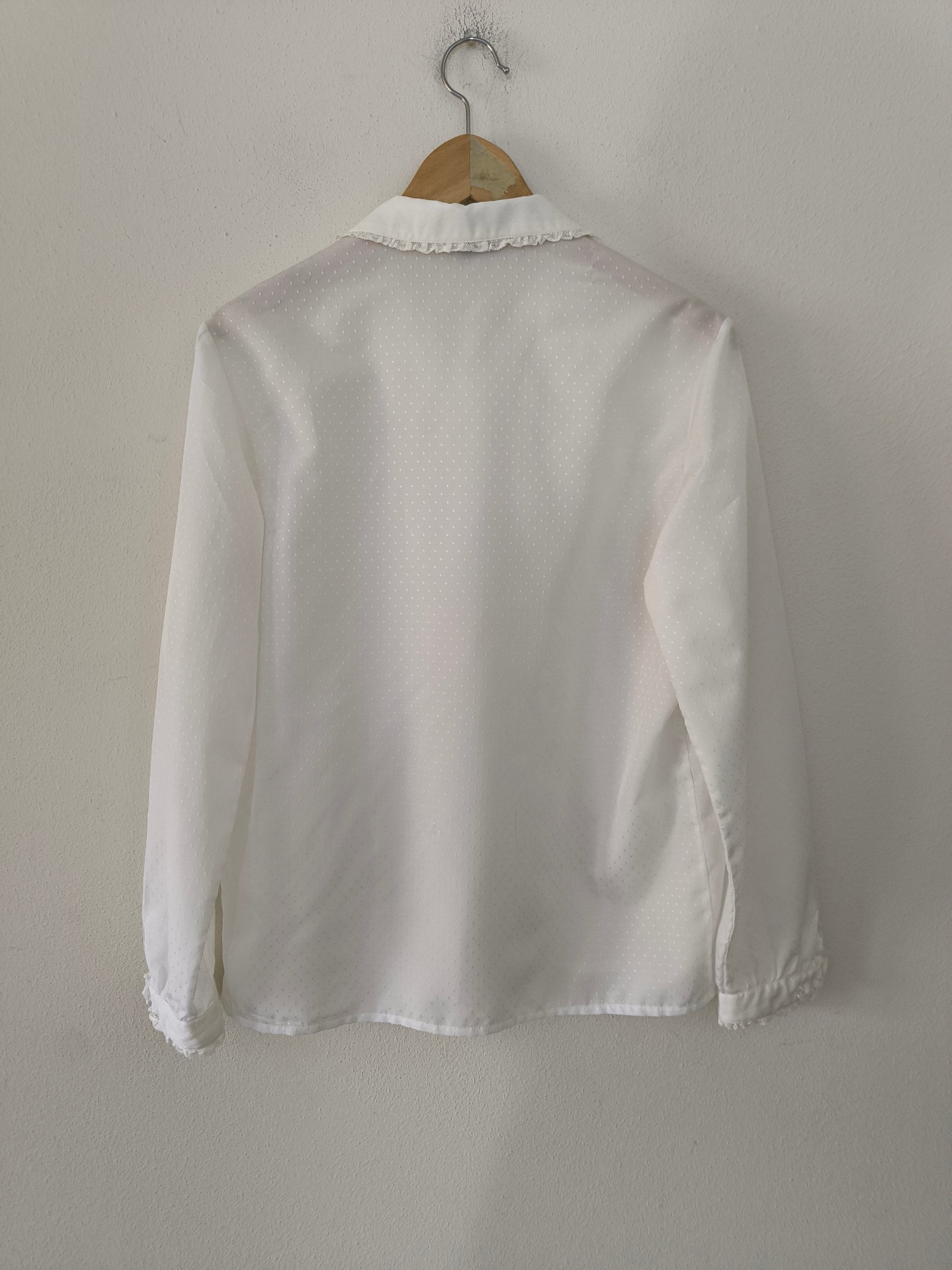 Camicetta vintage Raf, tessuto bianco operato a piccoli pallini tono su tono, con pizzo applicato su tutta la lunghezza dei bottoni, sul colletto e sui polsini