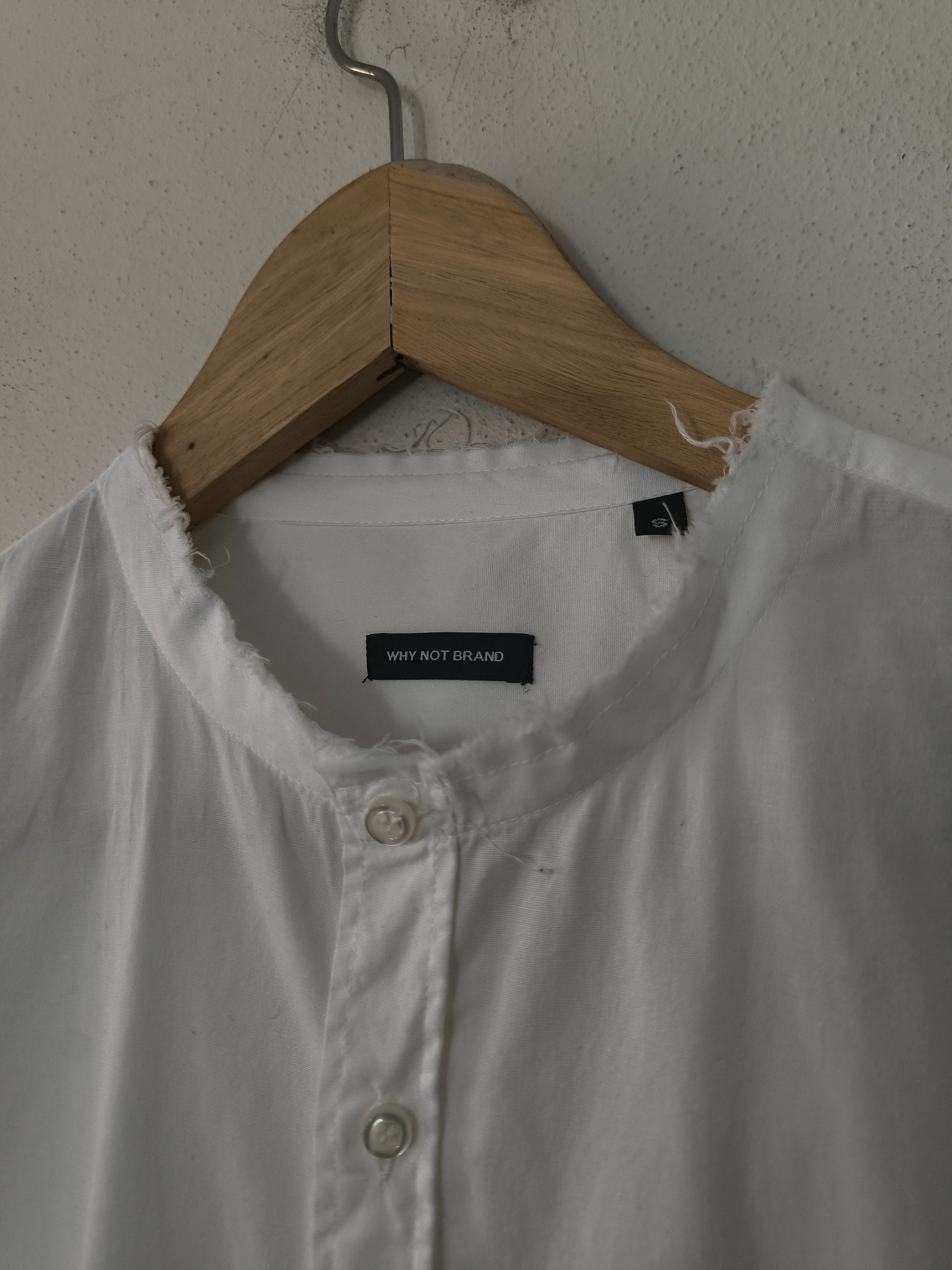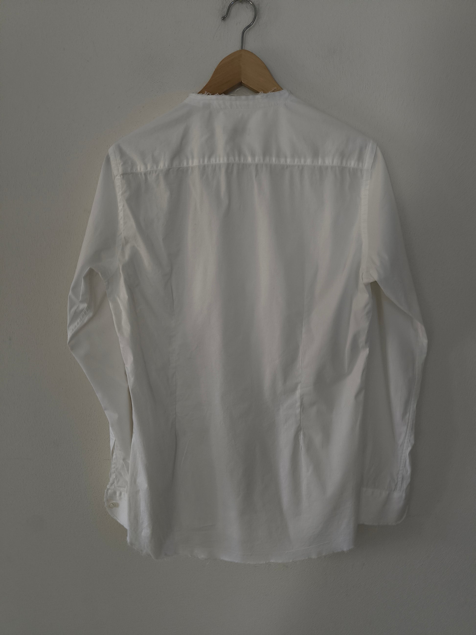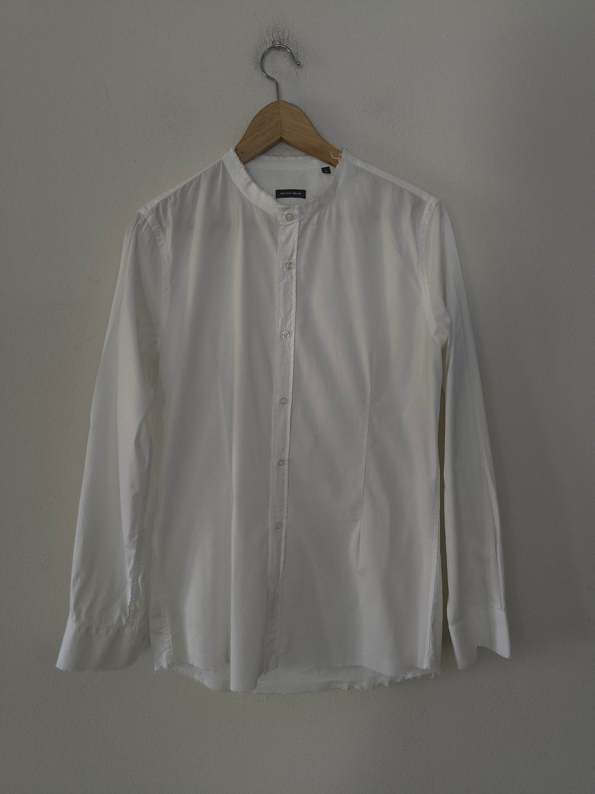 Camicia WhyNot, in cotone bianco, manica lunga con collo mandarino, polsi e orlo basso sfilacciati.