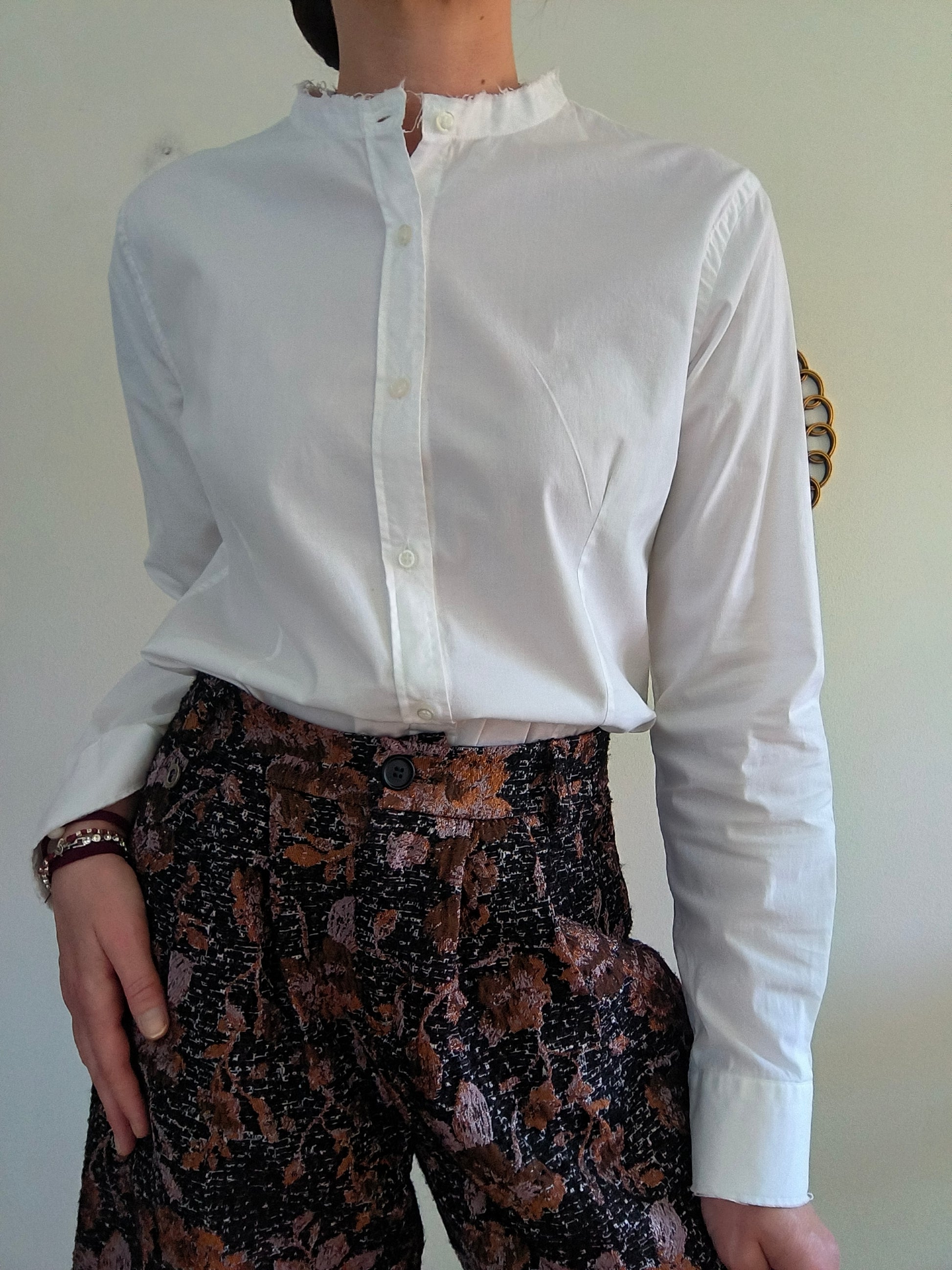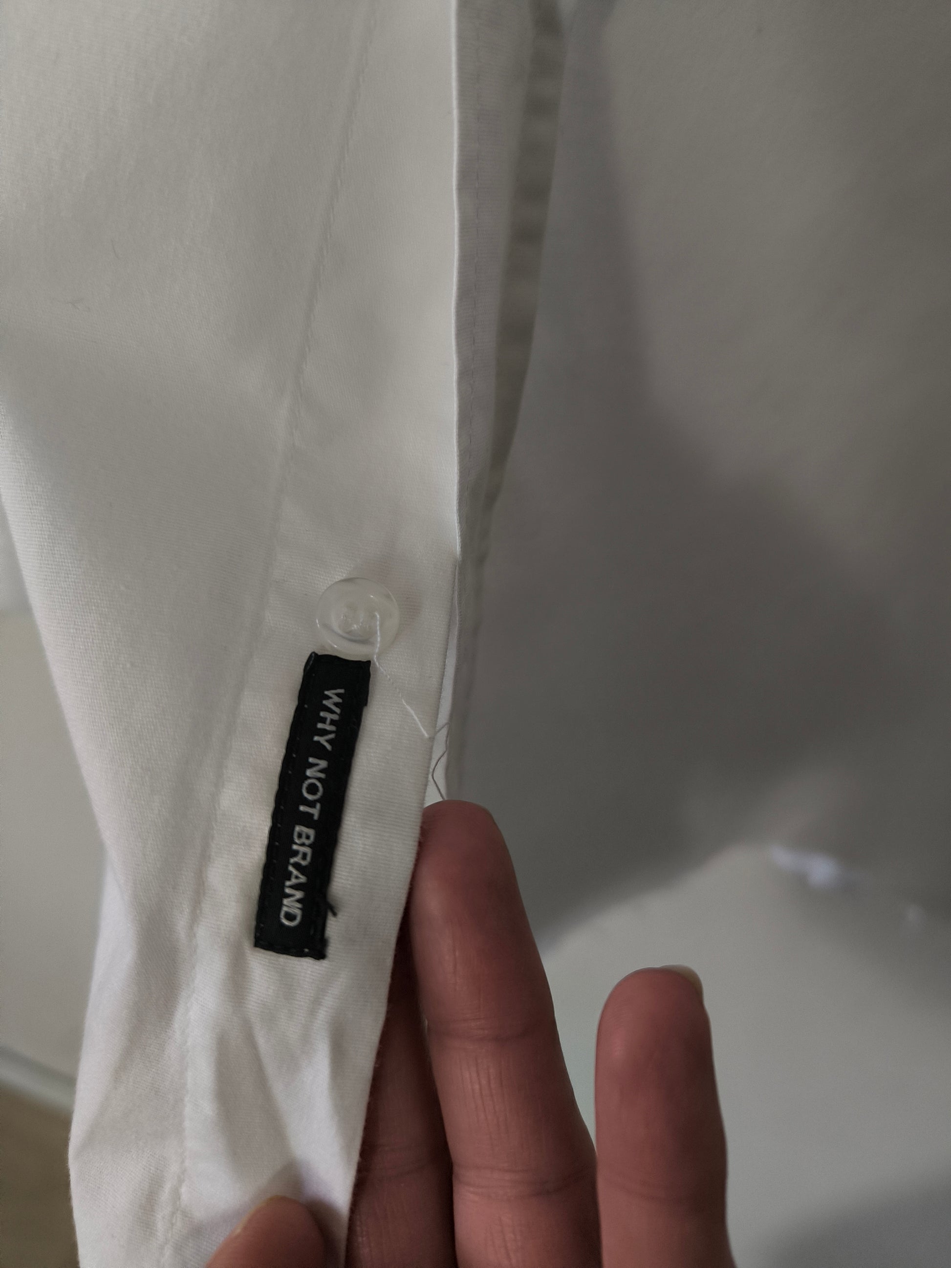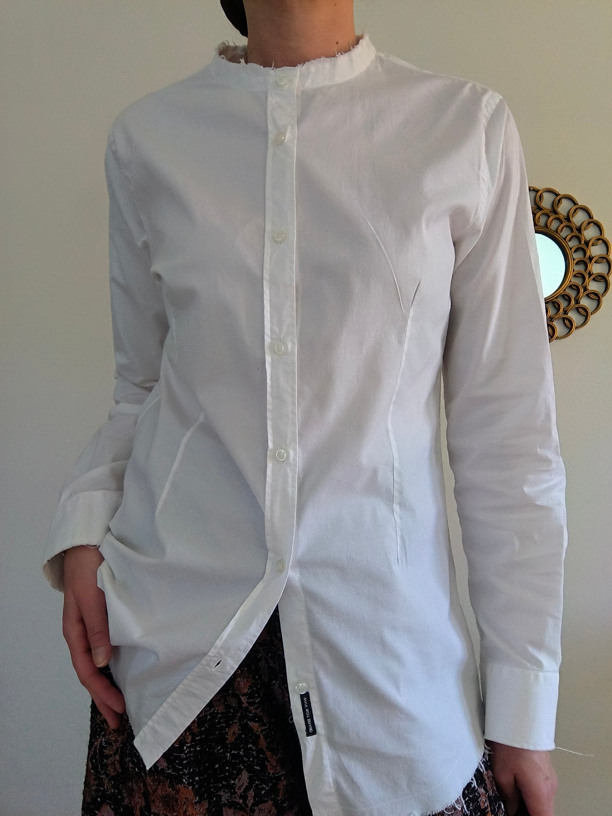 Camicia WhyNot, in cotone bianco, manica lunga con collo mandarino, polsi e orlo basso sfilacciati.