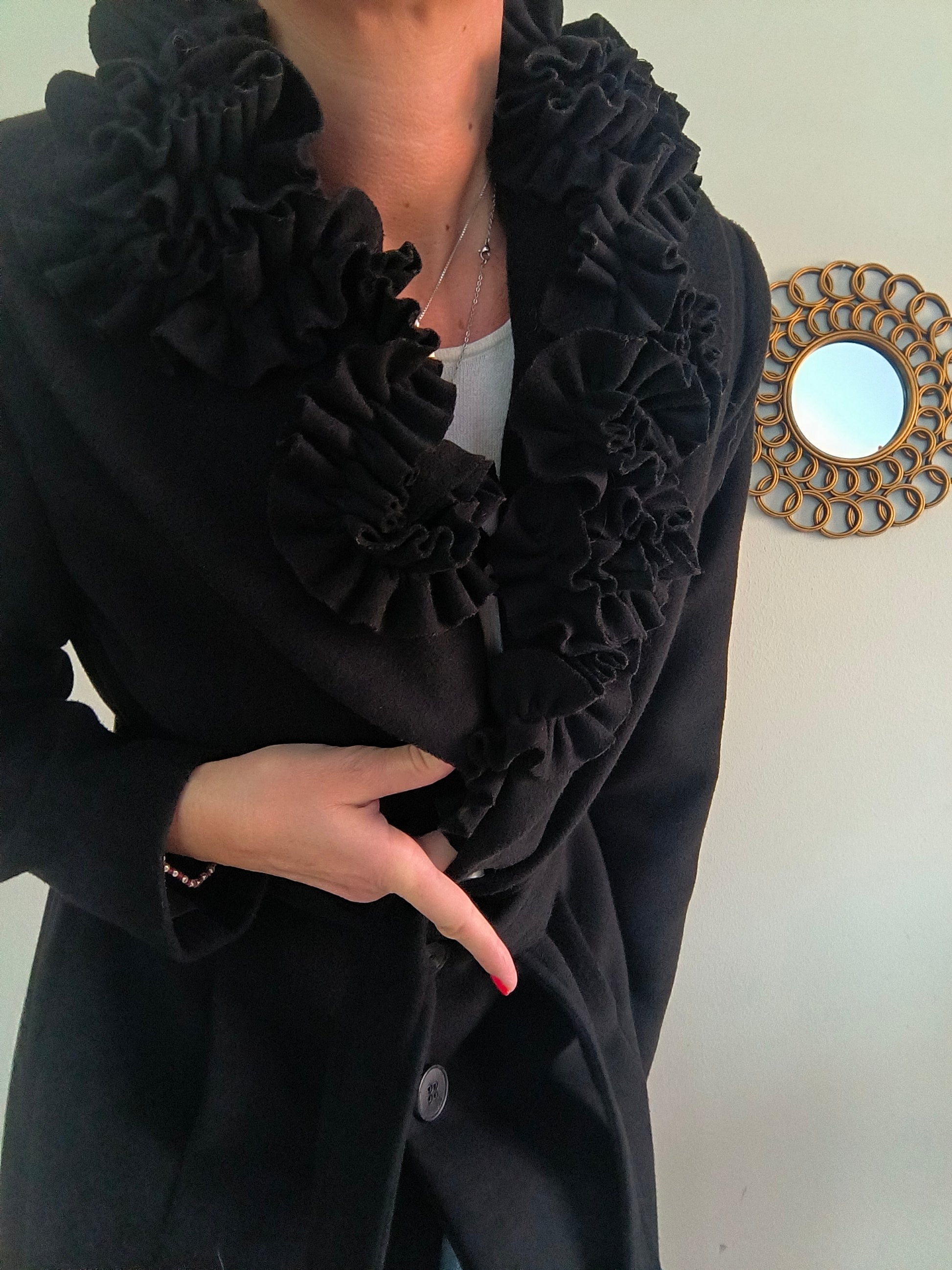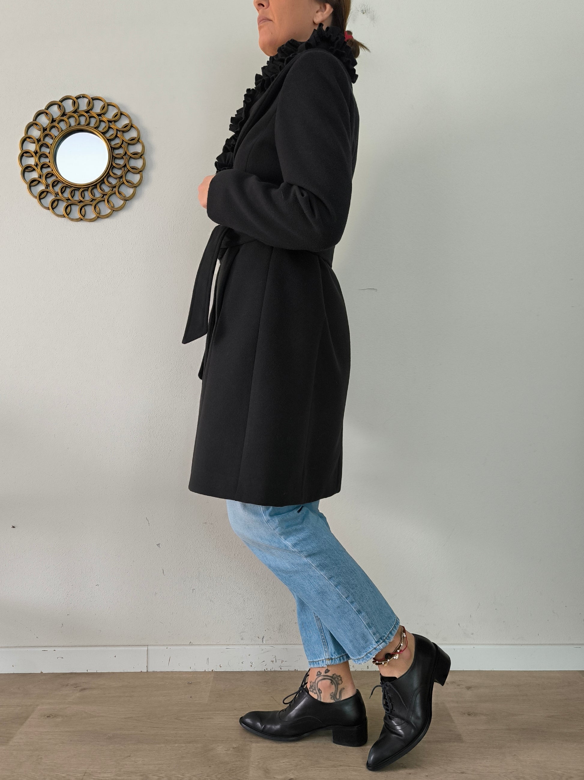Cappotto nero, made in Italy, con ruches a formare piccoli fiori su entrambi i revers.