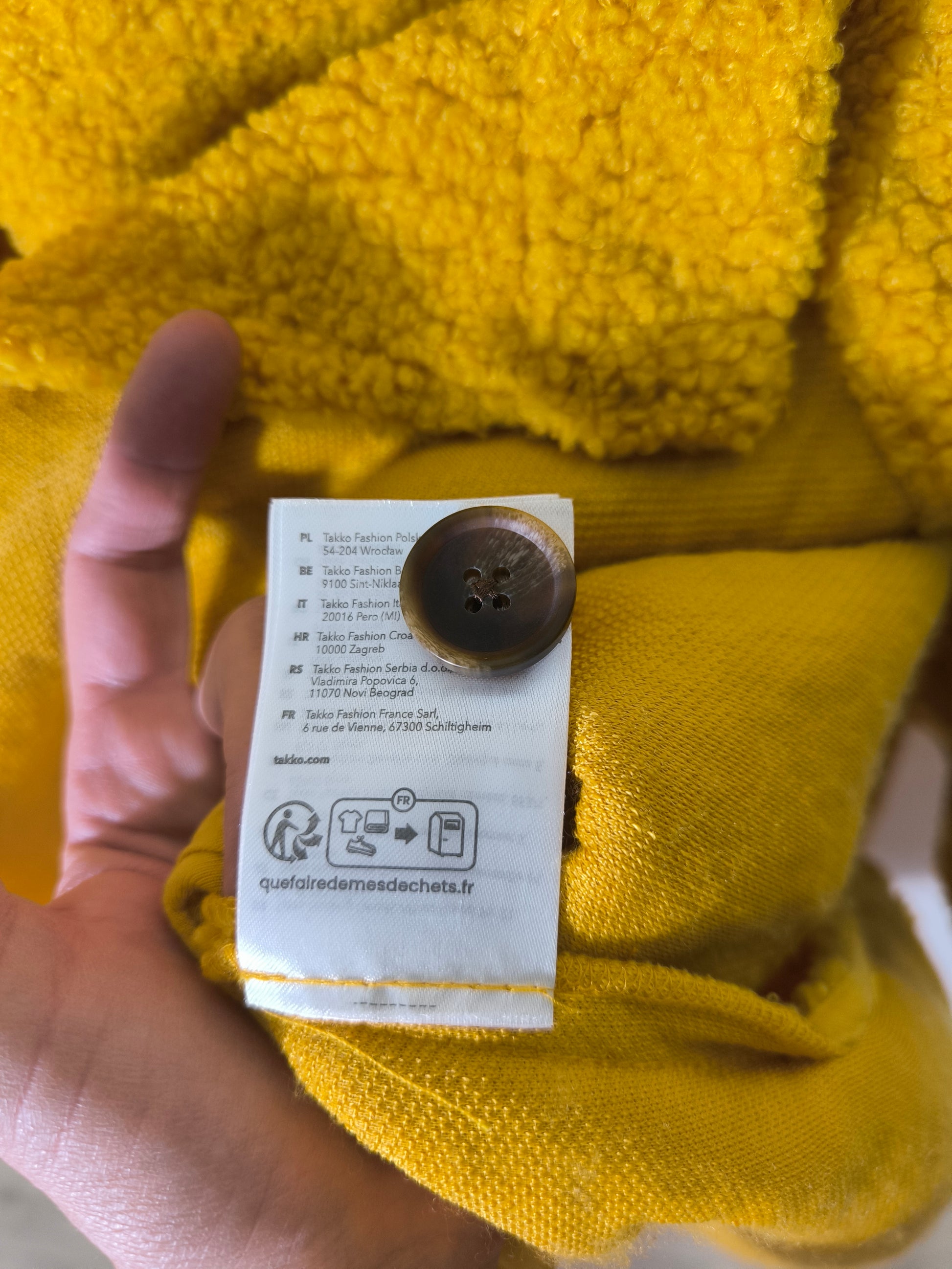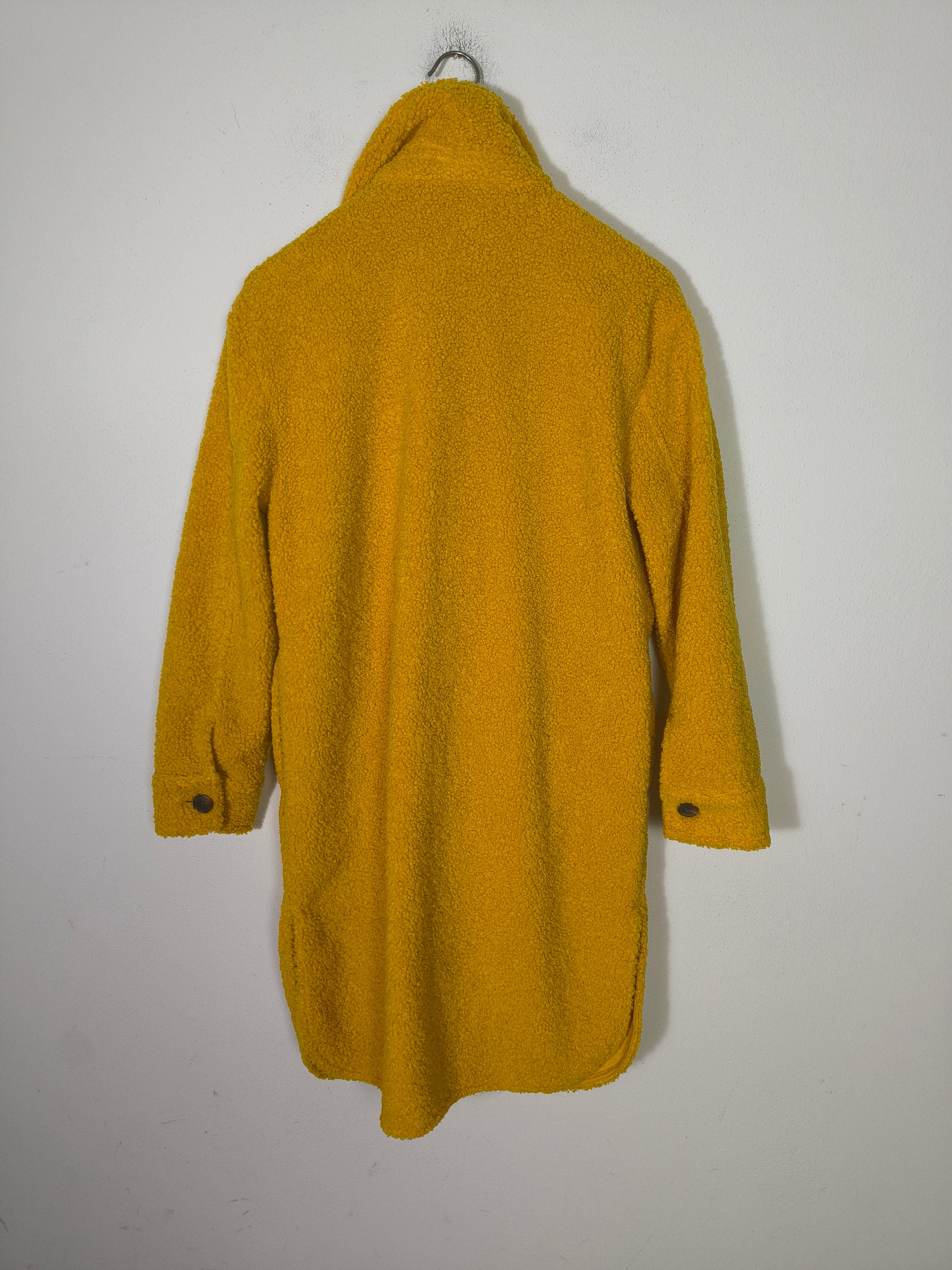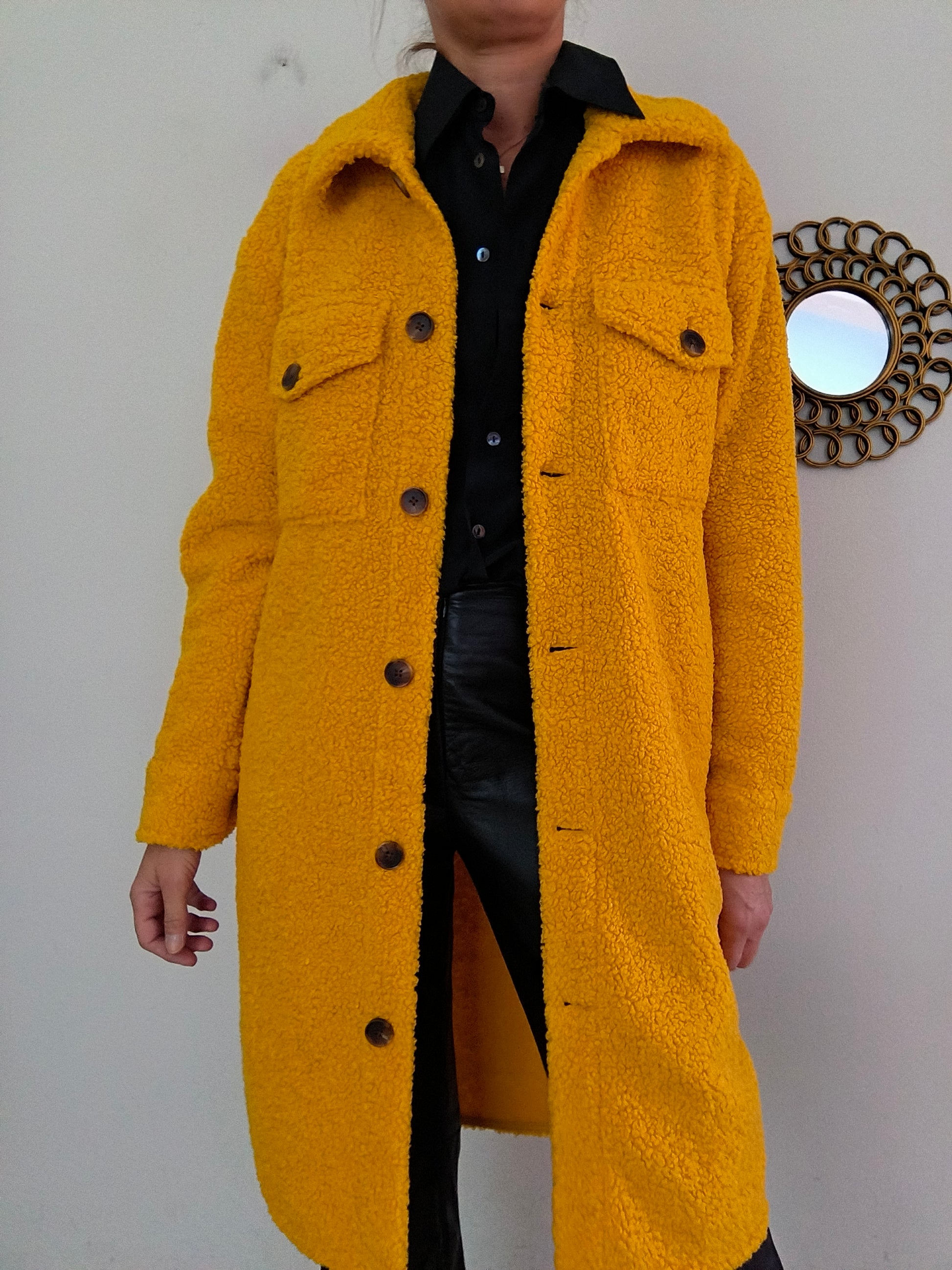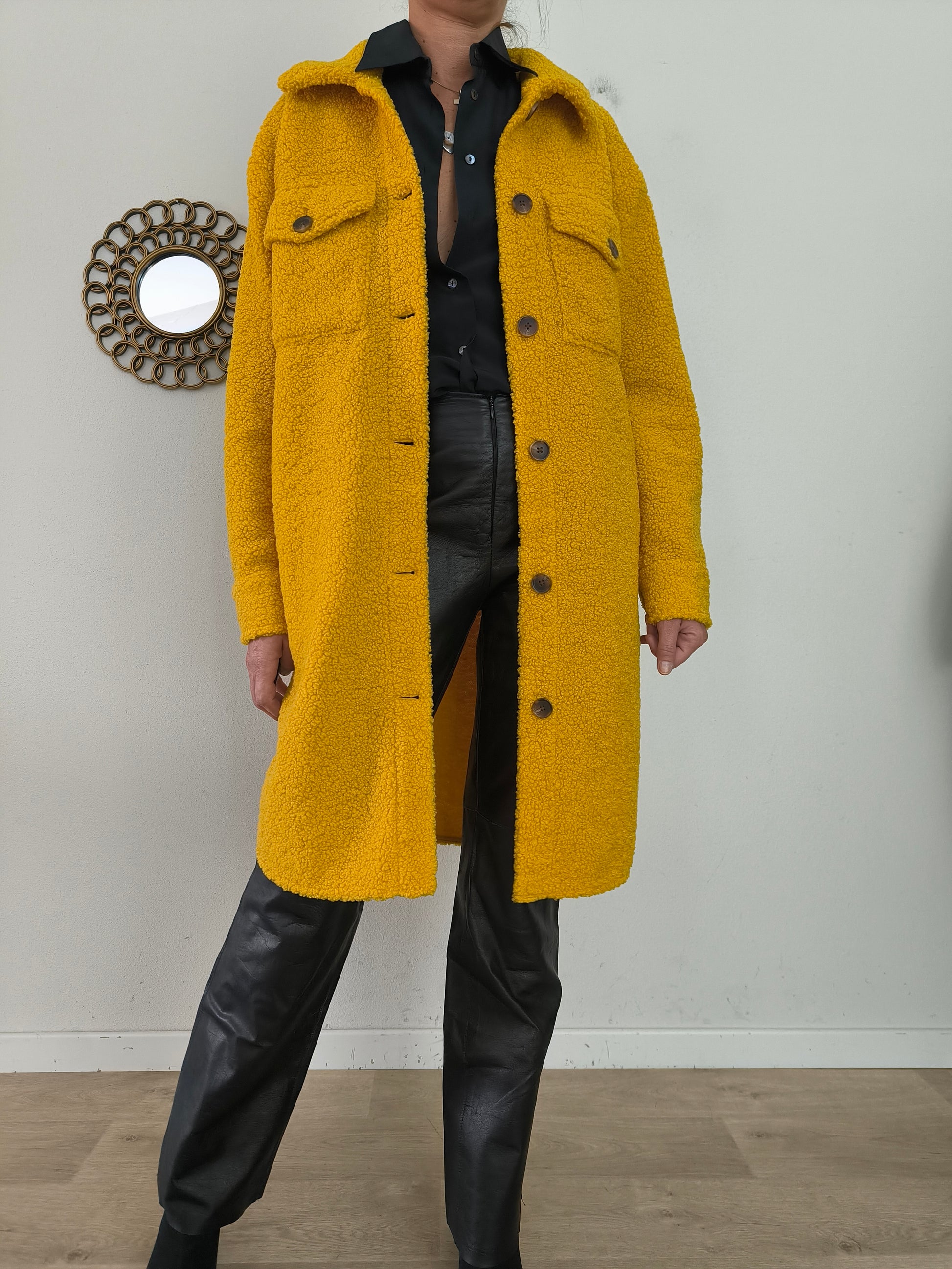 Cappotto camicia, lungo, in Teddy color senape, con abbottonatura sul davanti e tasche laterali.