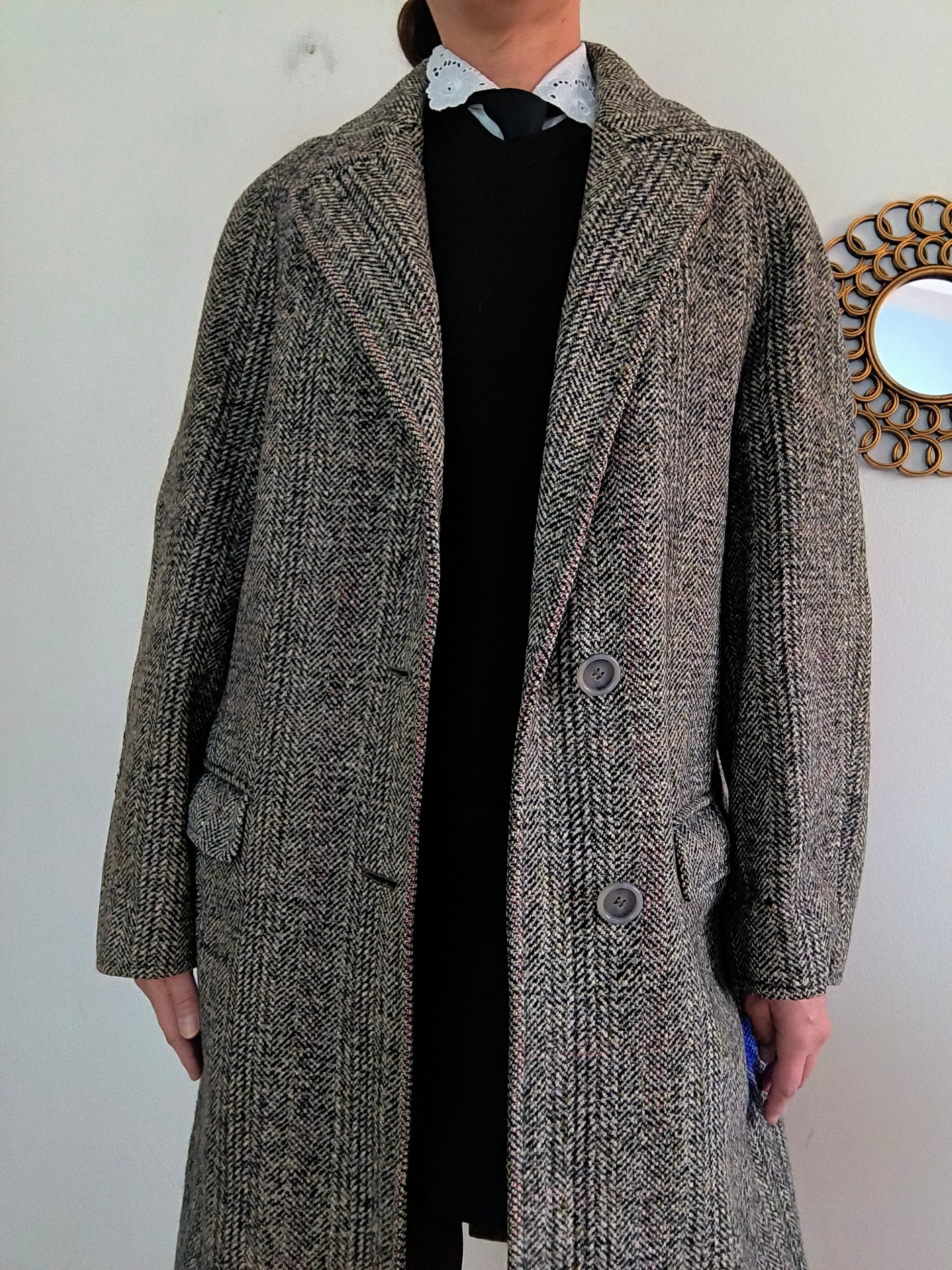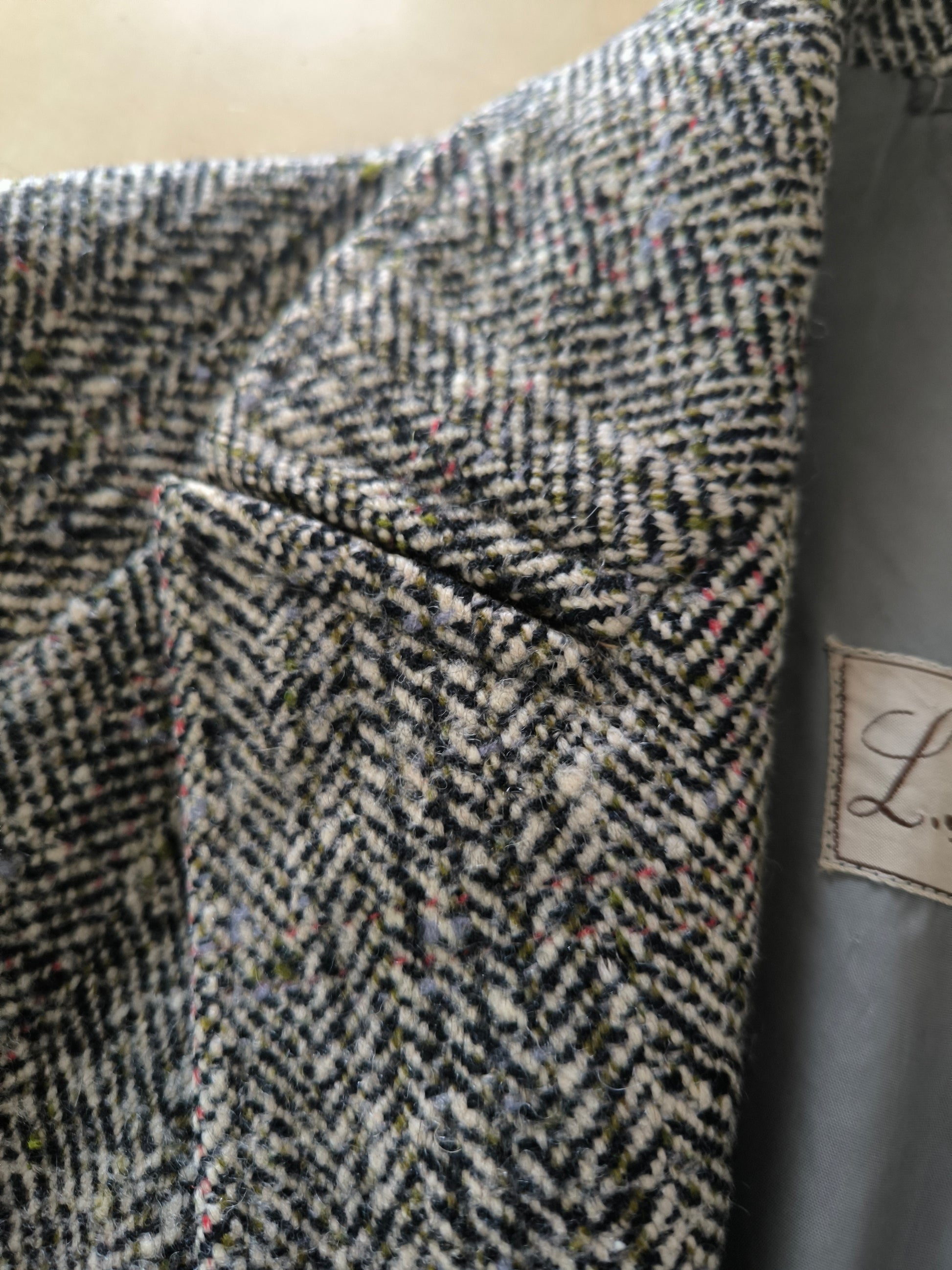 Abbottonatura sul davanti con grandi bottoni grigi, tasche con patta e spacco dietro