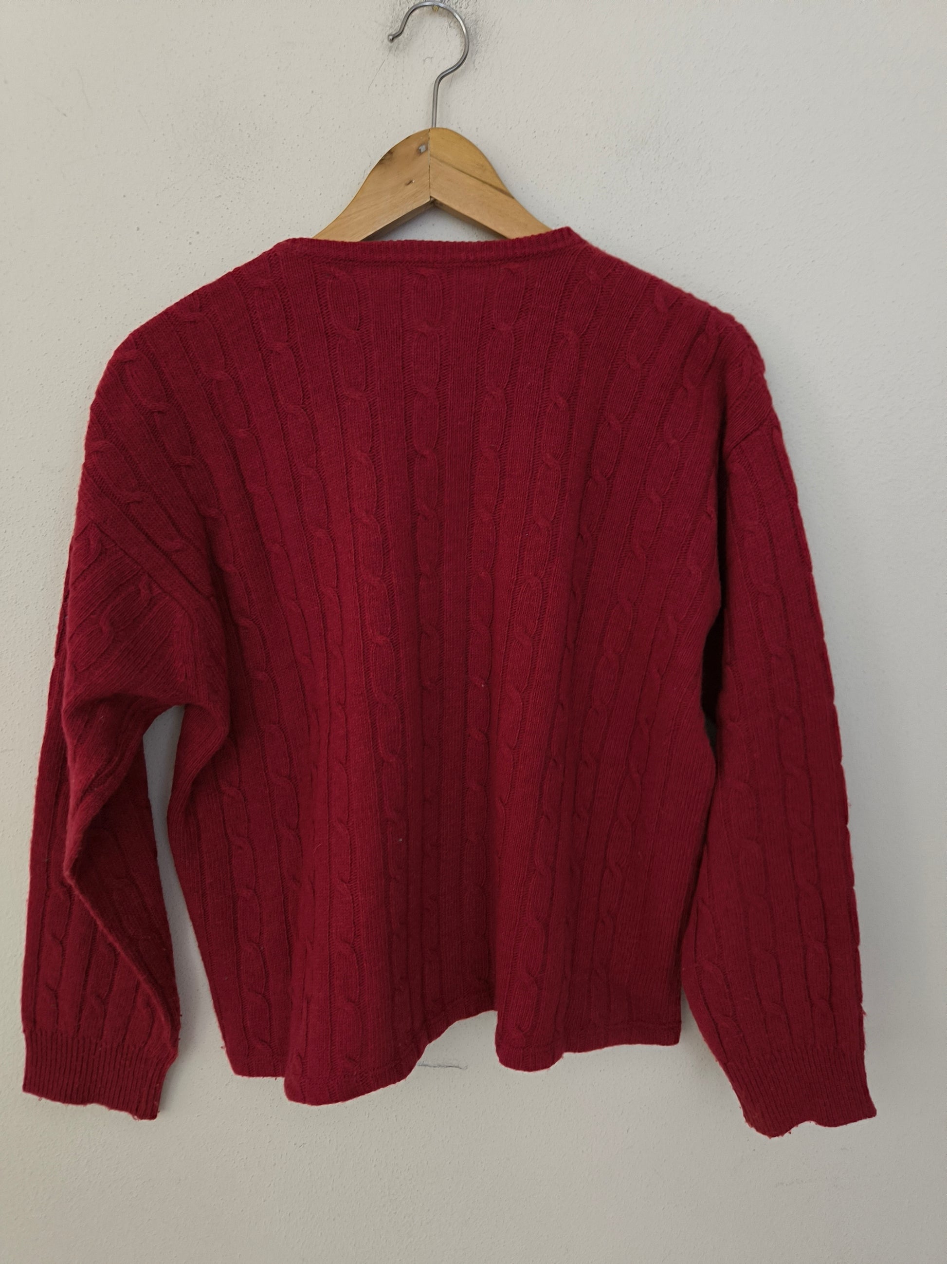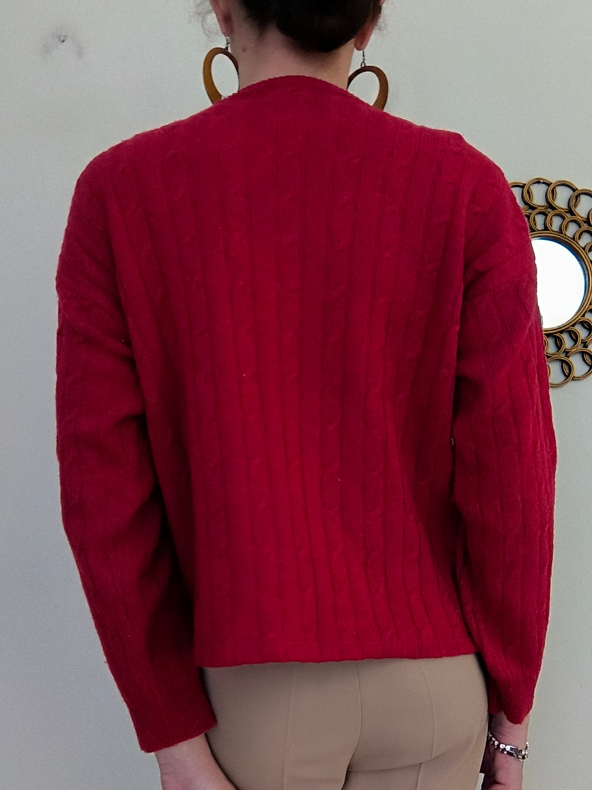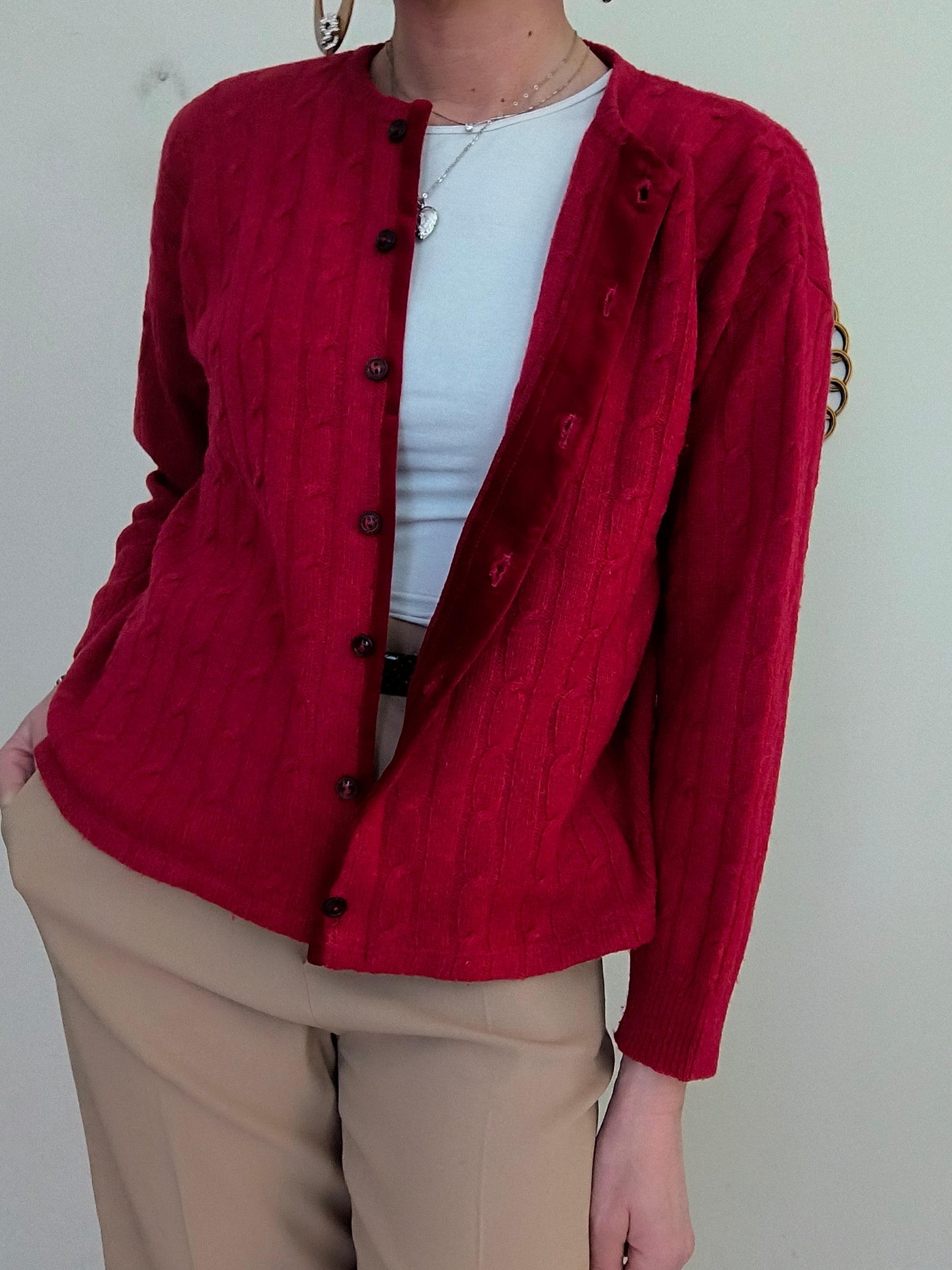 Cardigan Les Copains, colore rosso scuro, con velluto sulla linea dei bottoni che, molto finemente, appare anche quando si indossa sbottonato.