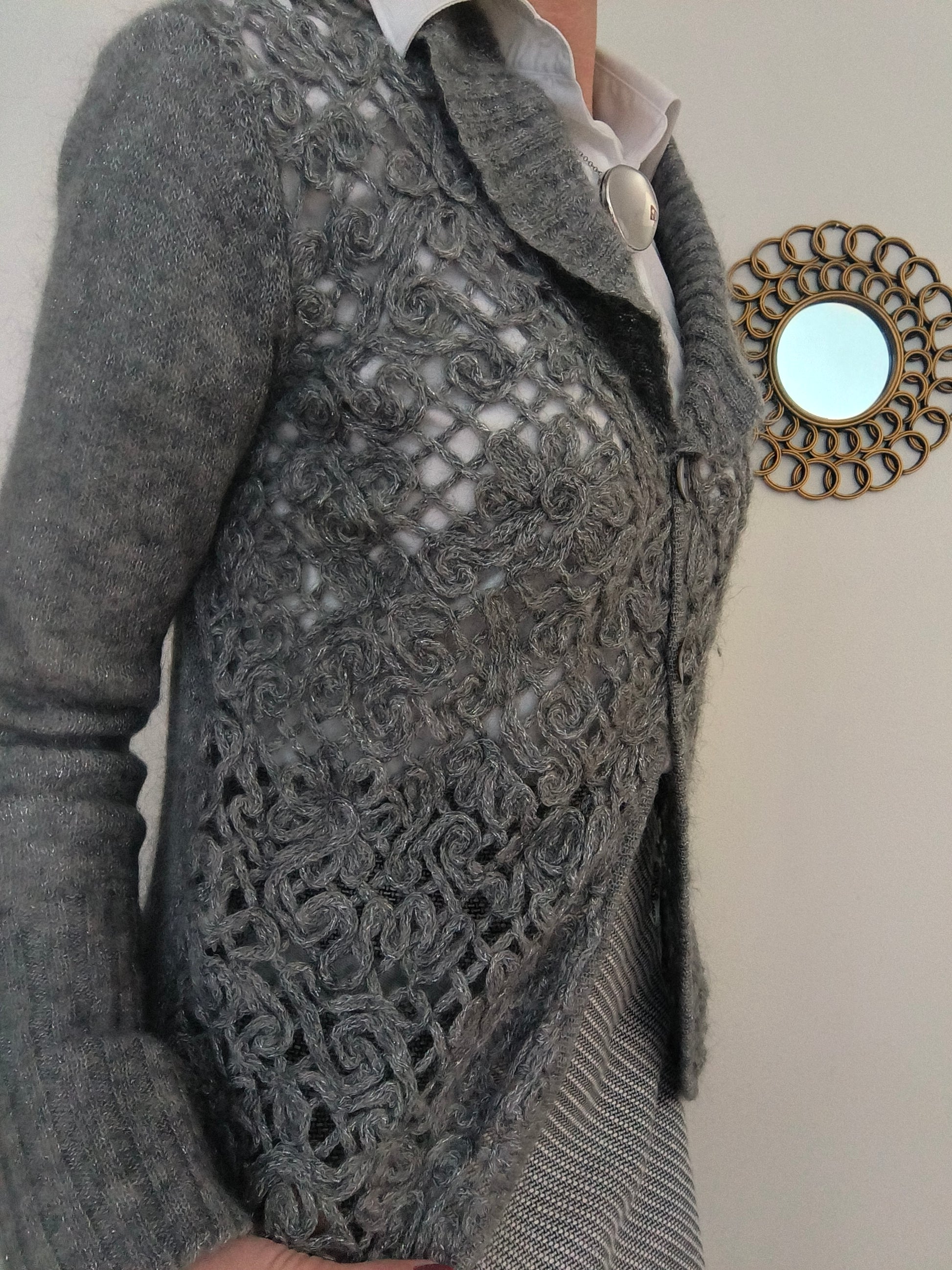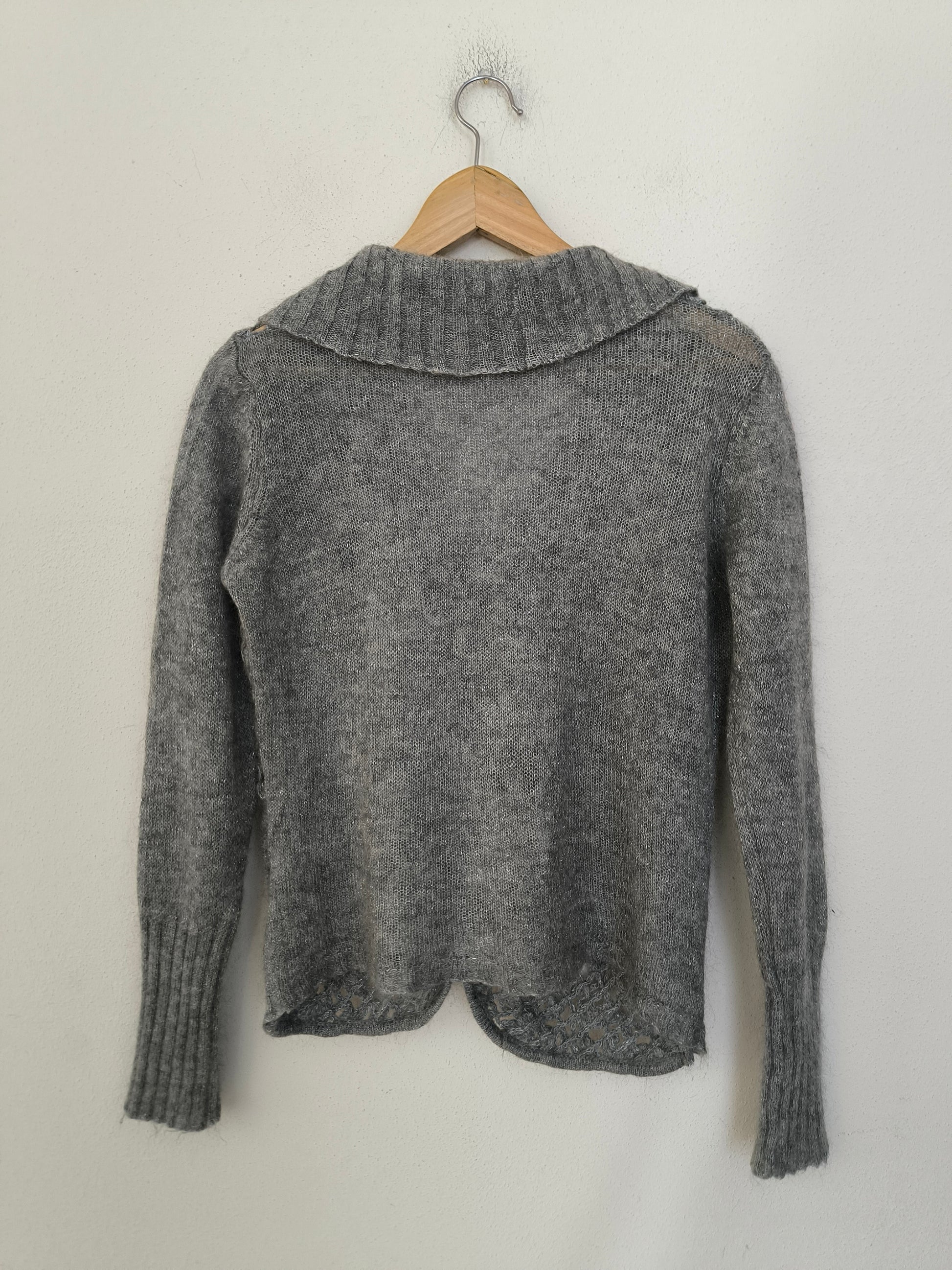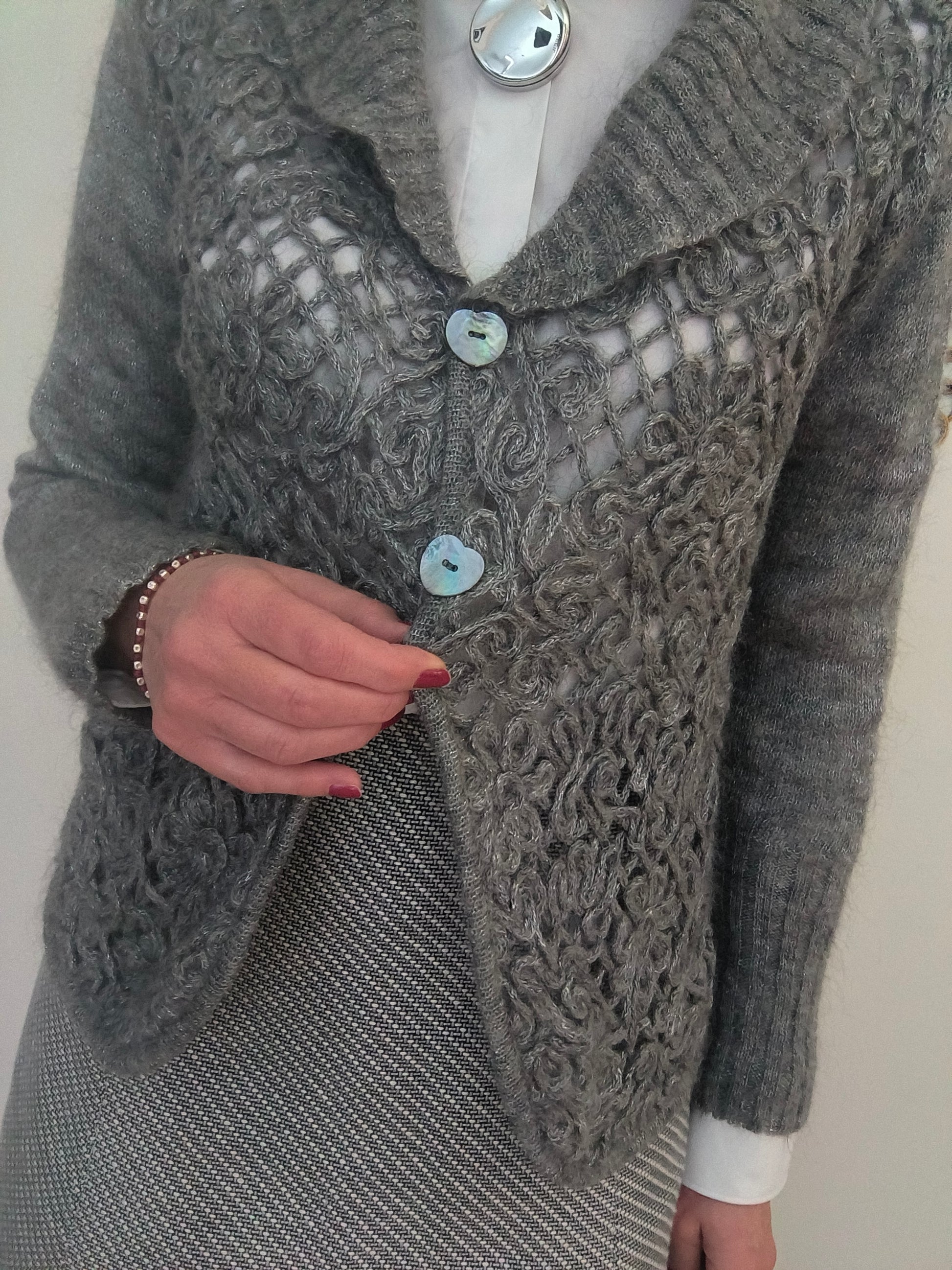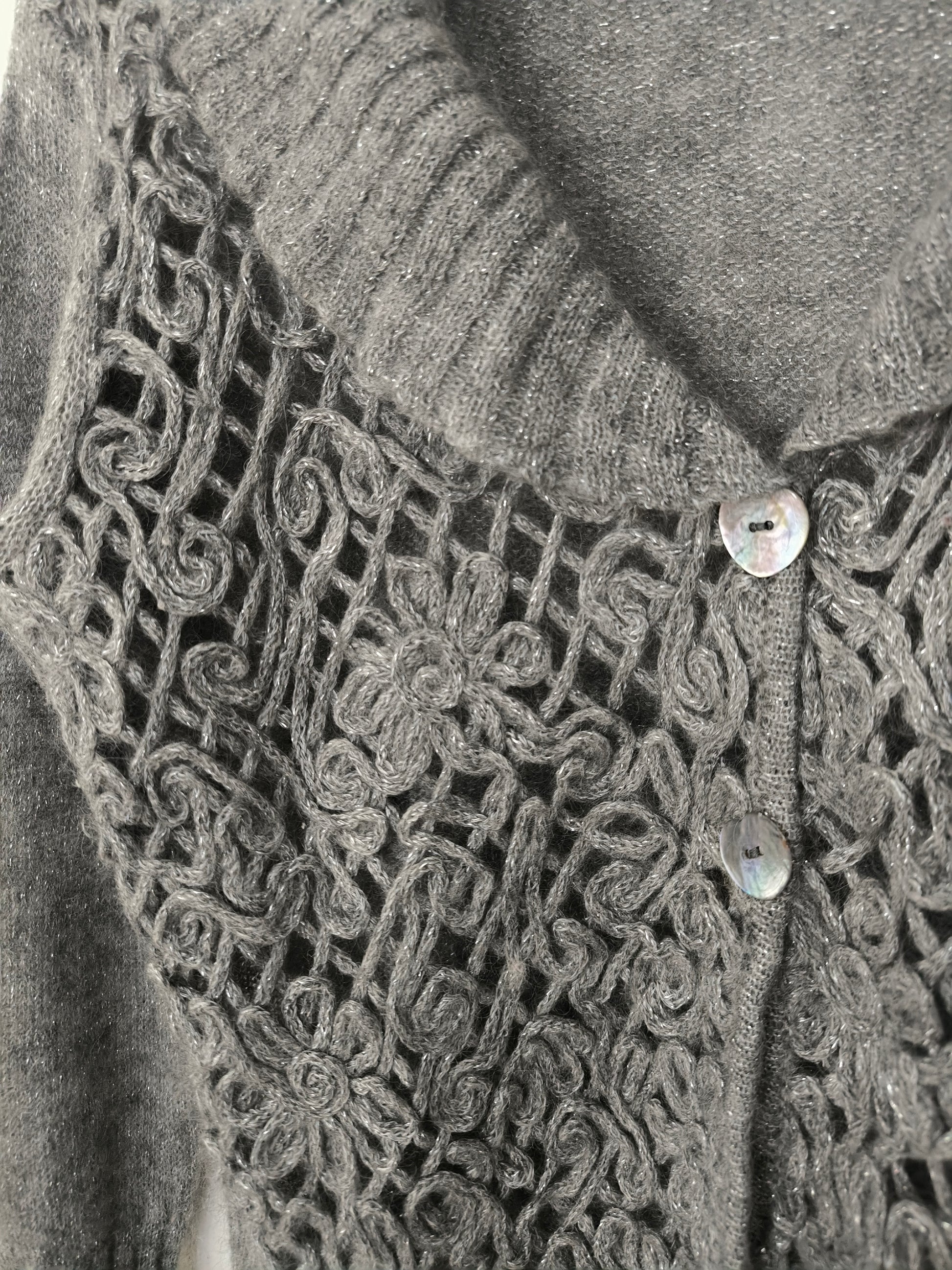 Maglioncino/cardigan, in tessuto morbidissimo, misto mohair, lavorato a telaio, colore grigio con leggeri fili argentati.