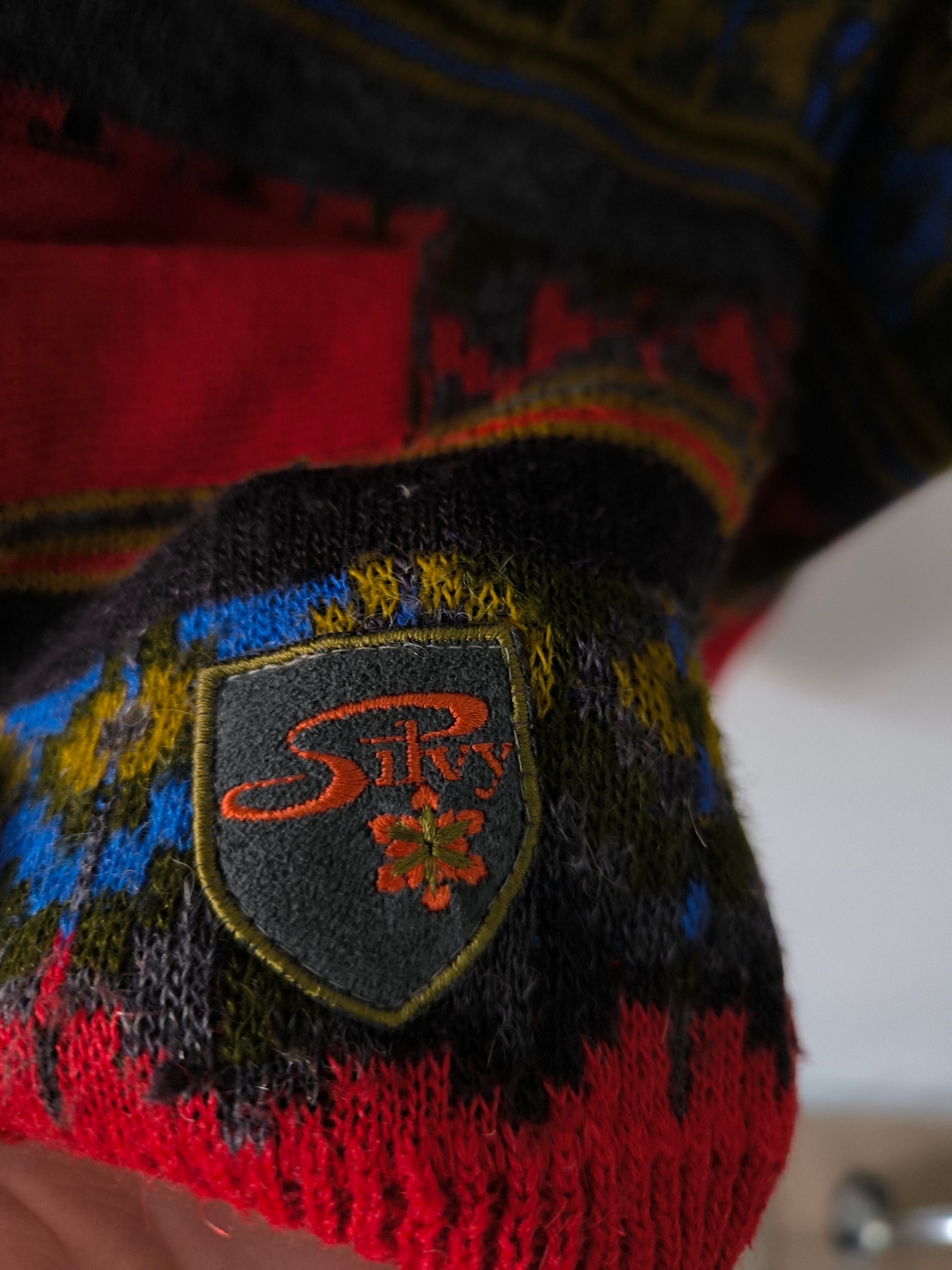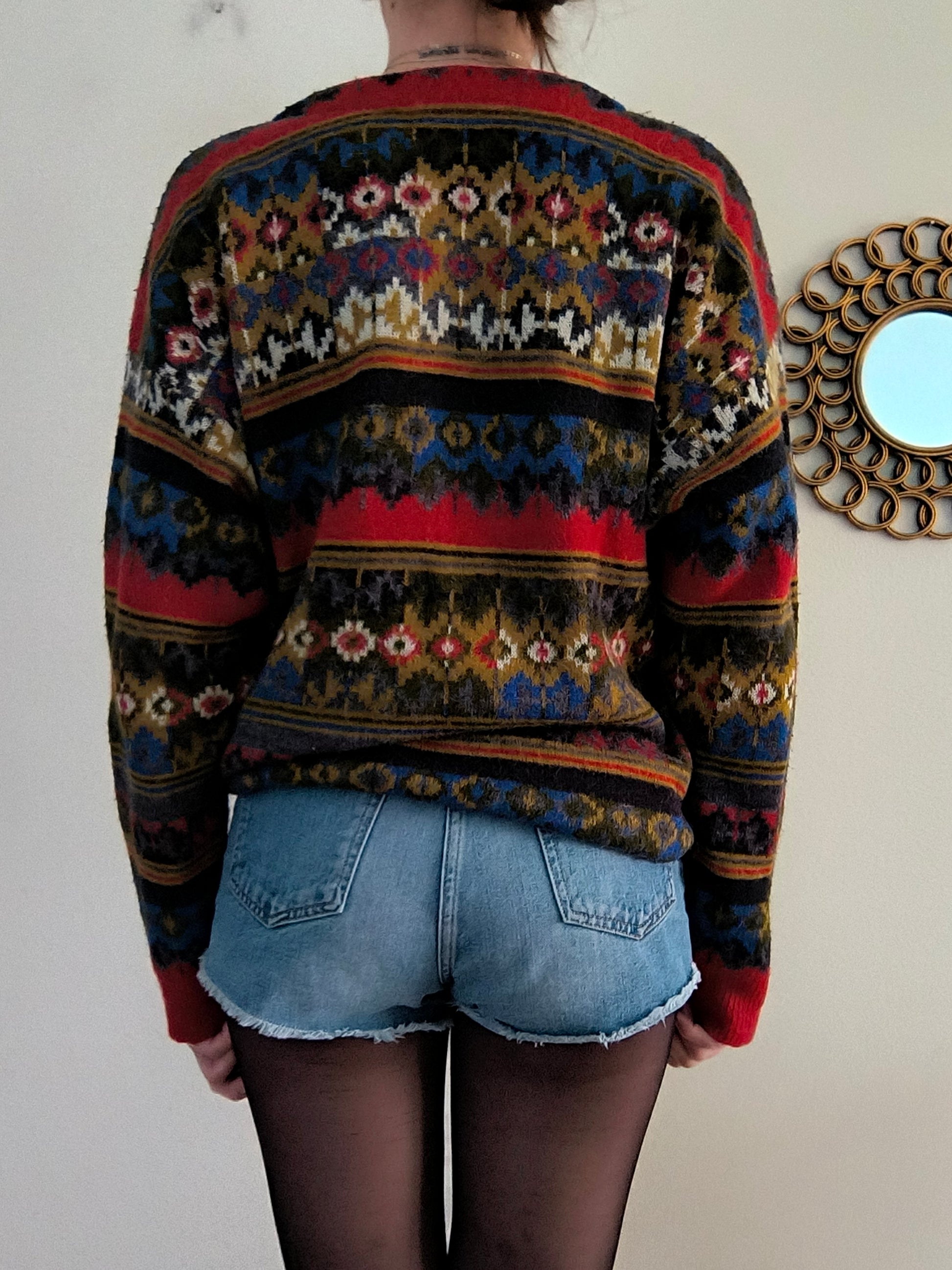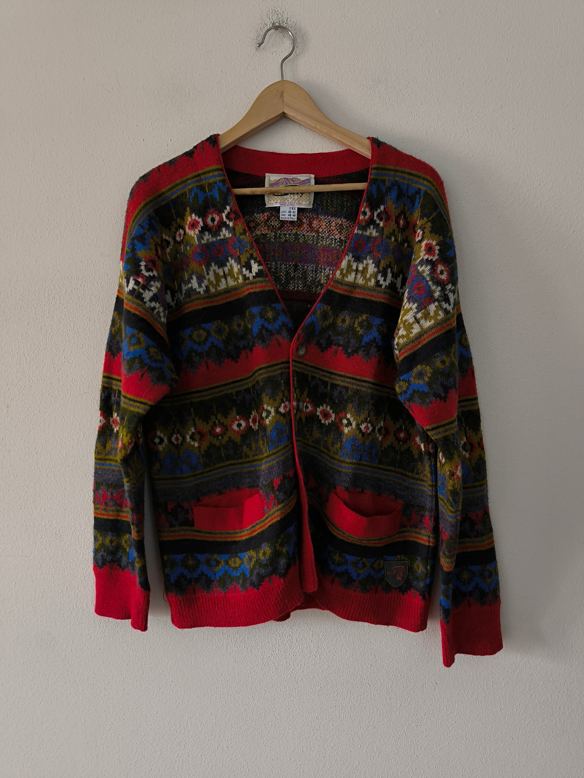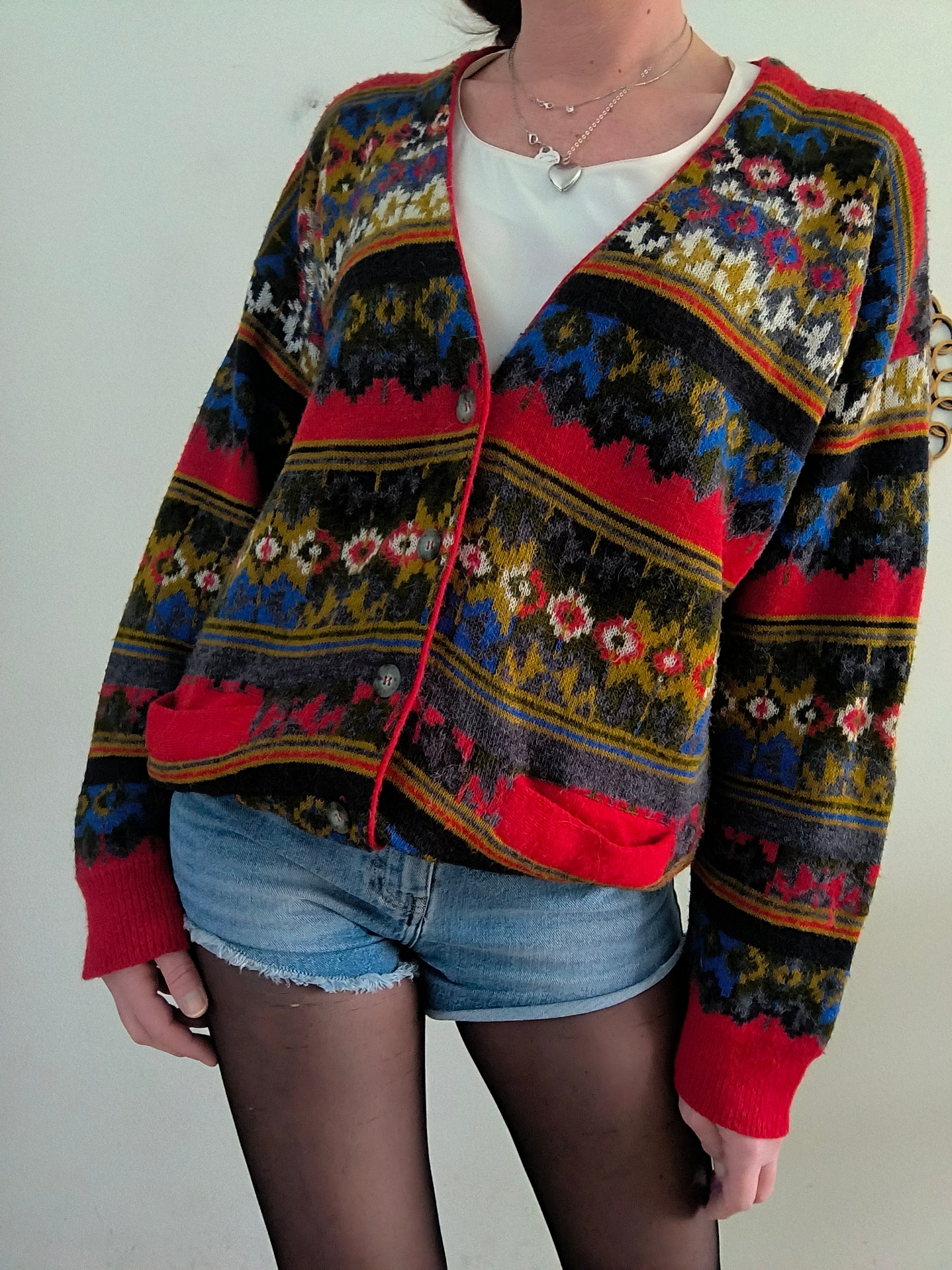 Cardigan vintage fantasia in lana alpaca, multicolore con piccole taschine sul davanti.