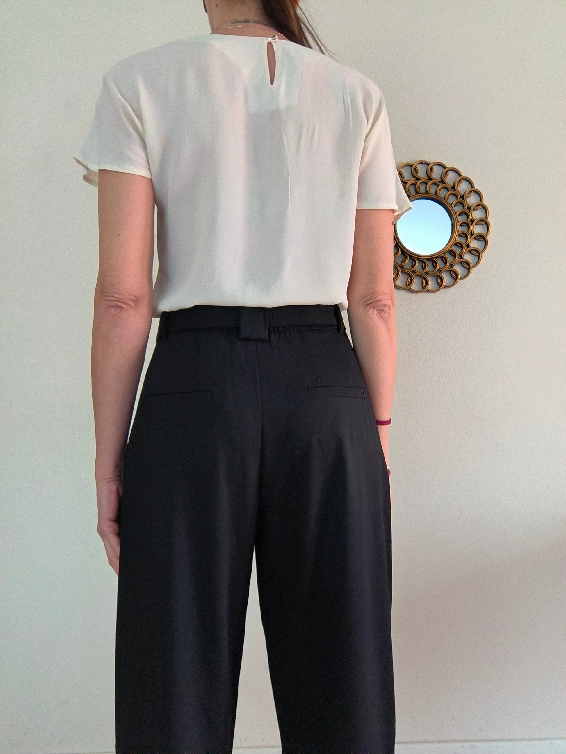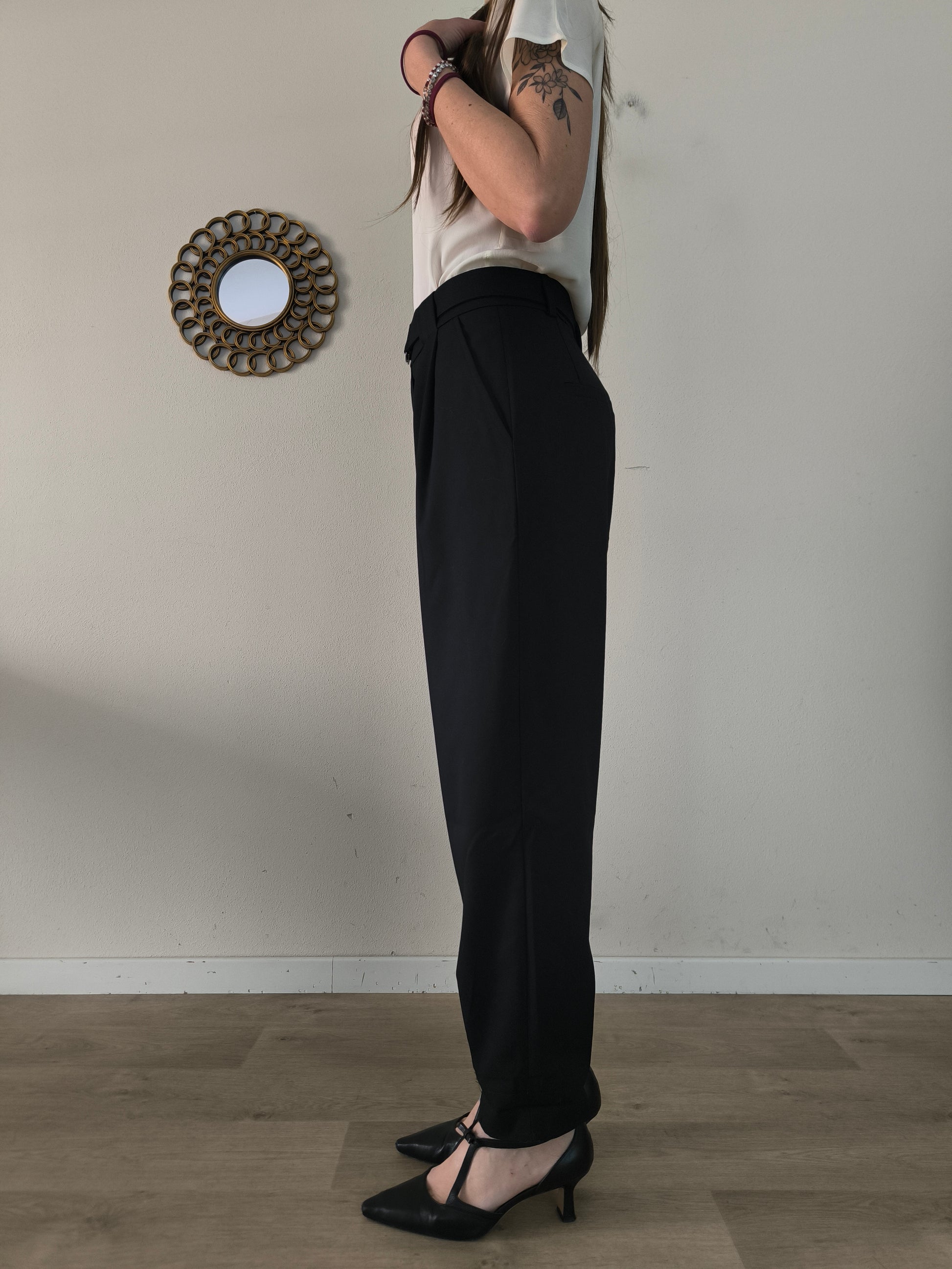Pantalone nero Future, gamba ampia, morbido al bacino con pences, grandi passanti in tessuto x cintura e tasche laterali.