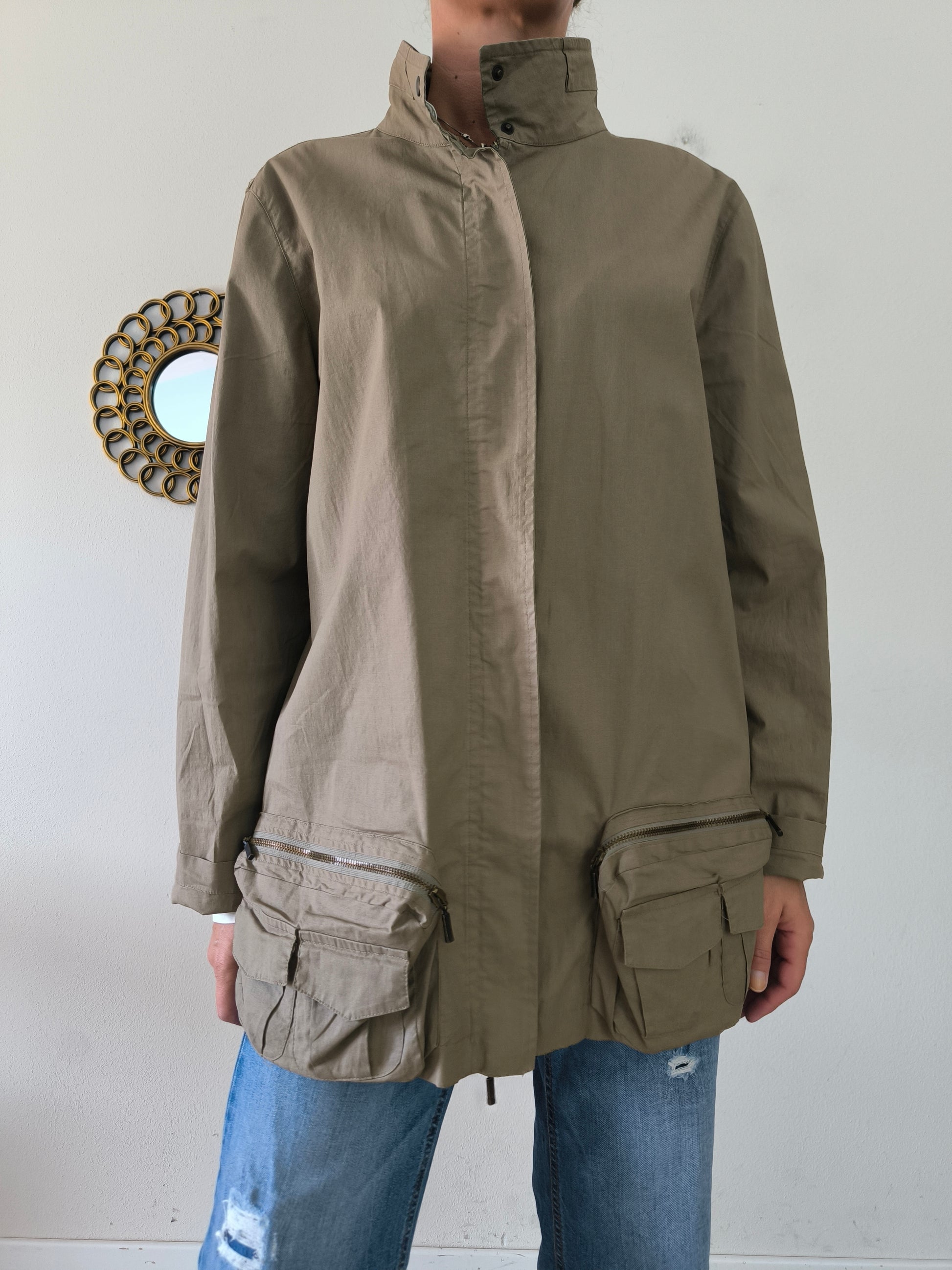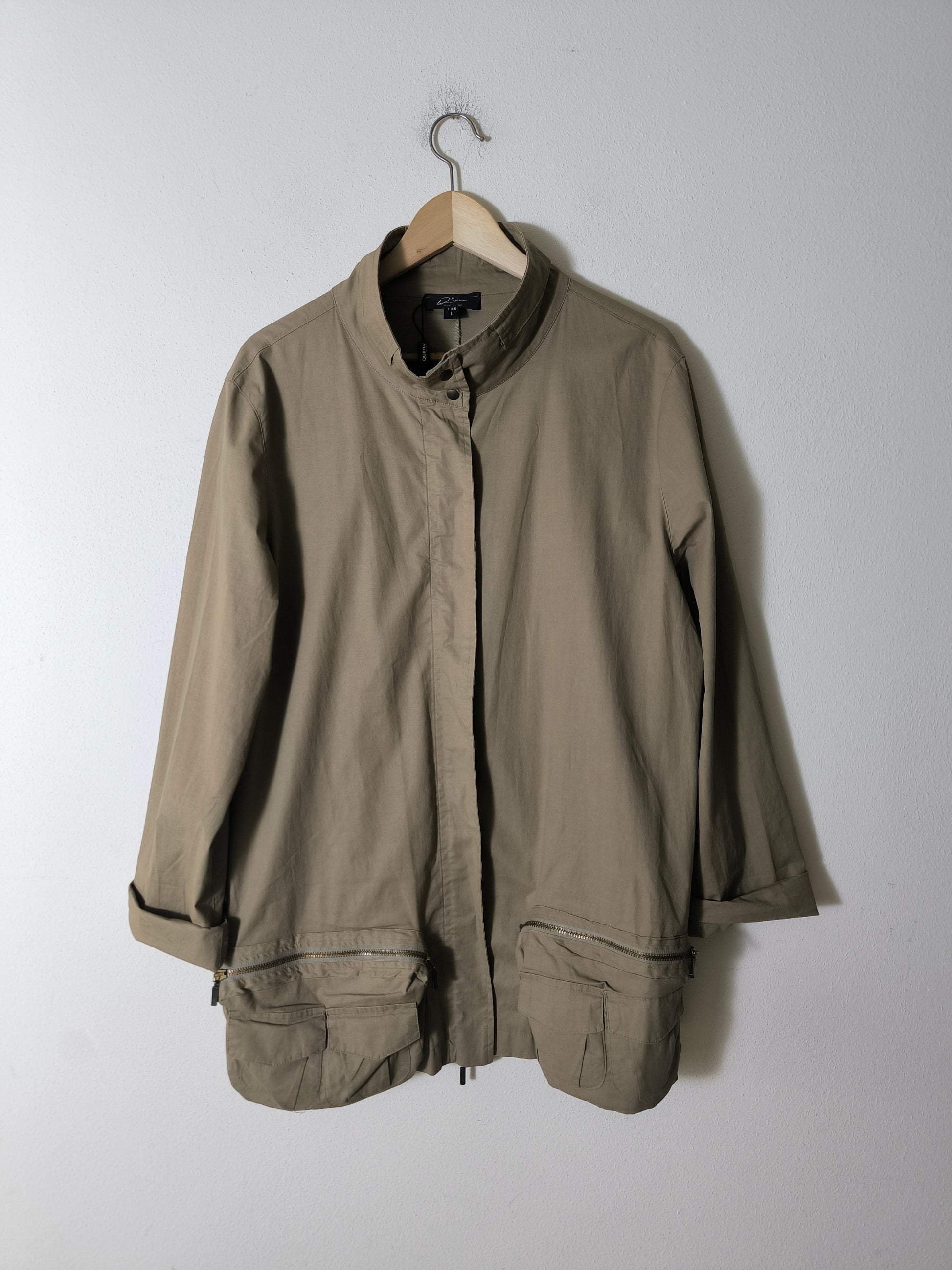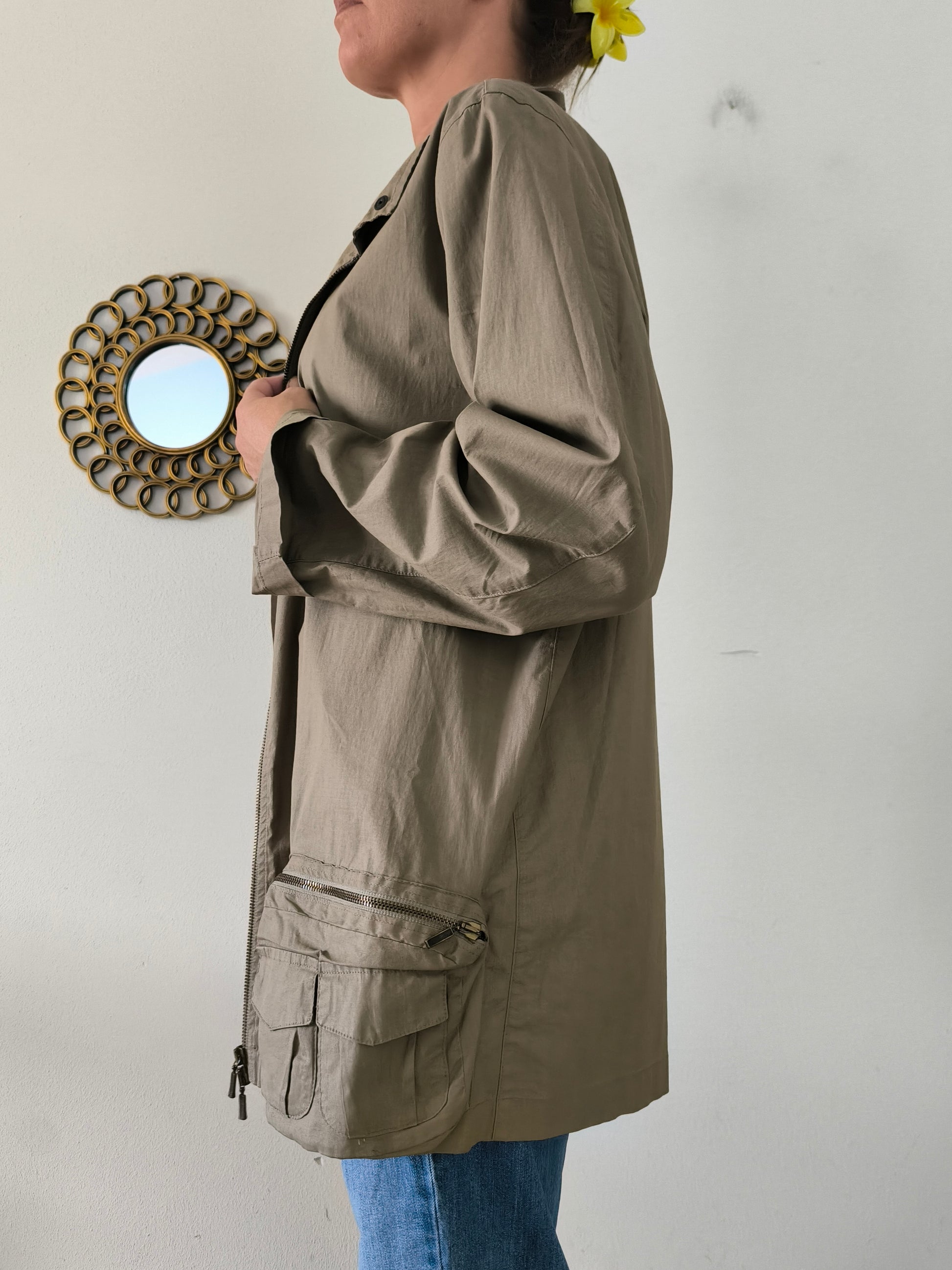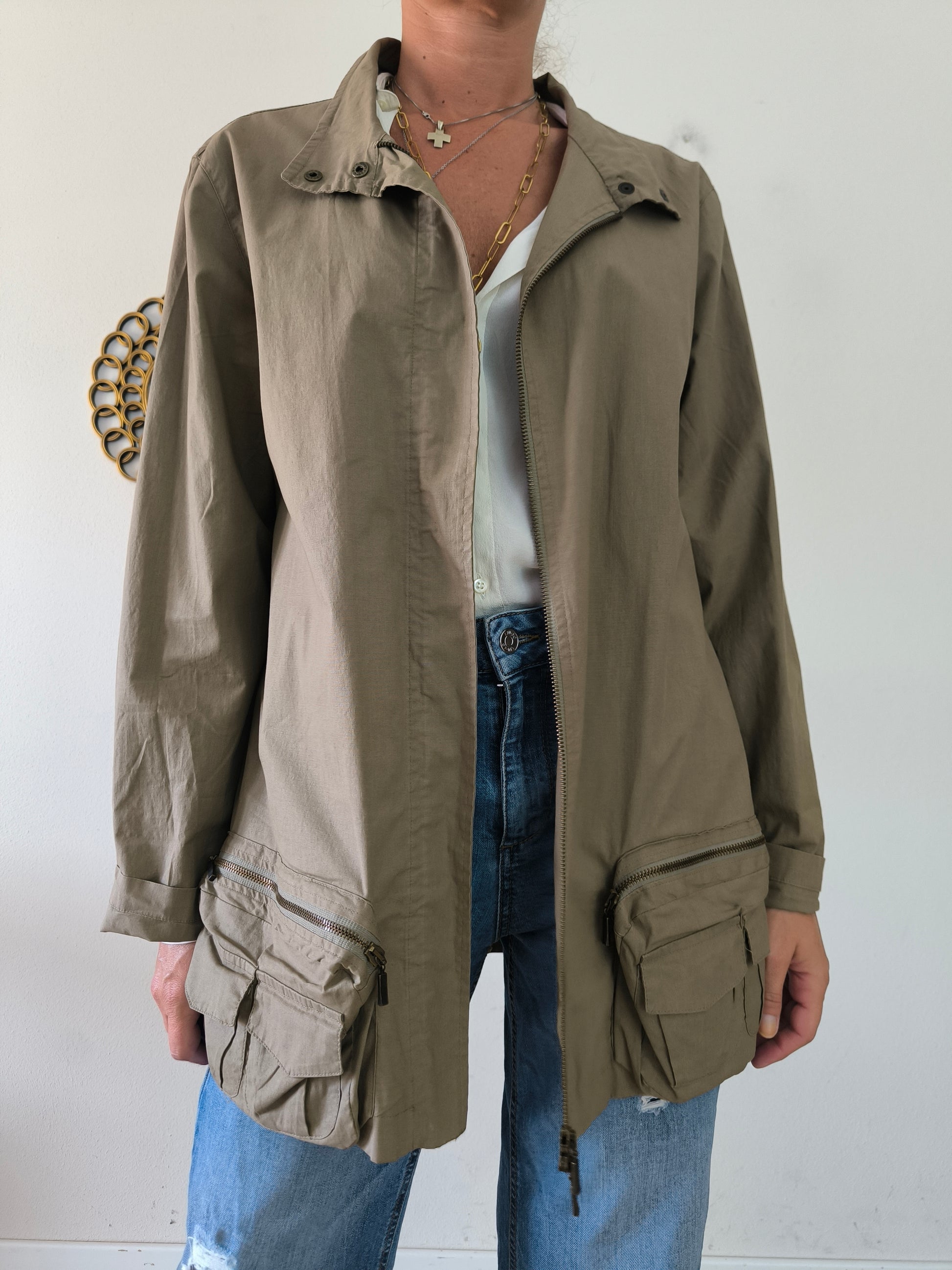 Giacca Qubha, in cotone con minima percentuale di elastane, color tortora con zip sul davanti e multitasche basse .
