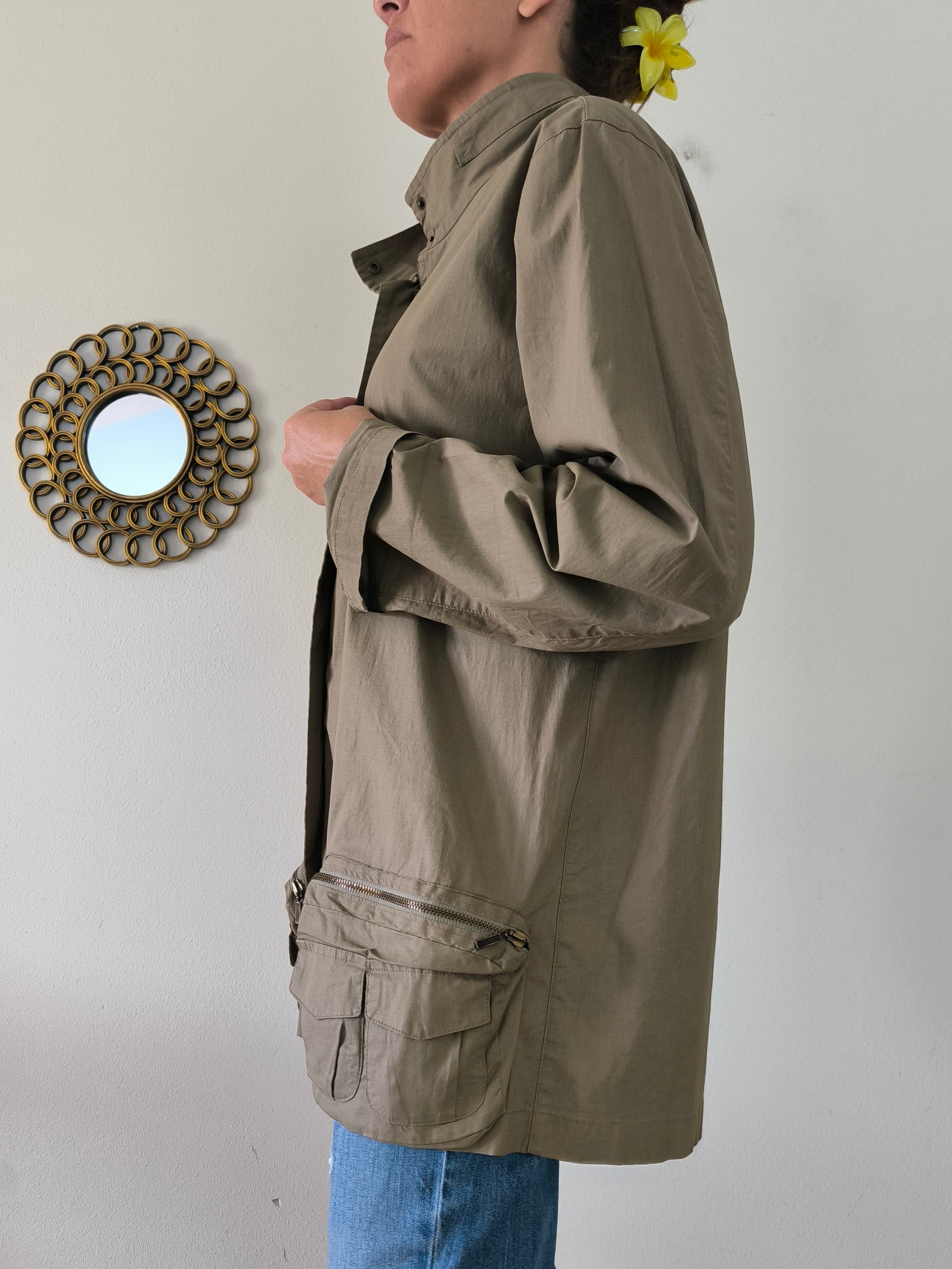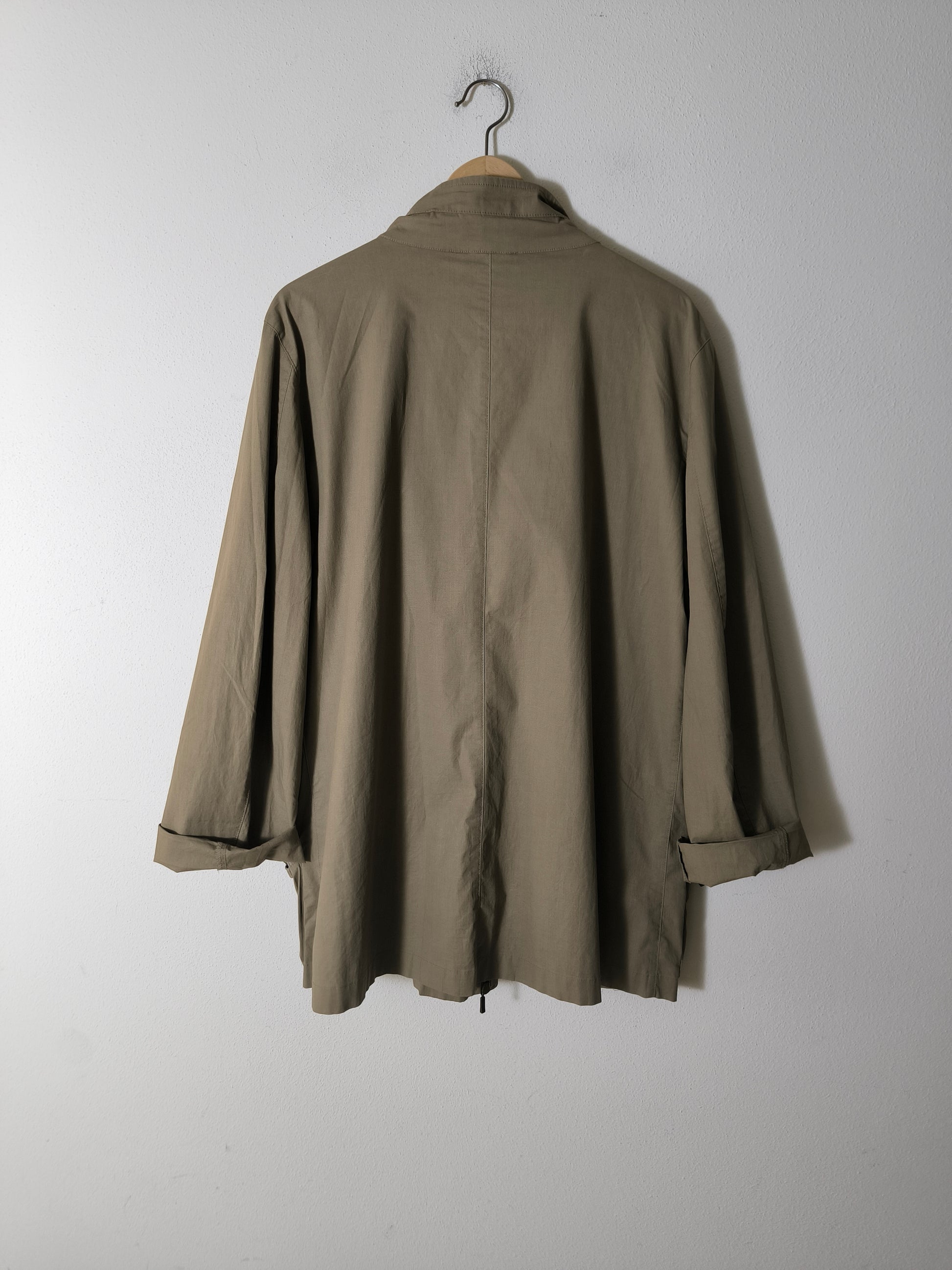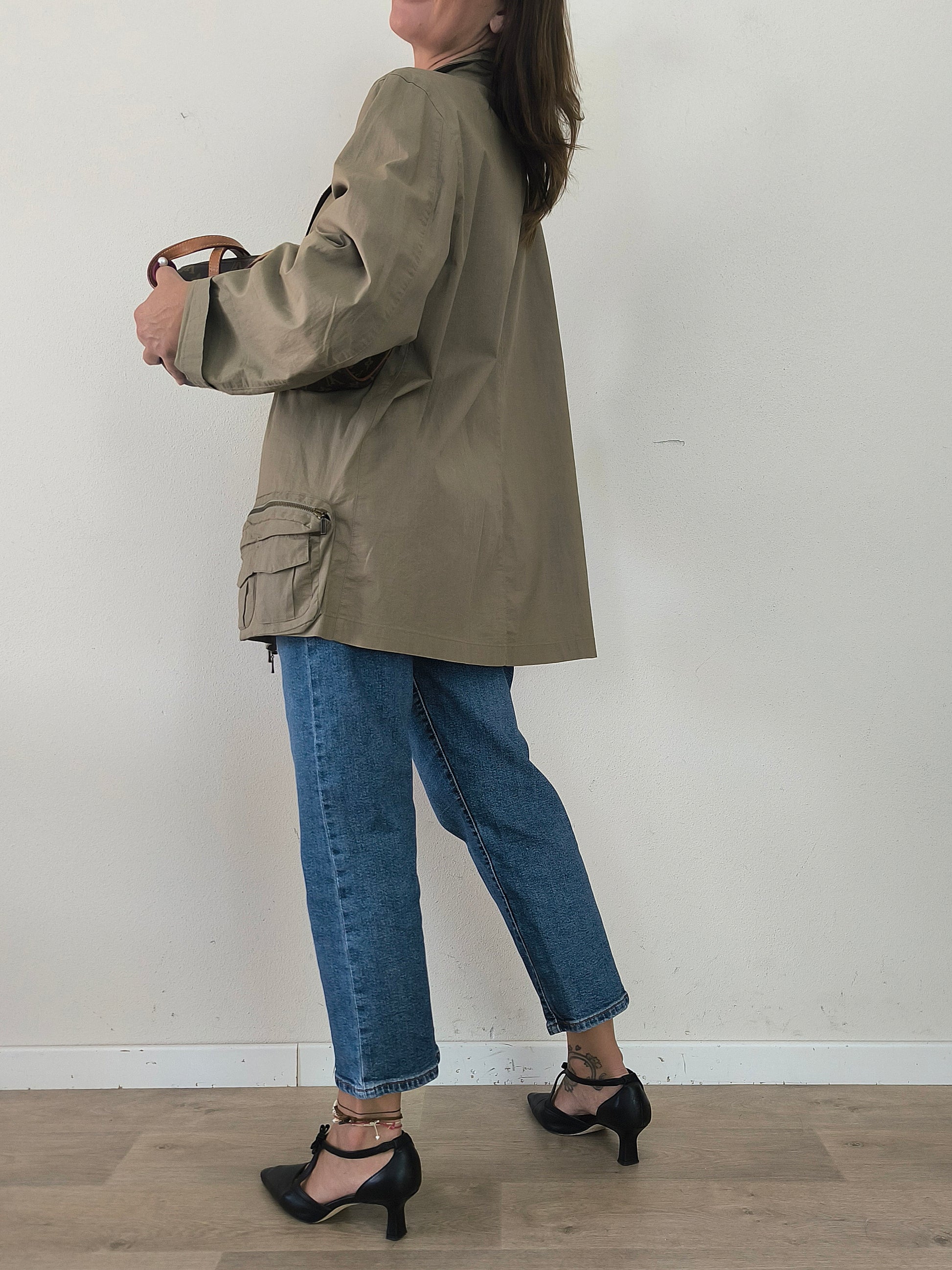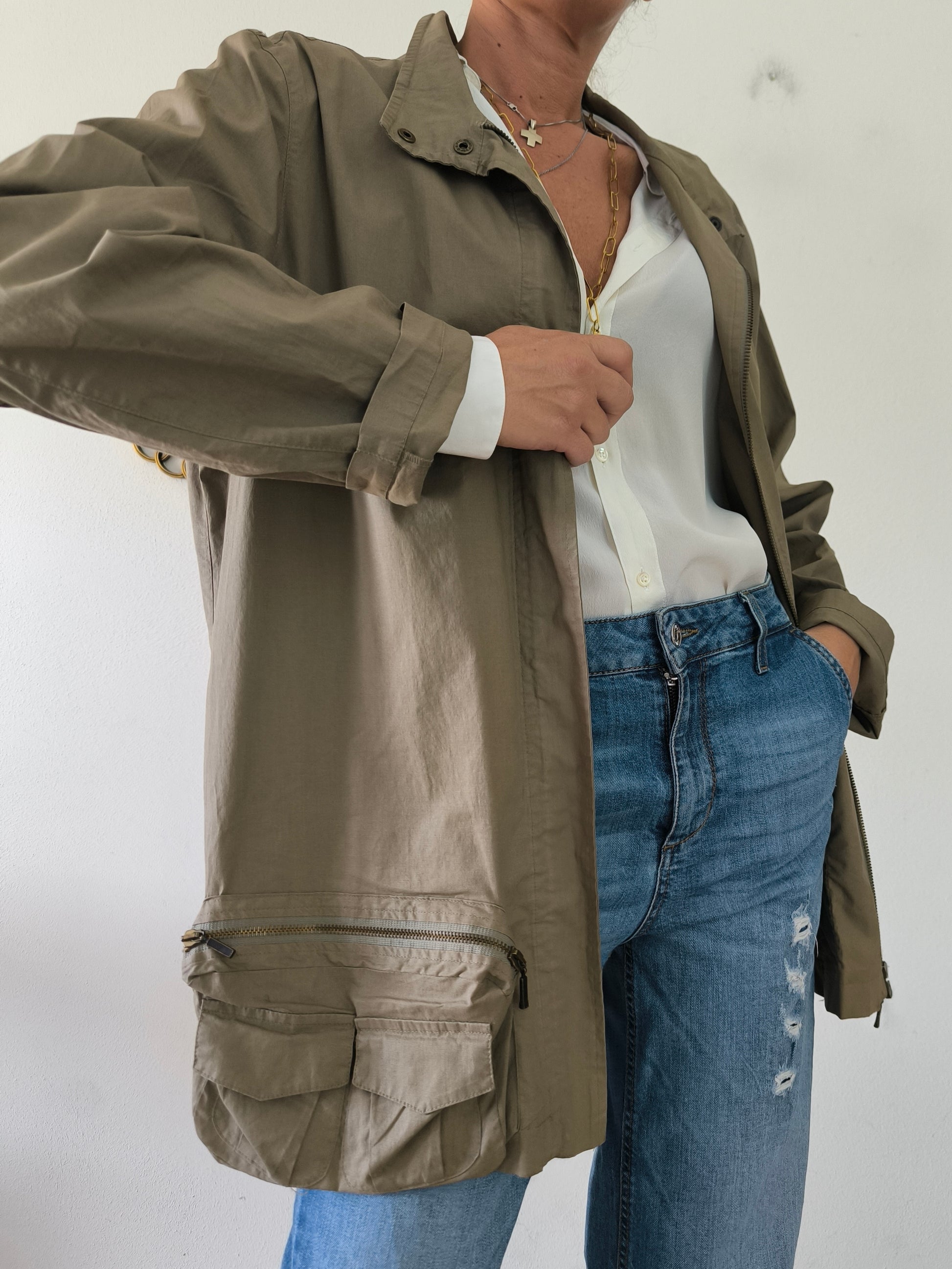 Giacca Qubha, in cotone con minima percentuale di elastane, color tortora con zip sul davanti e multitasche basse .