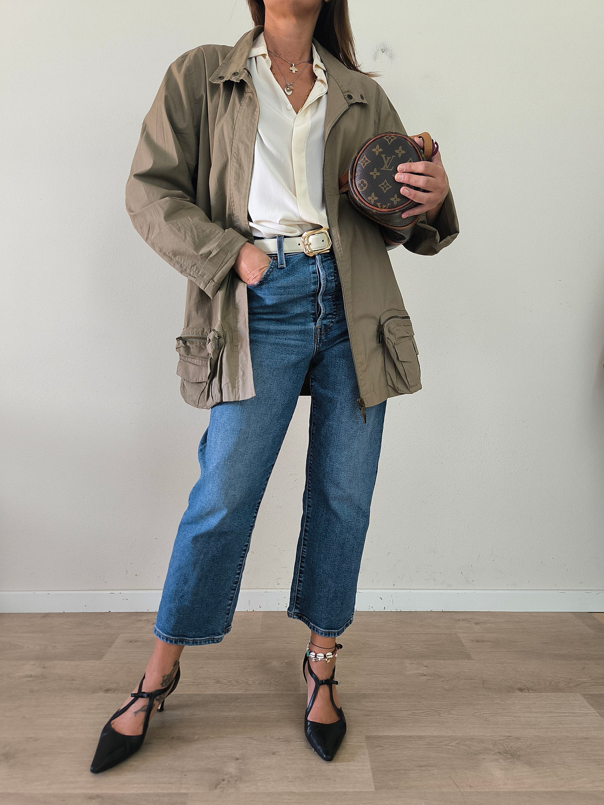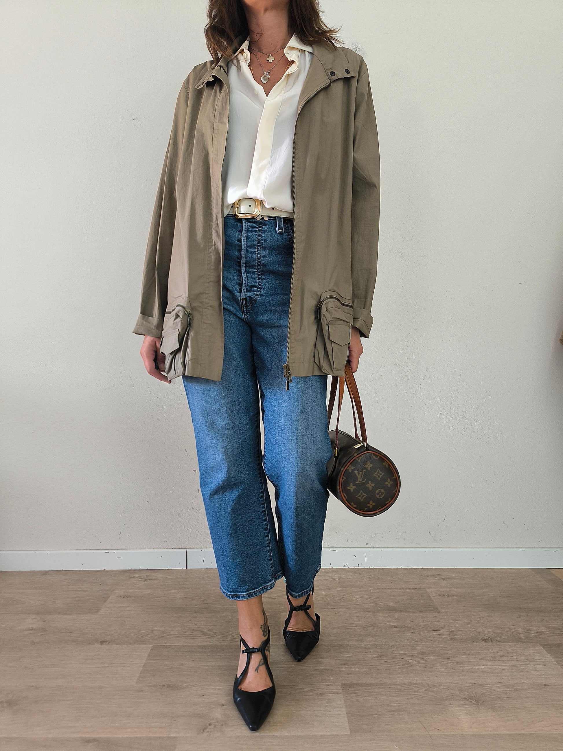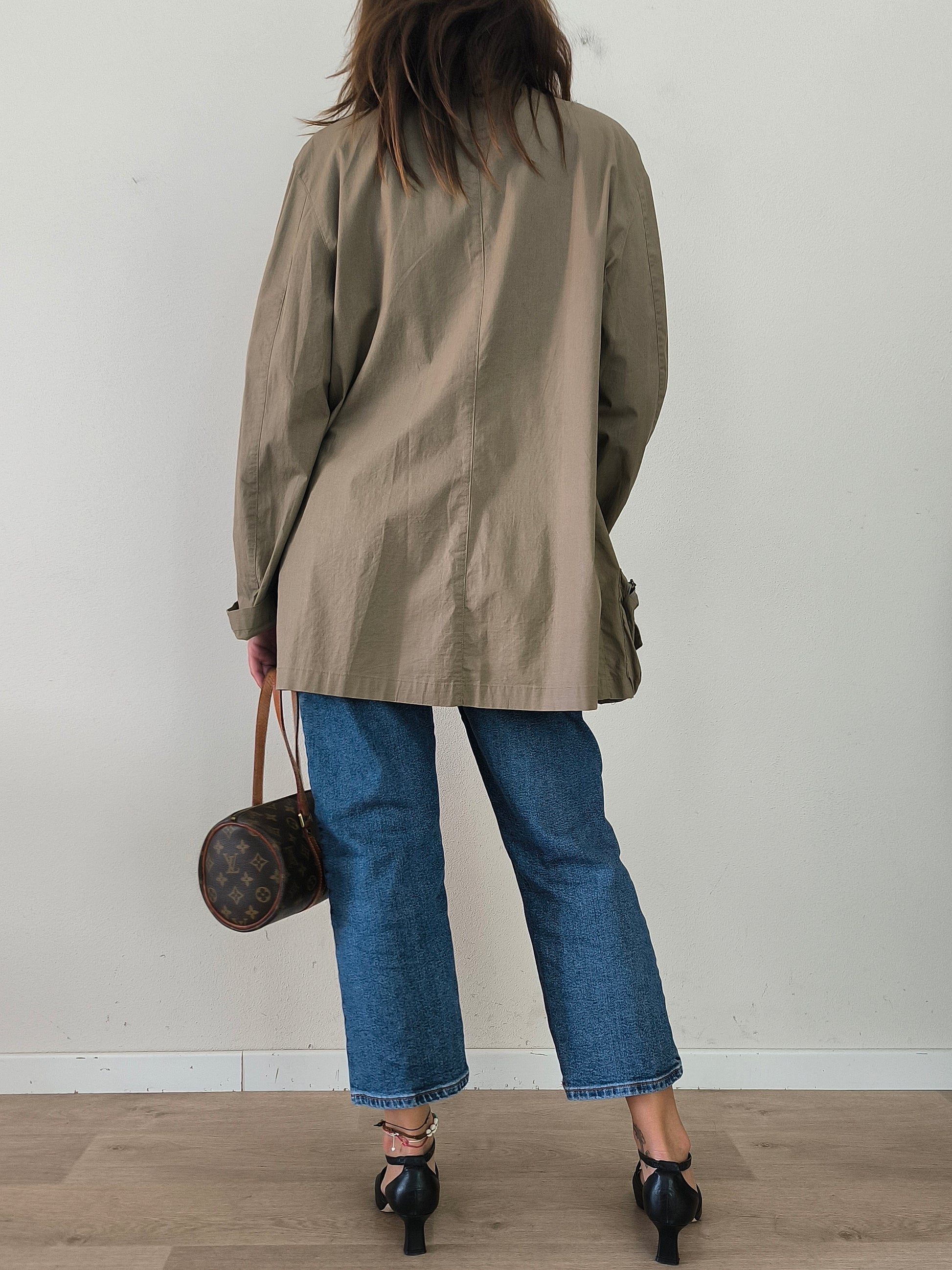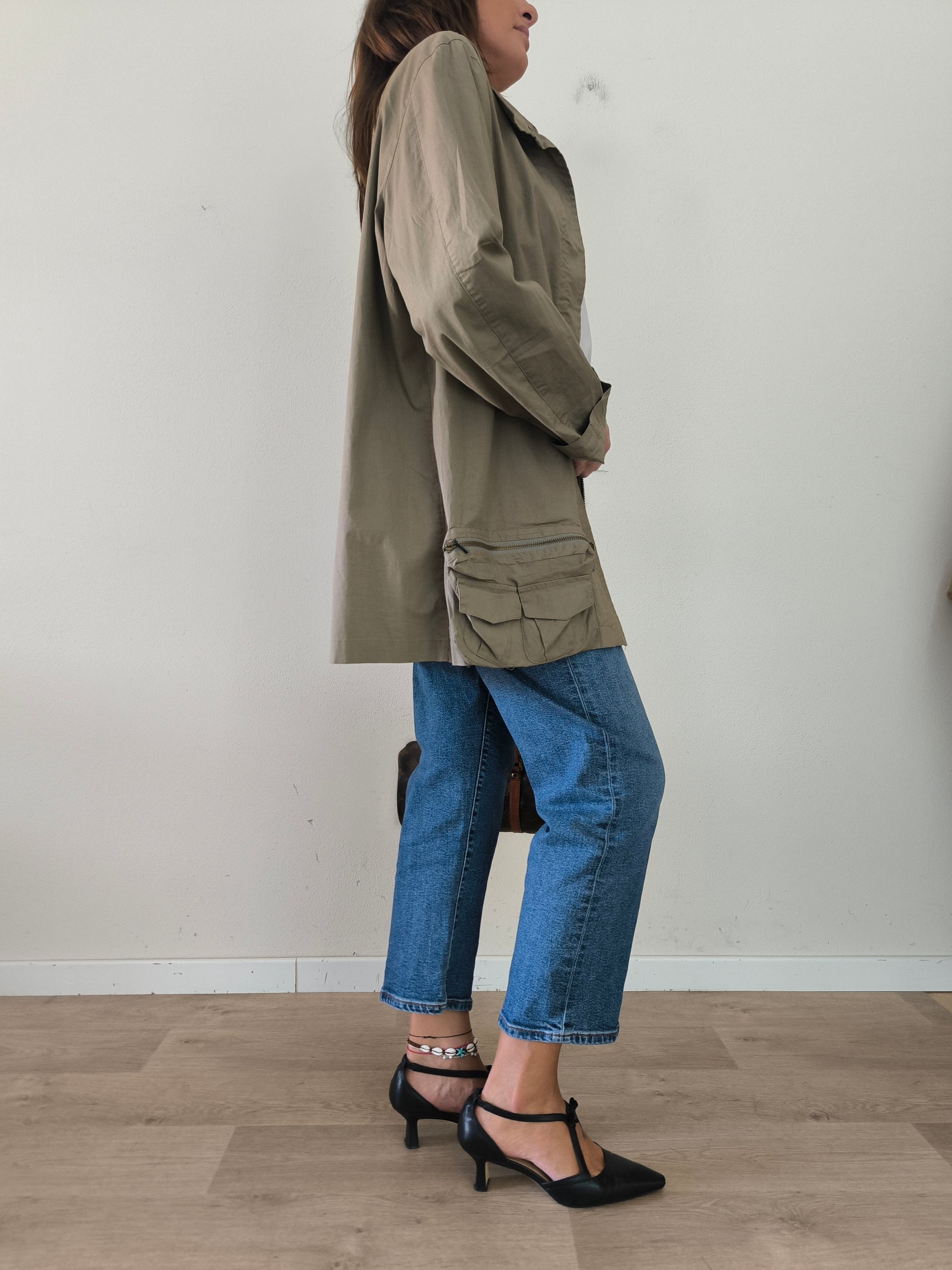 Giacca Qubha, in cotone con minima percentuale di elastane, color tortora con zip sul davanti e multitasche basse .