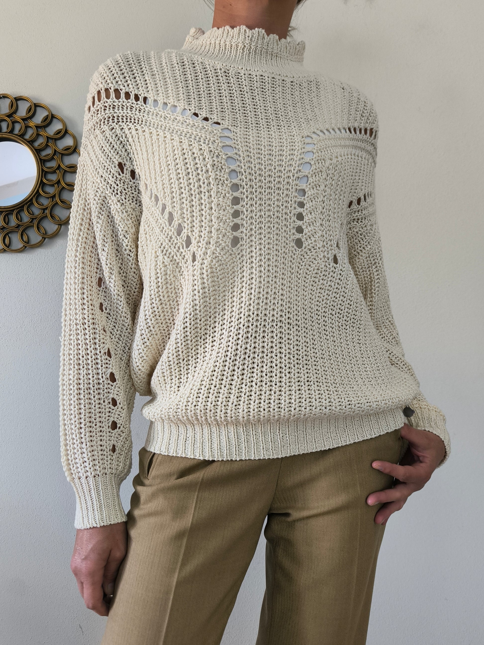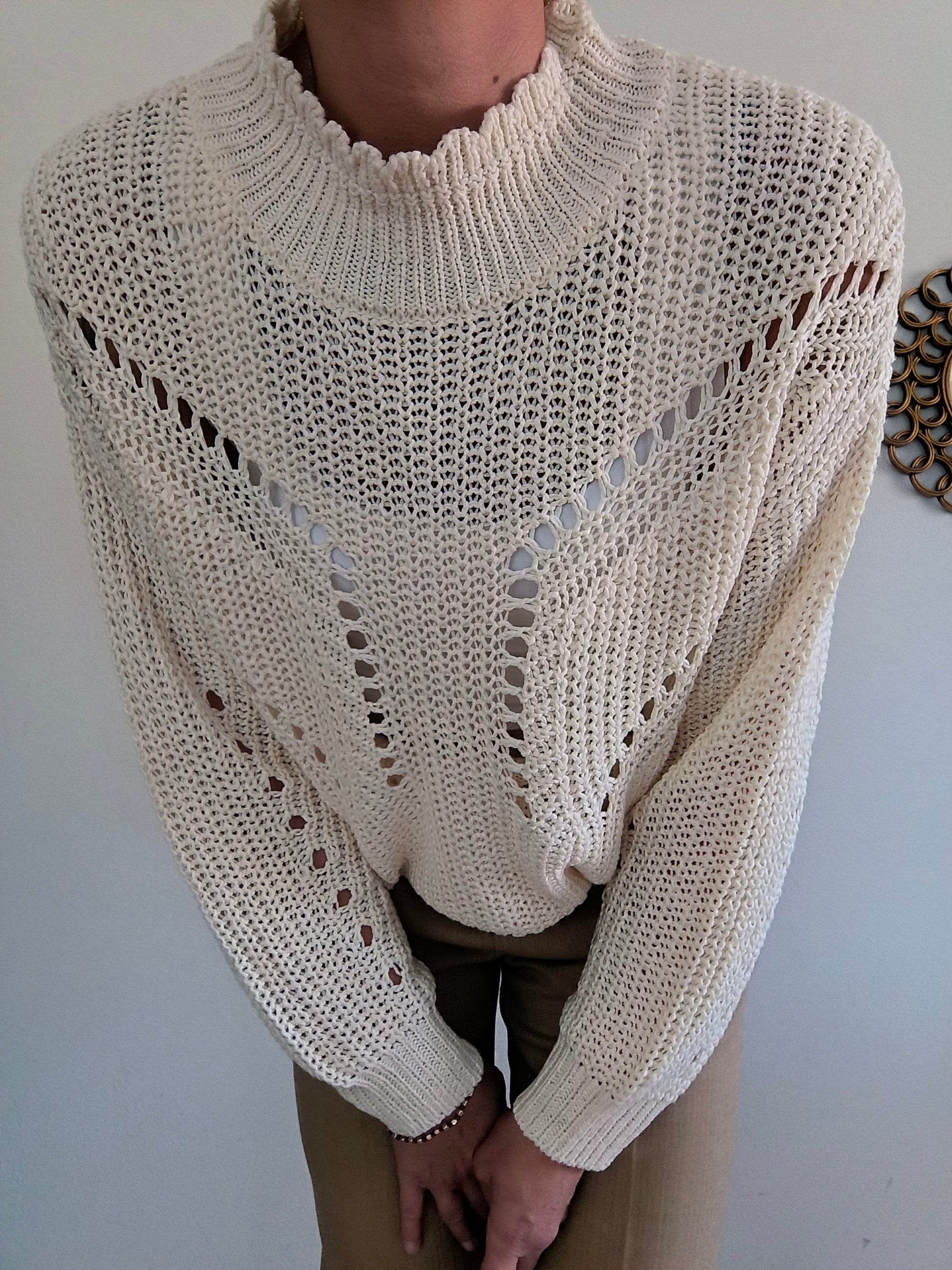 Romantico maglione in cotone, color panna, Nice & chic, lavorazione leggermente traforata, collo ondulato.