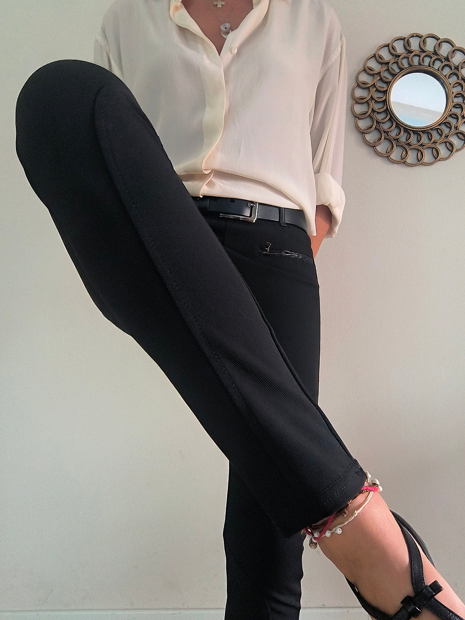 Cuciture sulla gamba a vista.