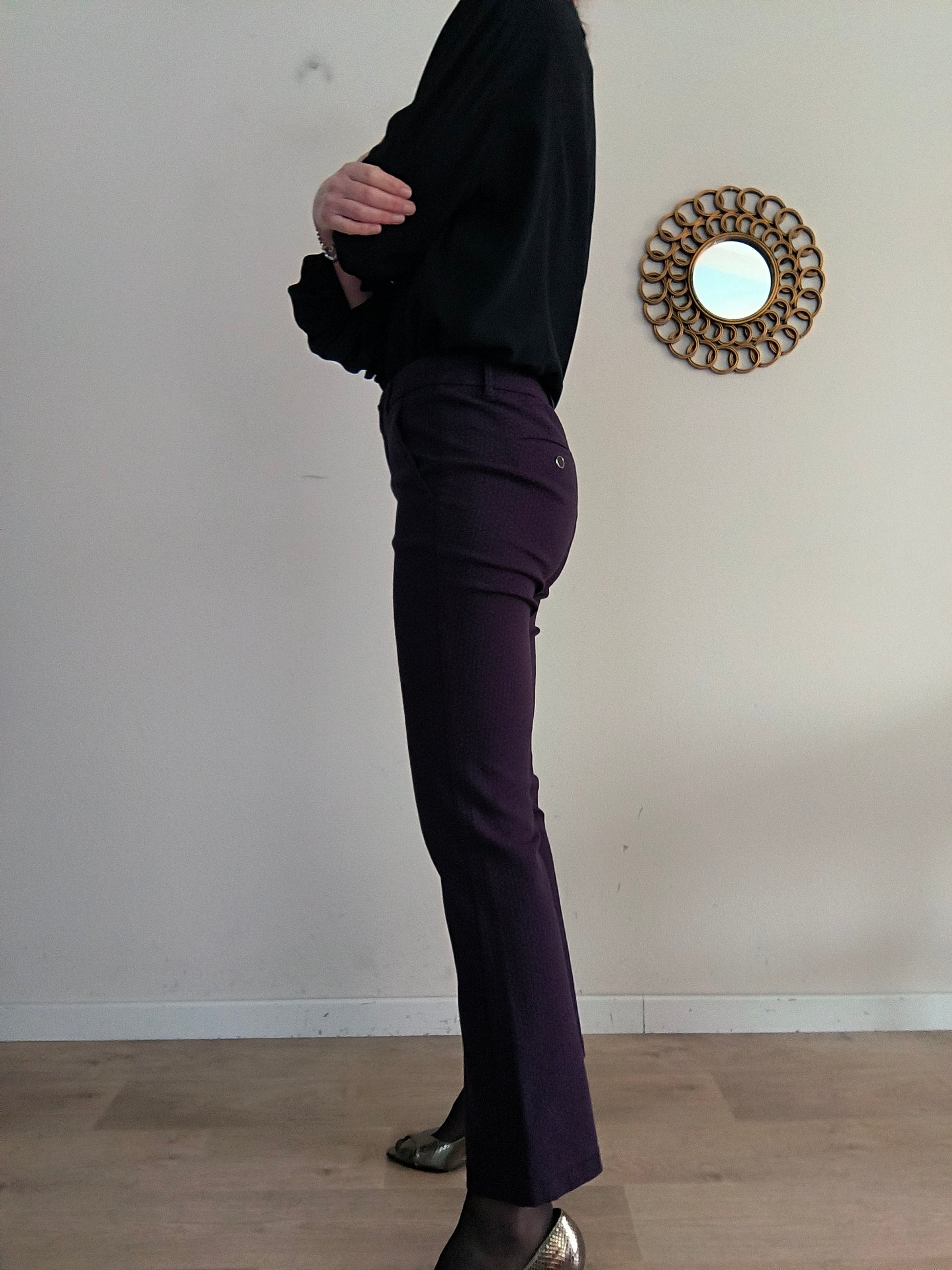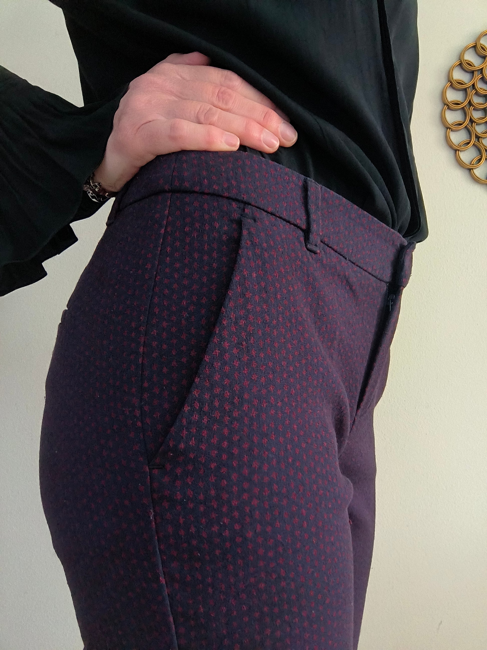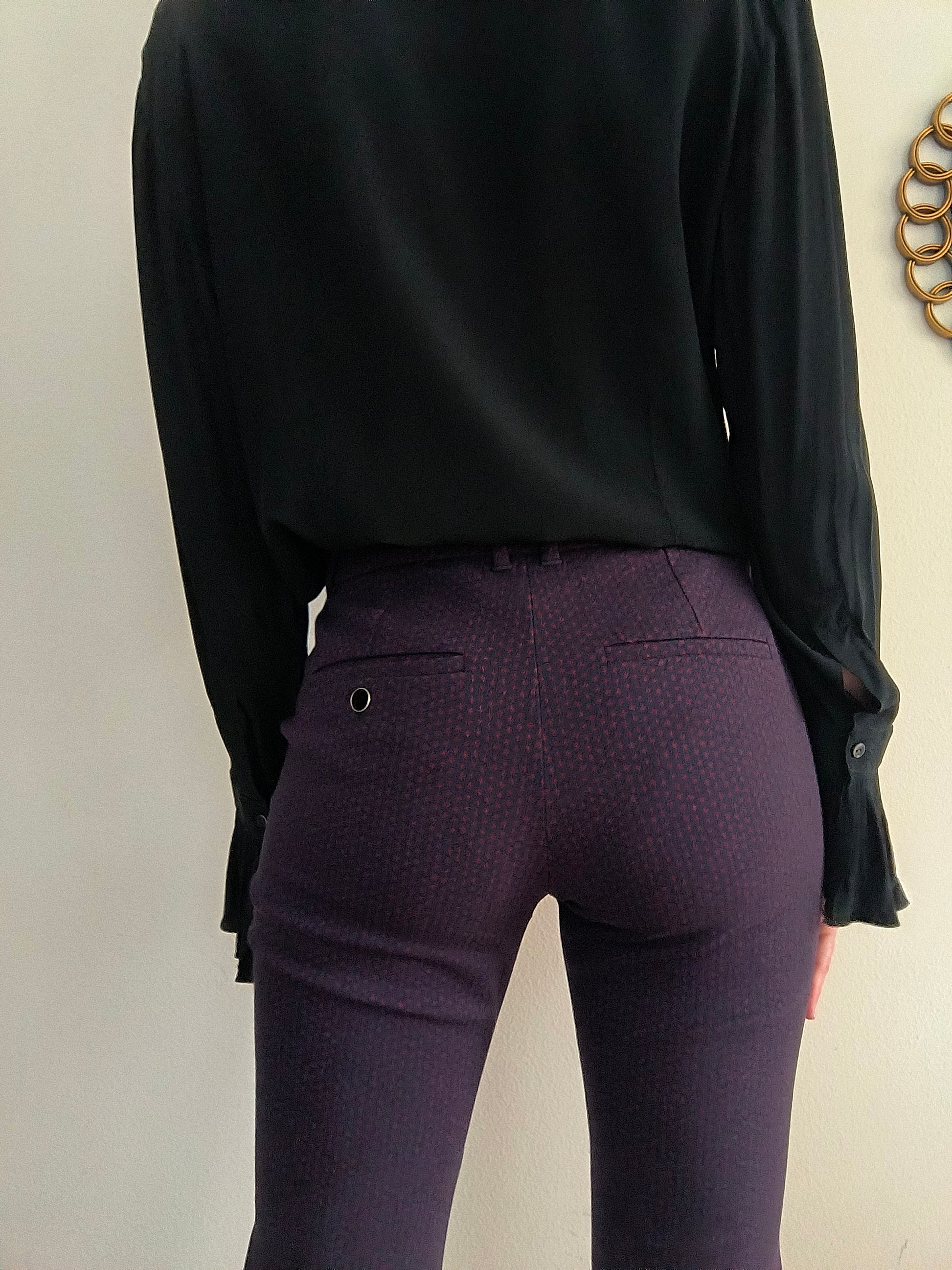Pantalone Marella, colore blu puntinato in borgogna ( per questo dalle foto sembra melanzana. Ho fatto del mio meglio) vita media, linea leggermente flare.