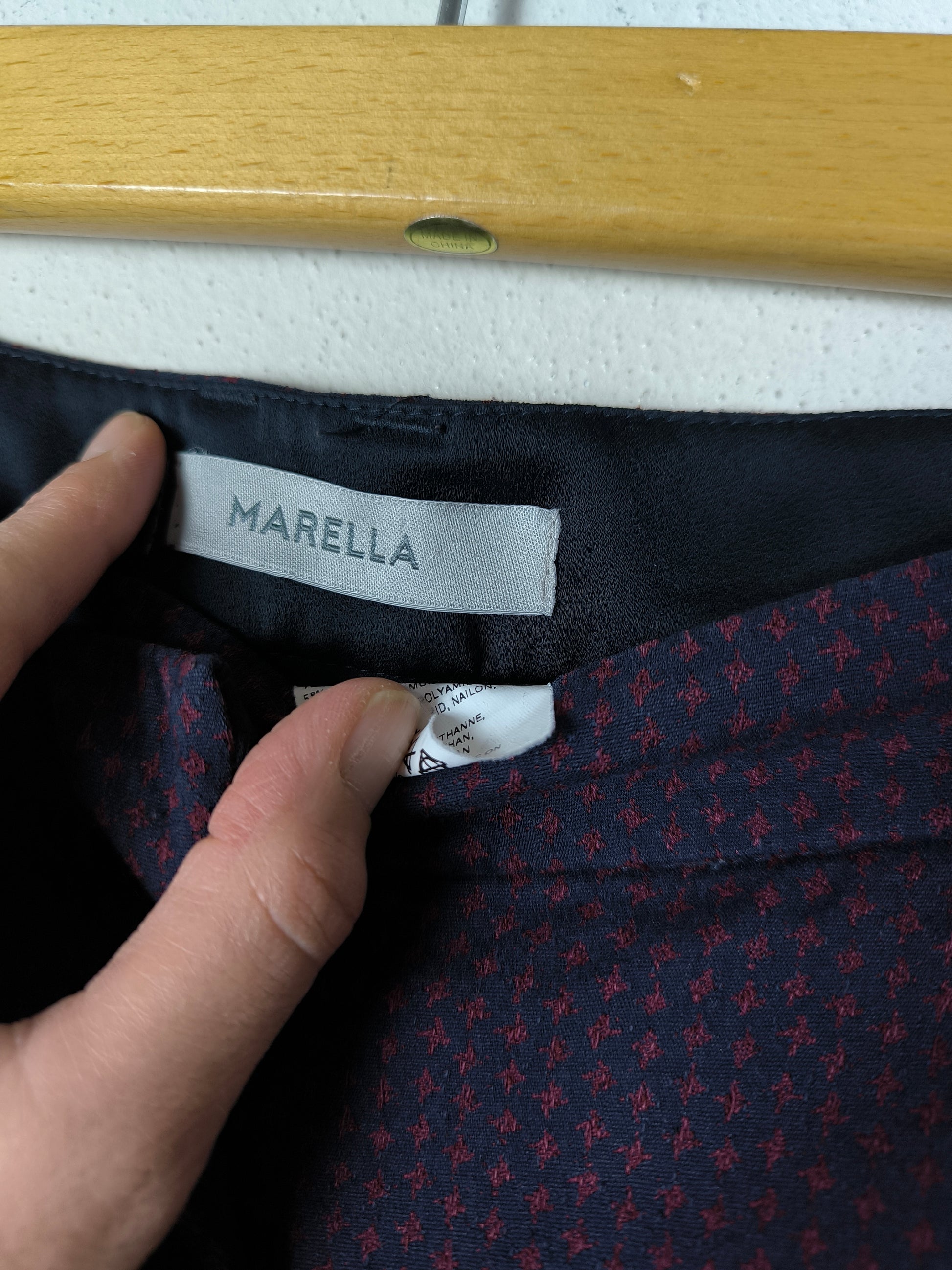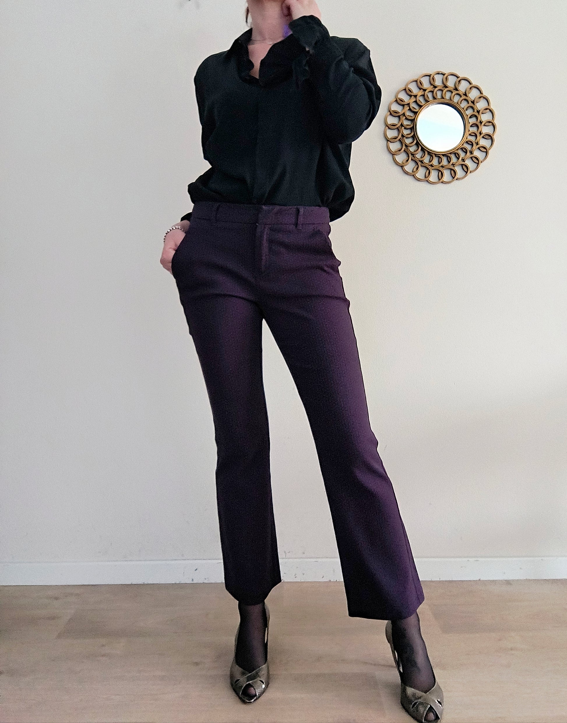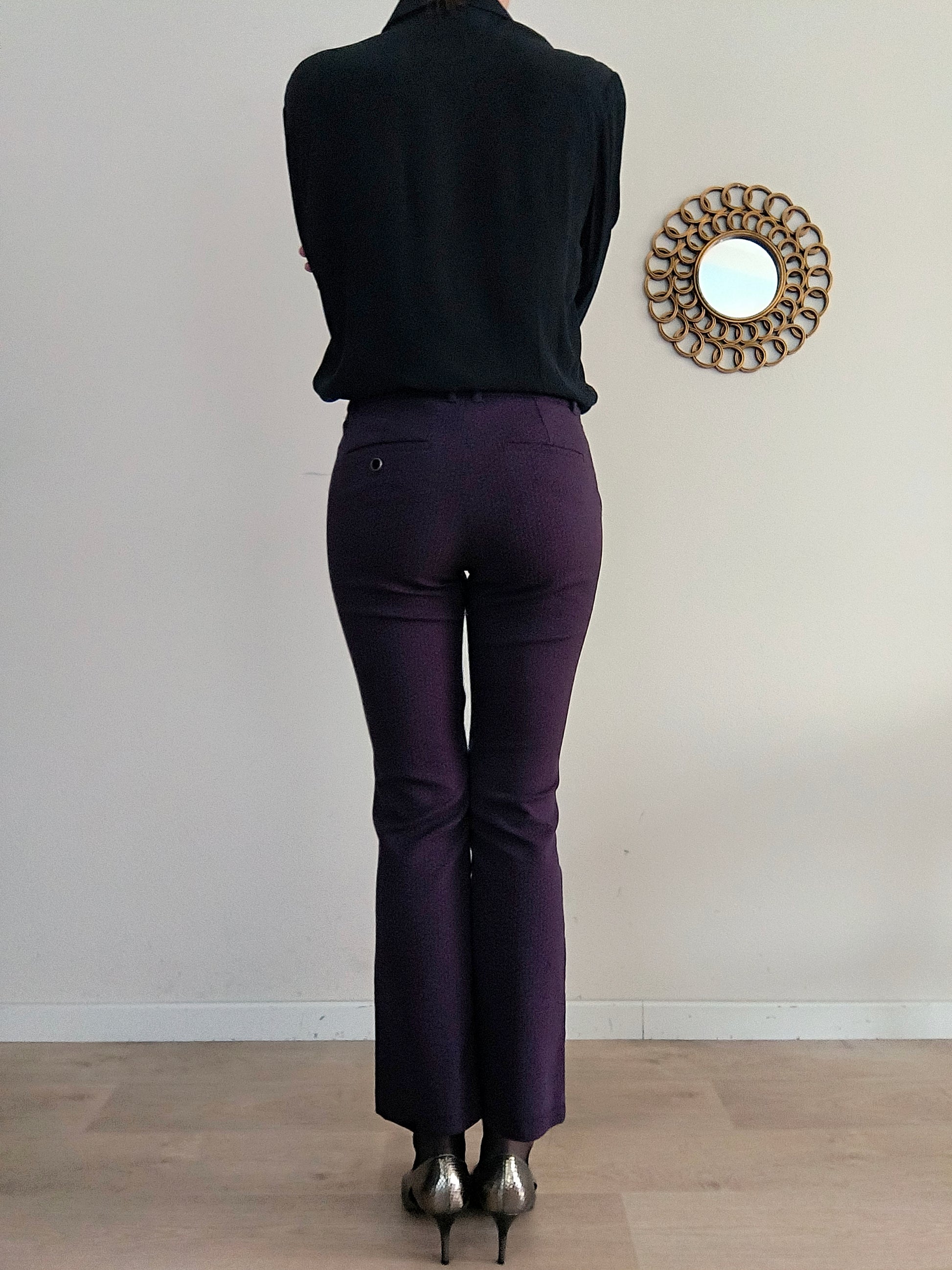 Pantalone Marella, colore blu puntinato in borgogna ( per questo dalle foto sembra melanzana. Ho fatto del mio meglio) vita media, linea leggermente flare.