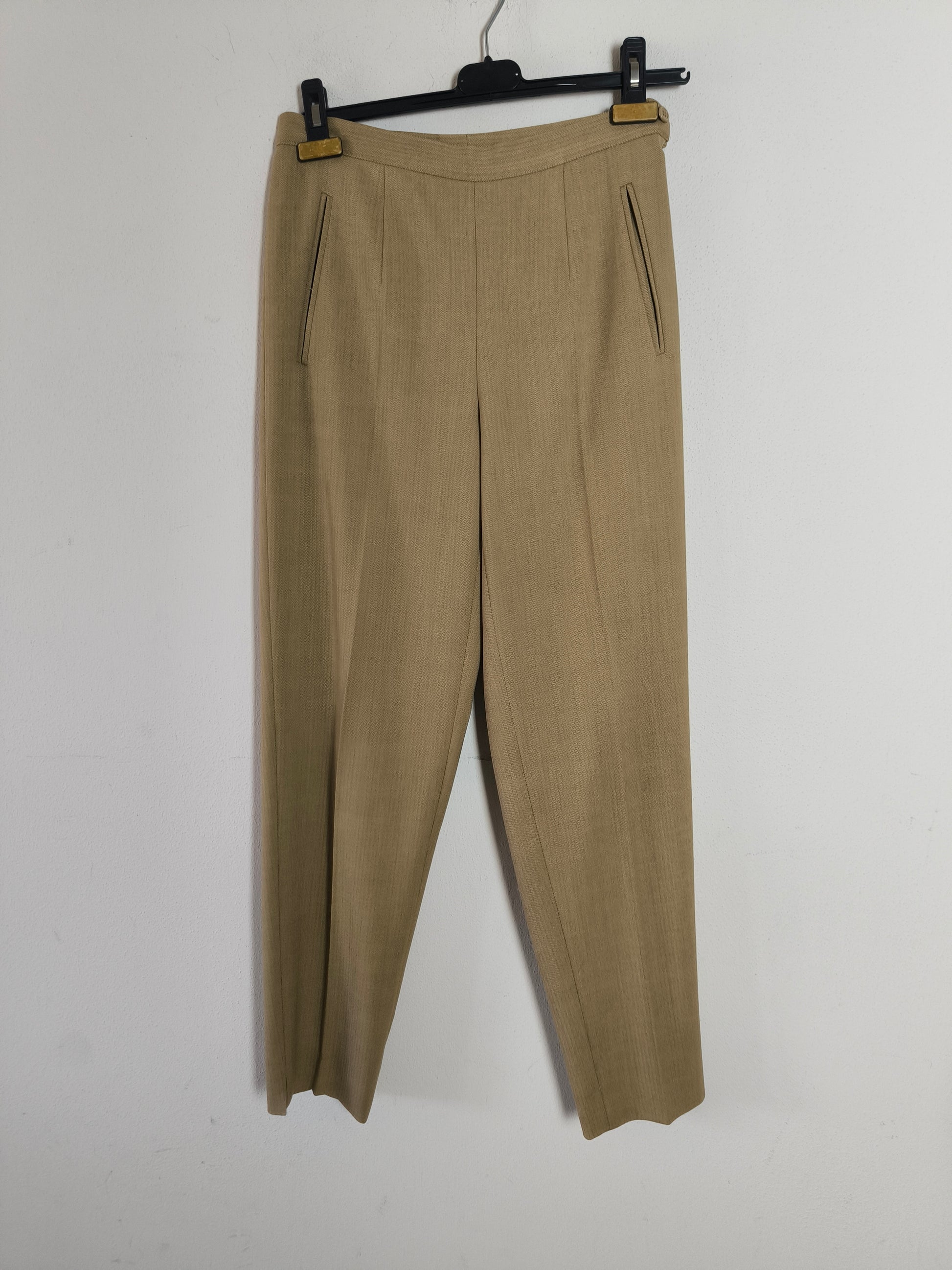 Pantalone MyTime, in color cammello, frescolana spinato, vita alta, gamba dritta, spacchetti alla caviglia.