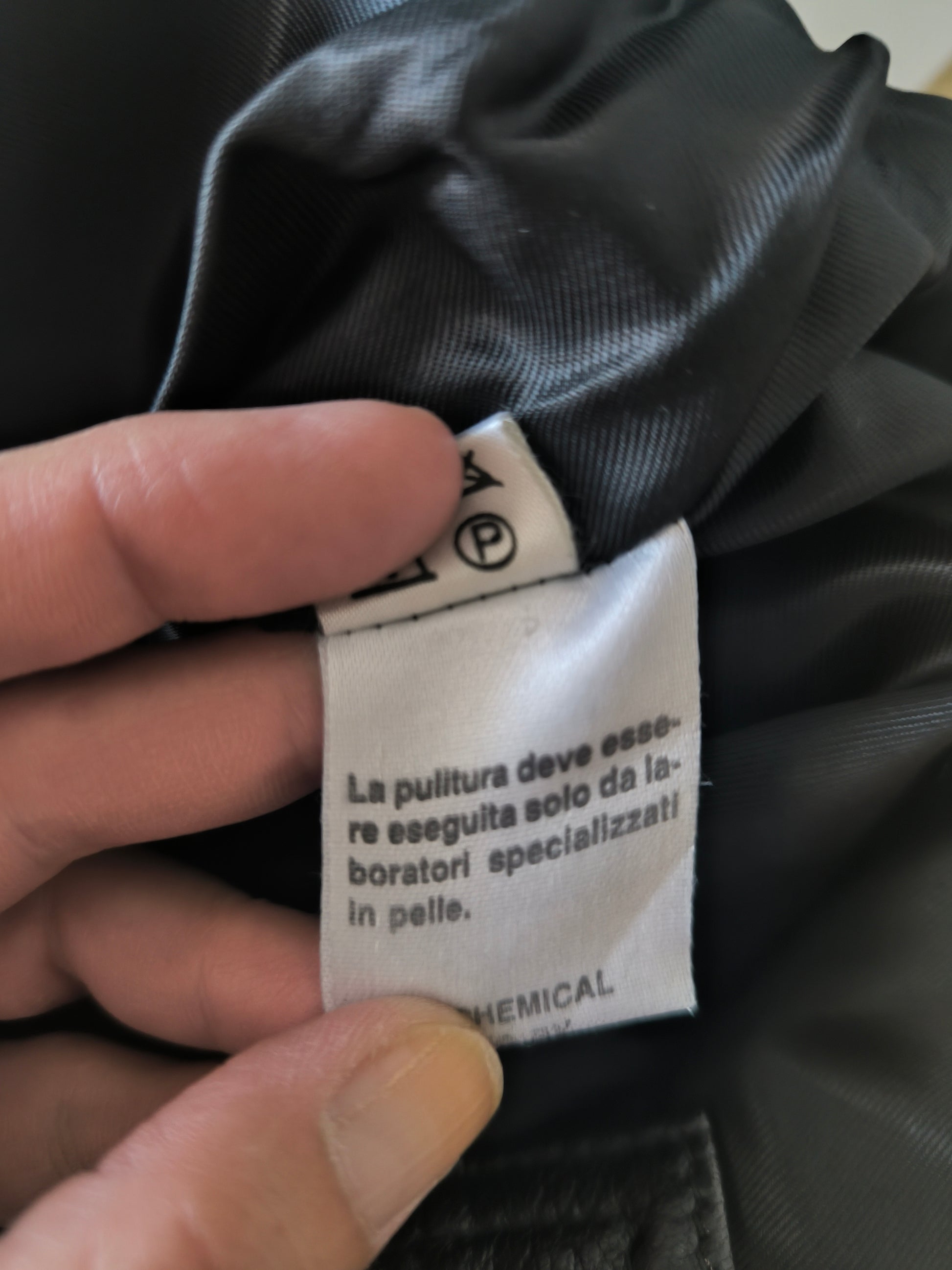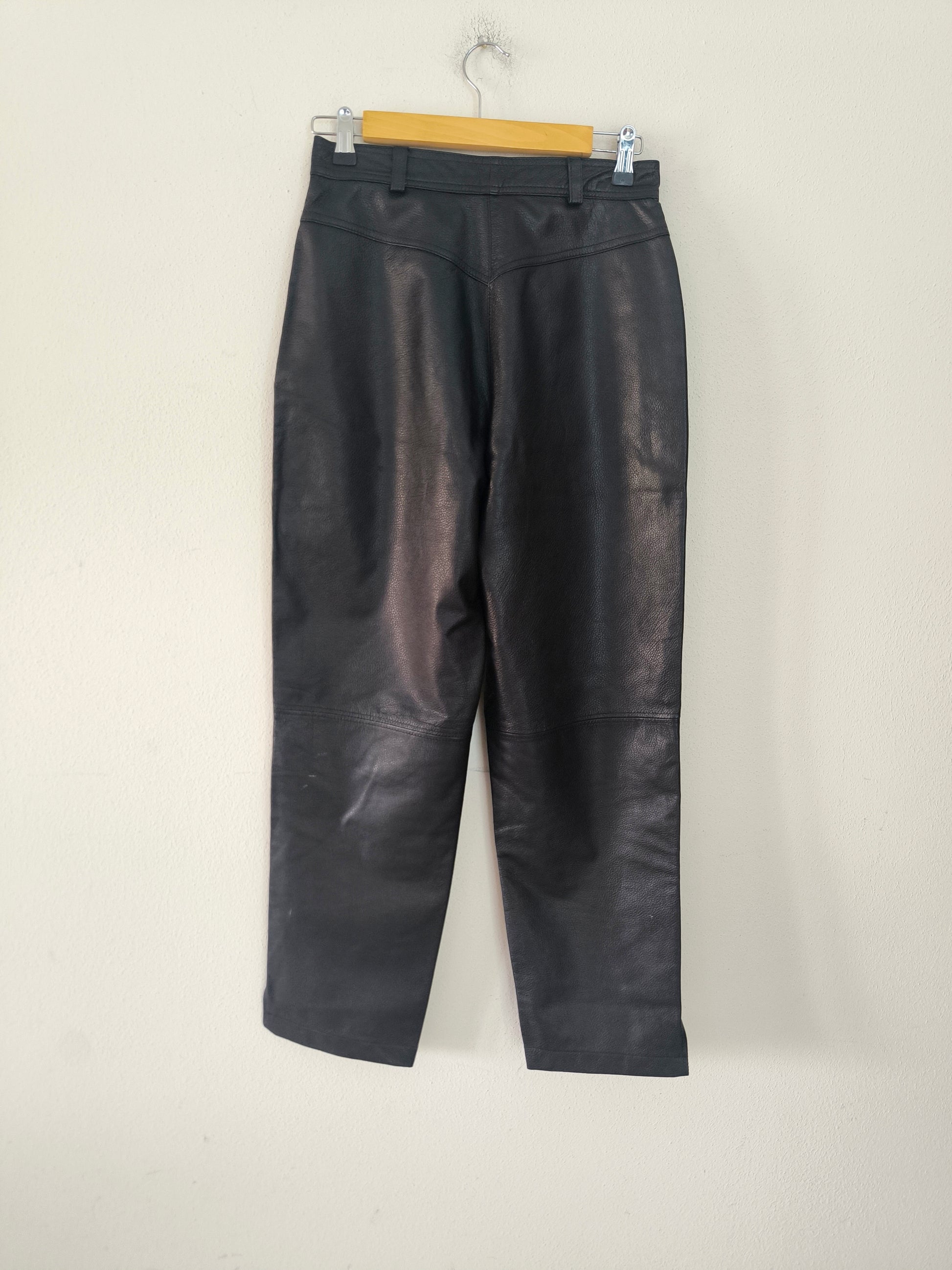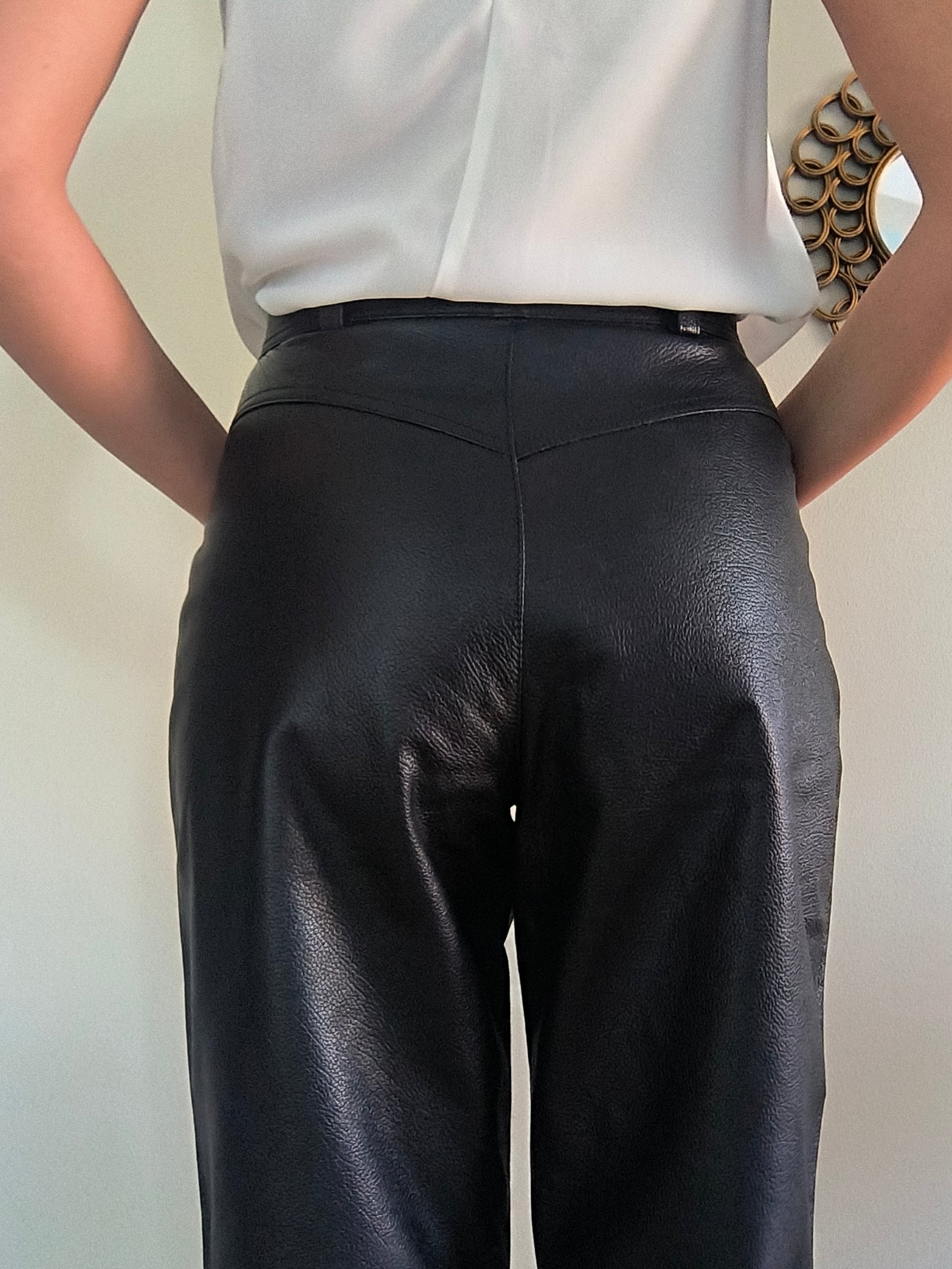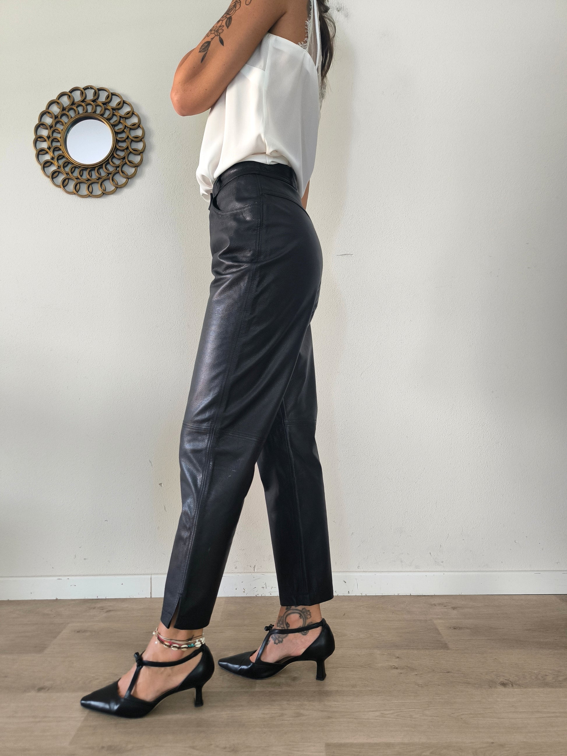 Pantalone vintage, in vera pelle nera, interno foderato, vita alta, gamba ampia che stringe leggermente verso l'orlo ha con piccolo spacco laterale alla caviglia.